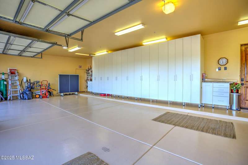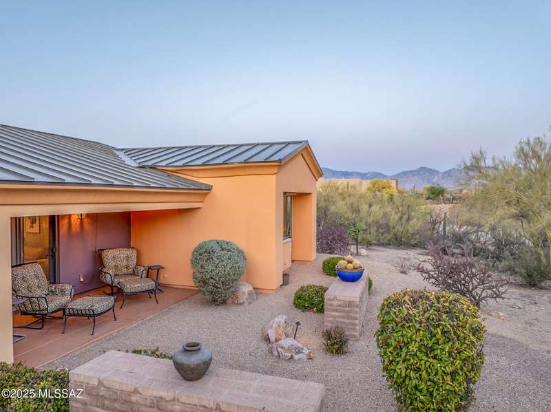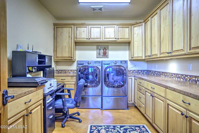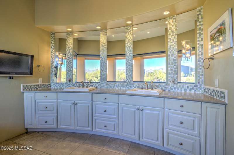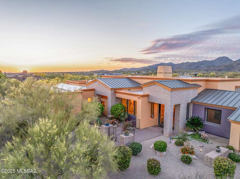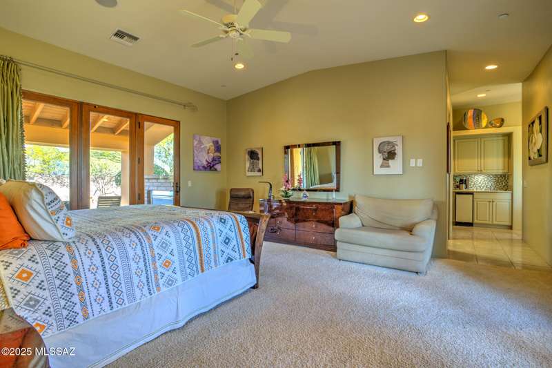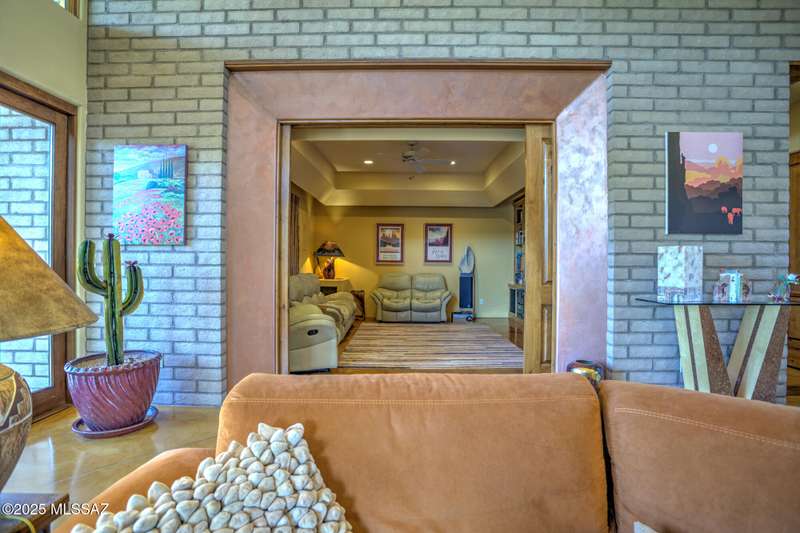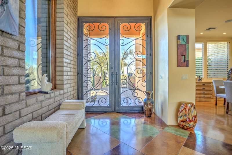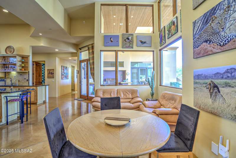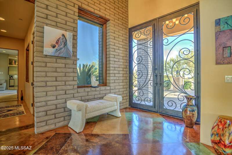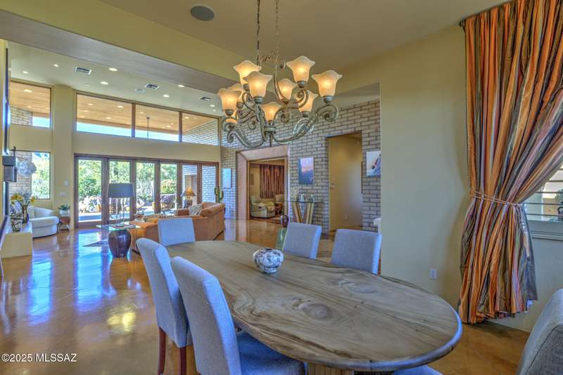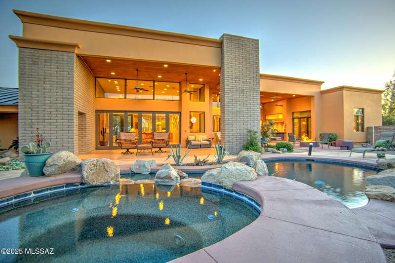 This stunning warm contemporary home effortlessly blends dramatic design with functional elegance. Soaring ceilings and walls of glass flood the interior with natural light, while rich scored concrete floors and striking brick accent walls add timeless character.The gourmet kitchen is a chef's dream, anchored by an oversized island with prep sink, dual dishwashers, two microwaves, and a walk-in pantry. The adjacent dining area features a built-in buffet perfect for entertaining. A spacious media room with custom cabinetry offers the ideal space for movie nights or quiet relaxation. Each ensuite bedroom has direct patio access The luxurious primary suite is a true retreat, boasting a coffee bar, spa-inspired bath, private patio, and a custom walk-in closet with built-in