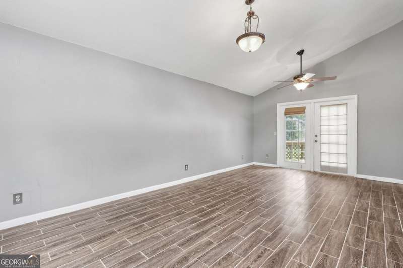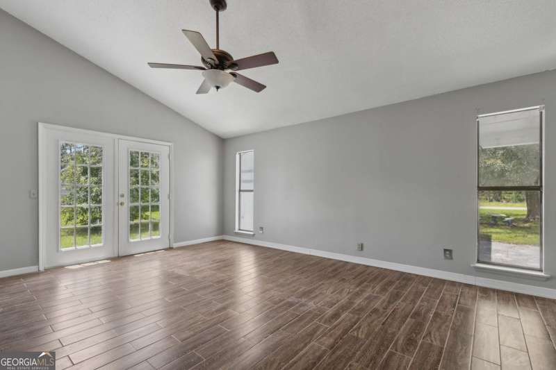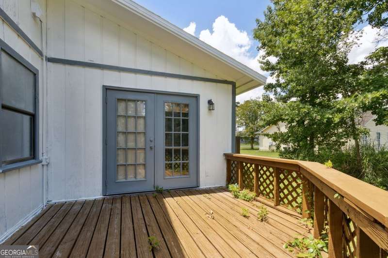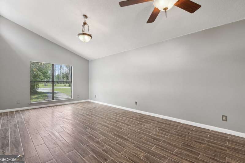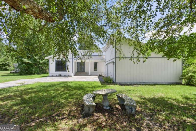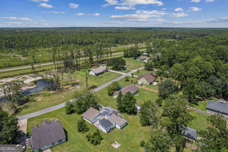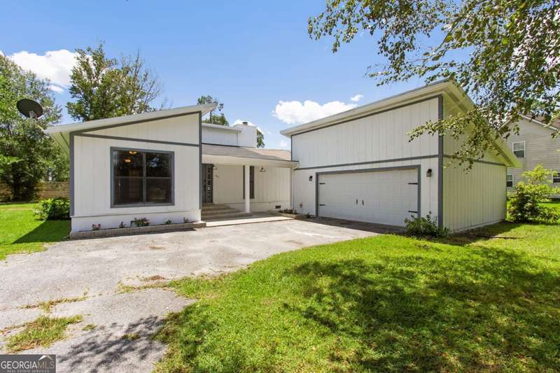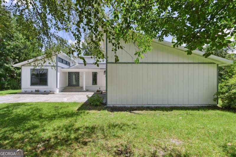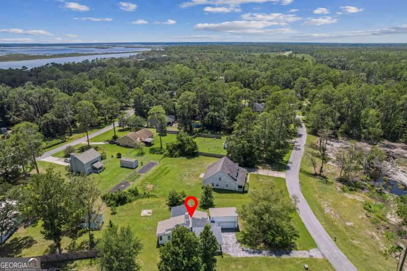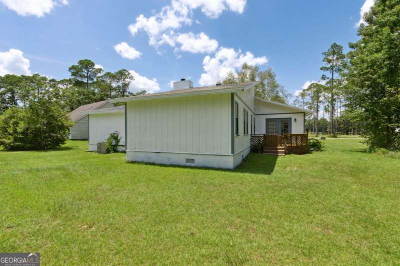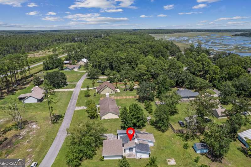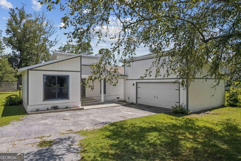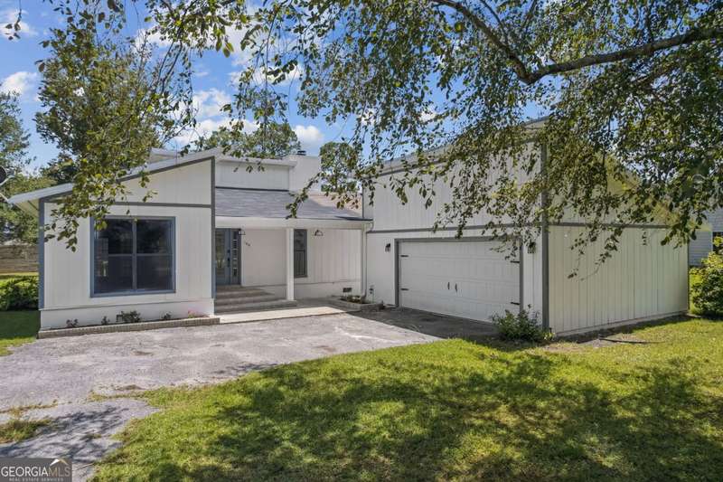 This one-of-a-kind lean-to style home showcases unique architectural character and a smart, functional interior layout. A spacious front porch welcomes you, along with a detached two-car garage offering plenty of storage and parking. Step inside to a semi-open floor plan featuring two flexible living areas that can be used as a living room, family room, dining area, media space - or whatever suits your lifestyle. High-set windows bring in beautiful natural light while maintaining your privacy. The home features wood-look tile flooring in the living areas and kitchen, with laminate in the bedrooms. The primary suite includes a private en suite with a tiled shower. Enjoy cozy evenings by the wood-burning fireplace in the living room. The kitchen is well-appointed with stainless steel/black appliances and solid surface countertops. Located just minutes from the public boat ramp and outside city limits - enjoy the benefits of no city taxes while staying close to everything you need.