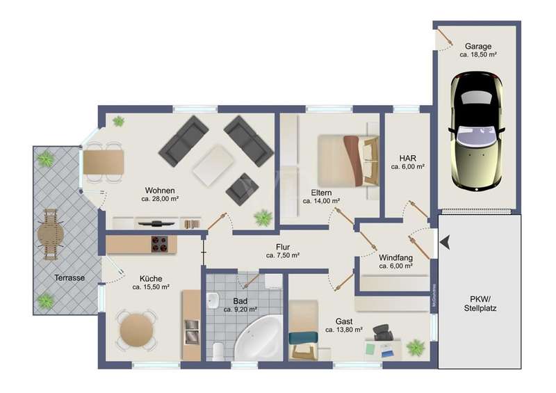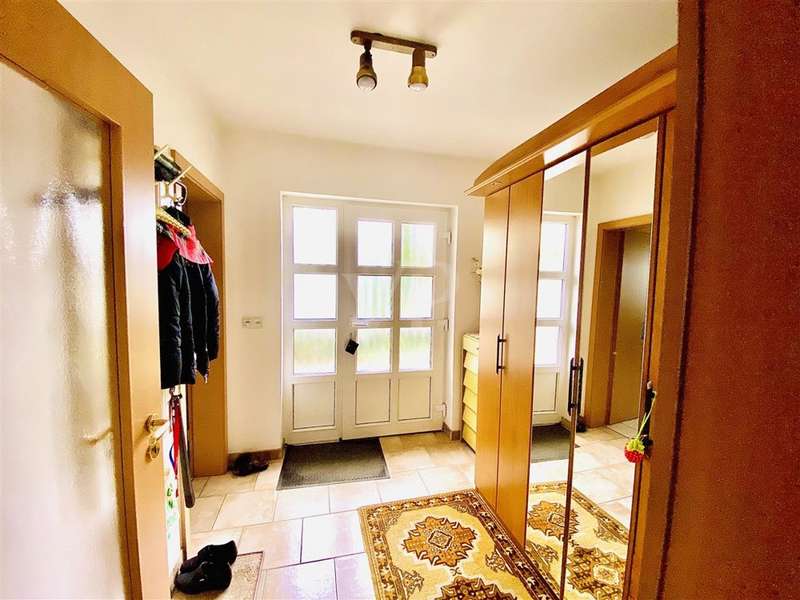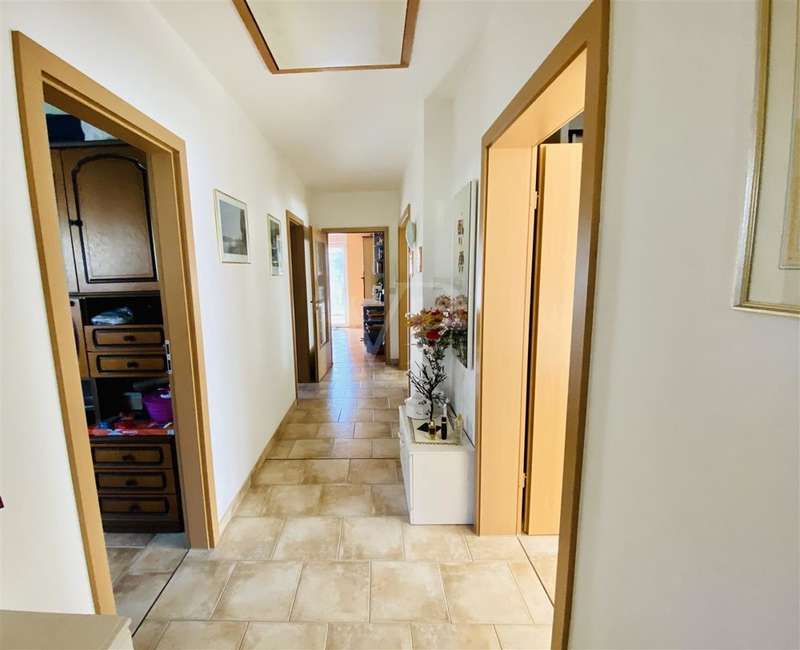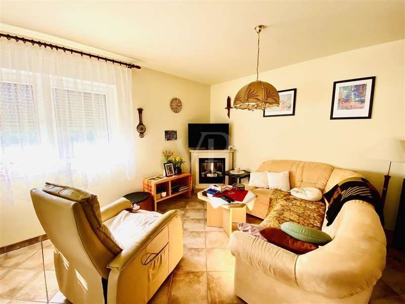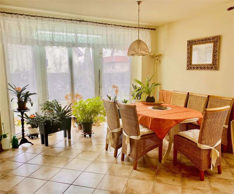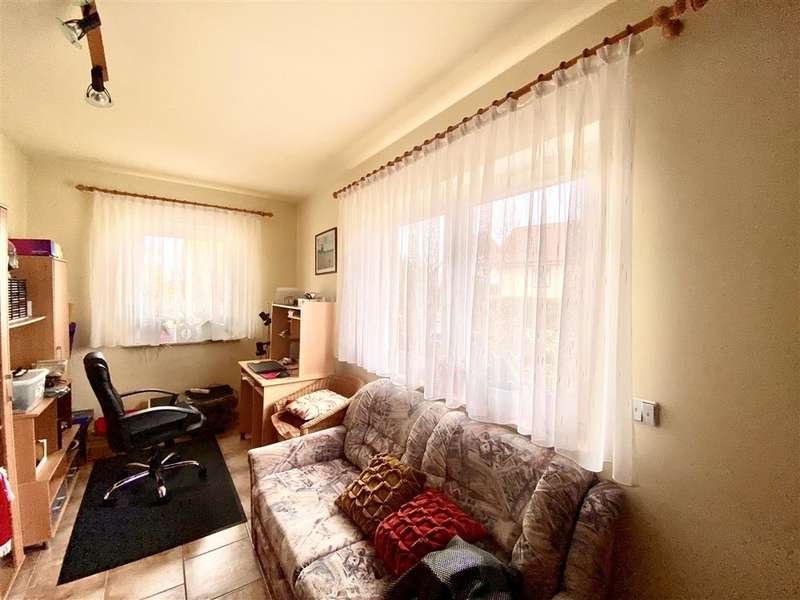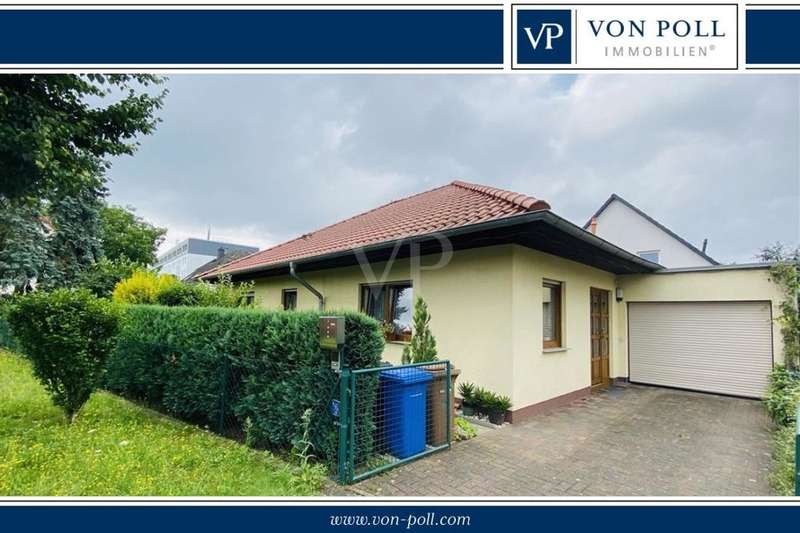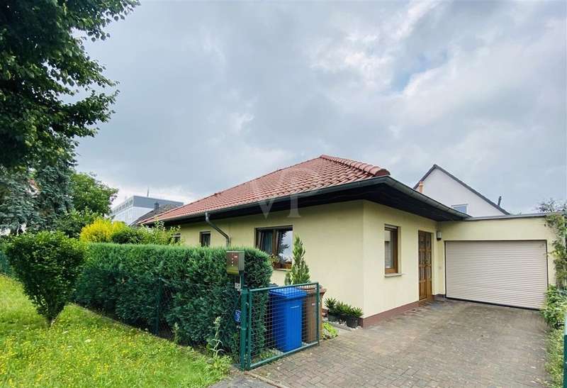 If you are looking for a solid investment opportunity today and would like to enjoy your retirement on the green edge of the capital, then this property is just right for you. The bungalow we offer you was planned in 2003 in massive construction and under the aspect of senior suitability by the current resident, for whom a registered right of residence exists. Through the side entrance you enter a small hallway with access to the utility room. From the adjoining hallway you reach the small study or guest room, the larger bedroom, the shower / bath as well as the kitchen and the living room barrier-free. From the living room with a small bay window, but also the kitchen, you have direct access to the south-facing terrace thanks to floor-to-ceiling windows, where the sun shines all day long. If necessary, electric shutters and an awning provide shade. The small garden is lovingly landscaped, but easy to maintain. Space for a car offers the garage attached directly to the house, which is equipped with an electric roller door.