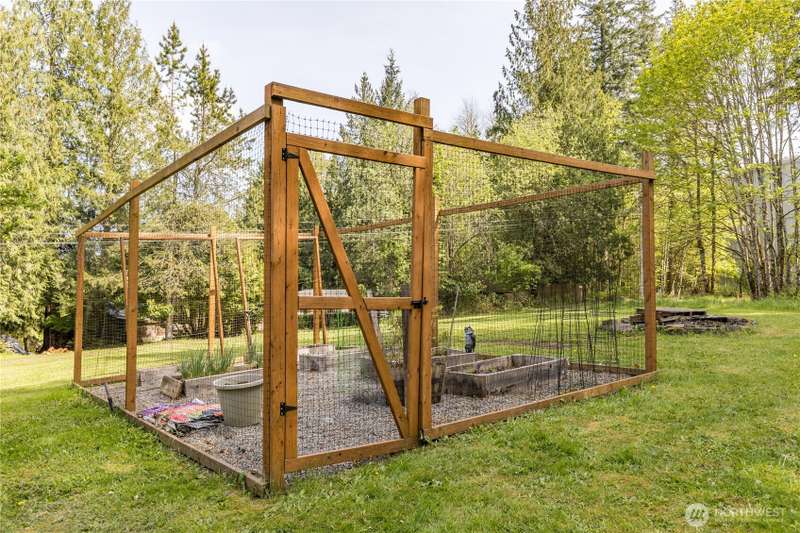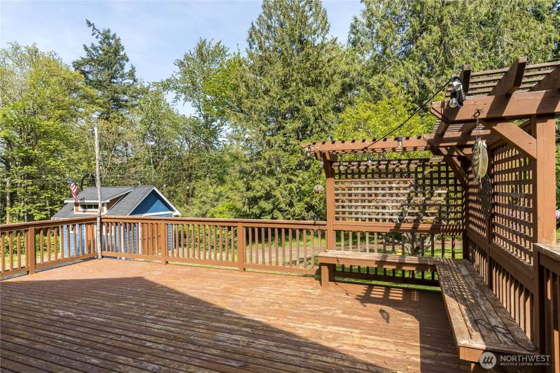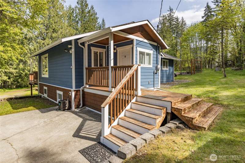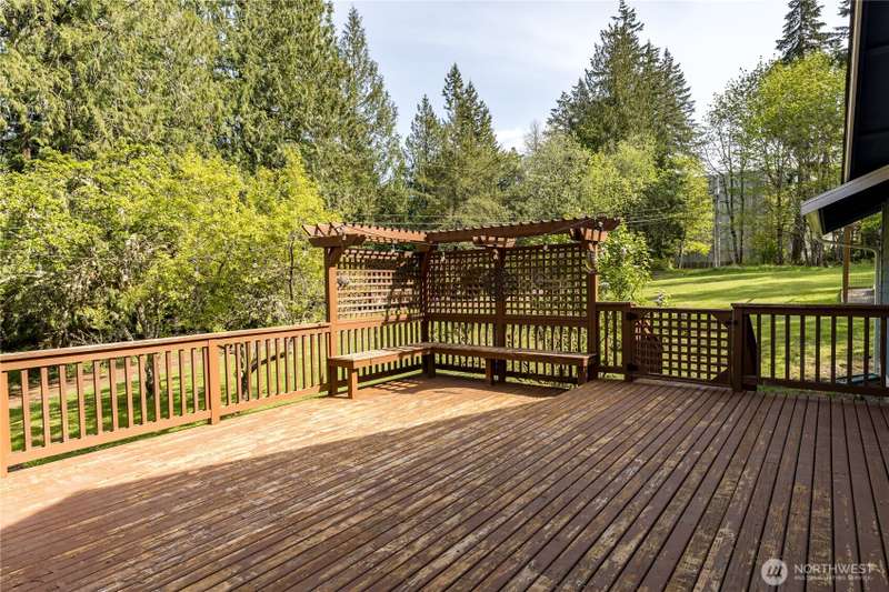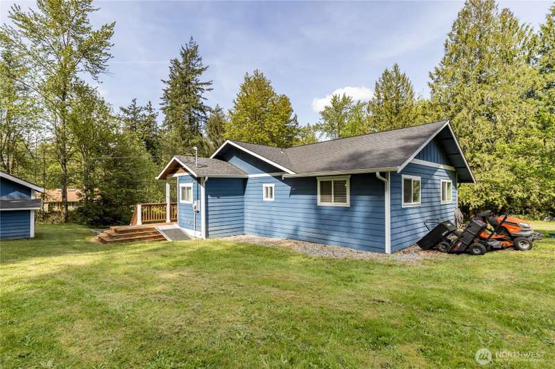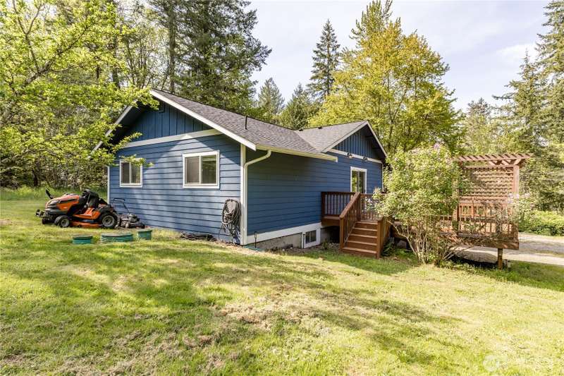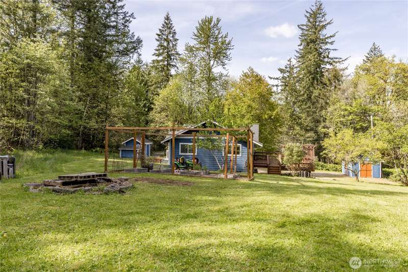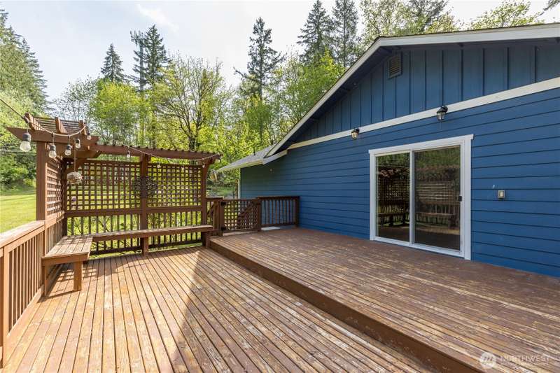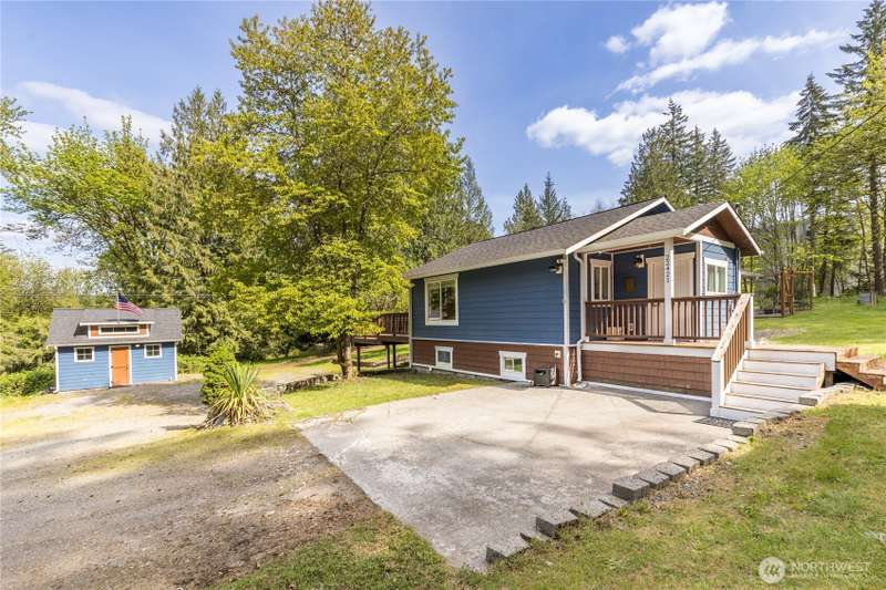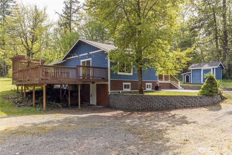 Enjoy the best of both worlds—peaceful seclusion on a shy acre, yet just minutes from town. This open-concept home features a spacious kitchen with white cabinetry and bamboo floors that flow through the living area, where a slider leads to an entertainment-sized deck with built-in benches. The primary suite includes an updated full bath with double sinks and stylish tile flooring & tub surround. The lower level offers a bonus room with built-in shelving, surround sound & half bath. Also downstairs are the 3rd bedroom, flex space, and laundry with exterior access. Enjoy a fenced garden area, fire pit, partial mountain view, garden shed and workshop/storage building with power. A serene, natural setting perfect for relaxing or entertaining!