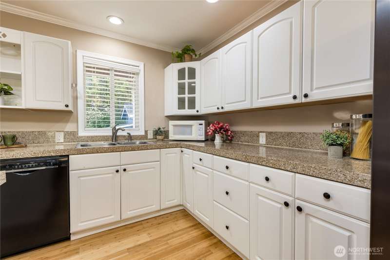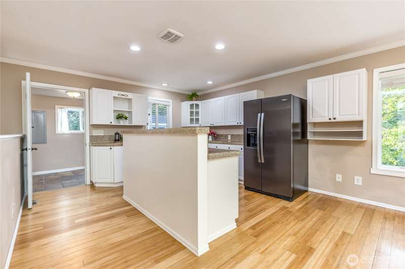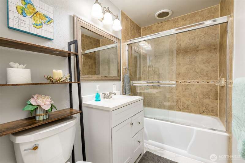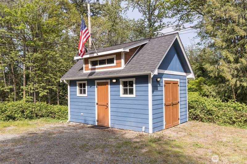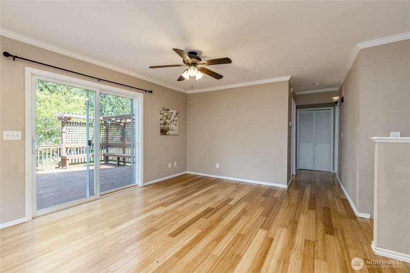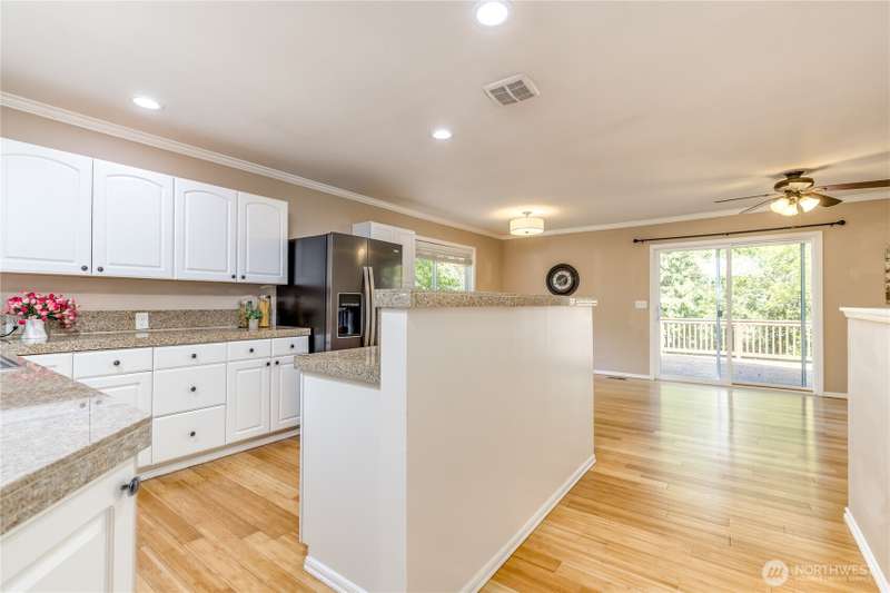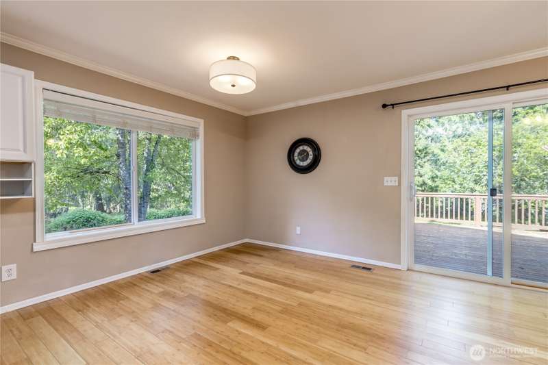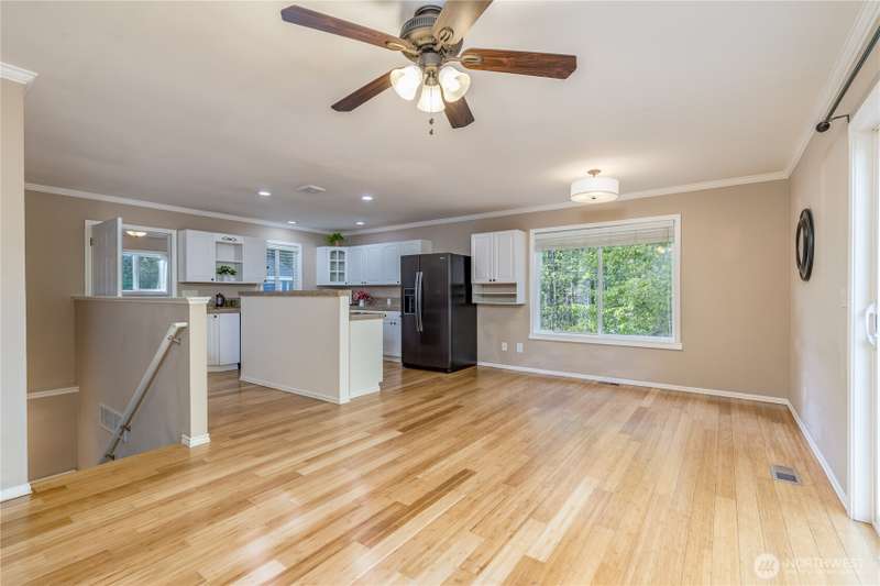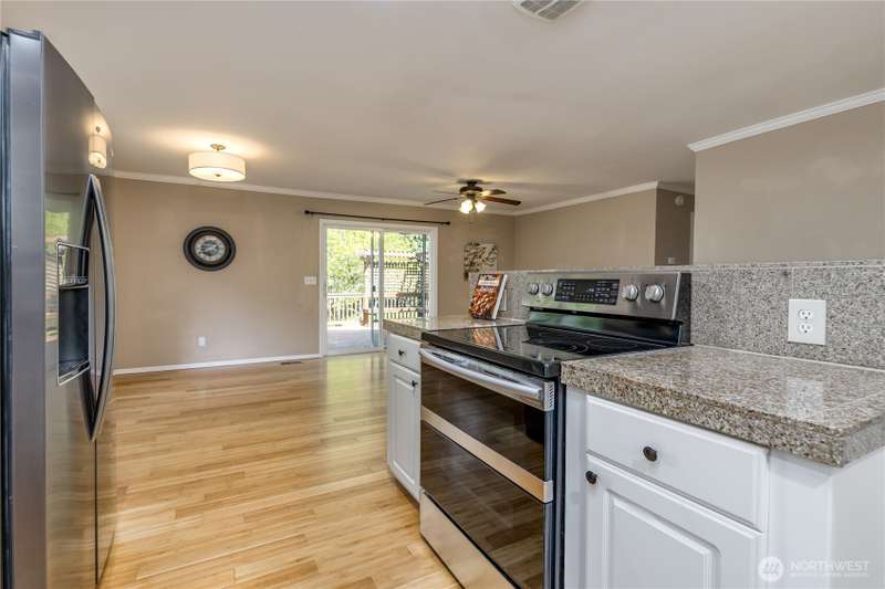 Enjoy the best of both worlds—peaceful seclusion on a shy acre, yet just minutes from town. This open-concept home features a spacious kitchen with white cabinetry and bamboo floors that flow through the living area, where a slider leads to an entertainment-sized deck with built-in benches. The primary suite includes an updated full bath with double sinks and stylish tile flooring & tub surround. The lower level offers a bonus room with built-in shelving, surround sound & half bath. Also downstairs are the 3rd bedroom, flex space, and laundry with exterior access. Enjoy a fenced garden area, fire pit, partial mountain view, garden shed and workshop/storage building with power. A serene, natural setting perfect for relaxing or entertaining!