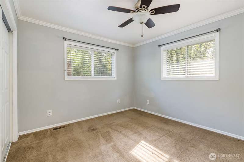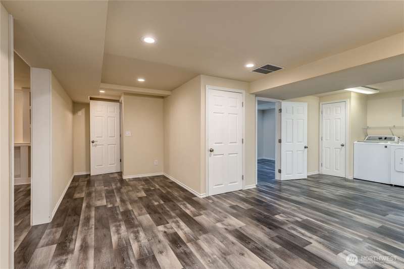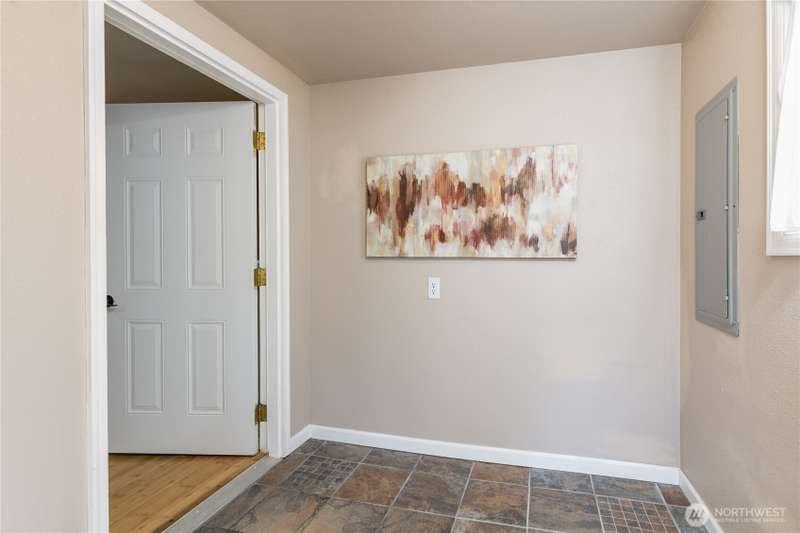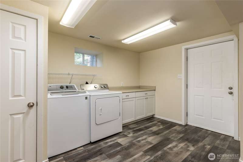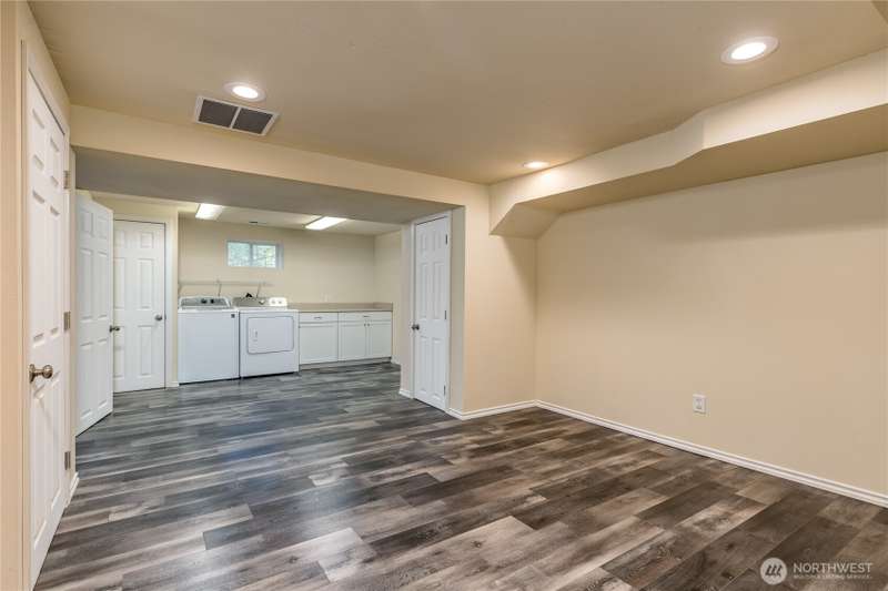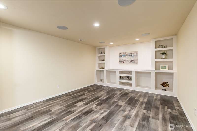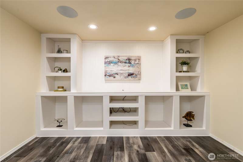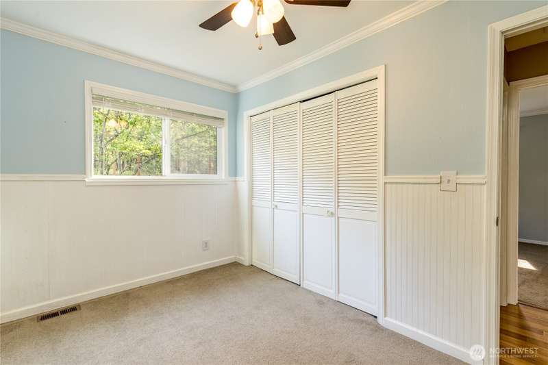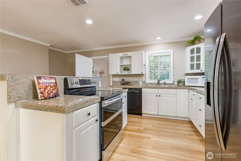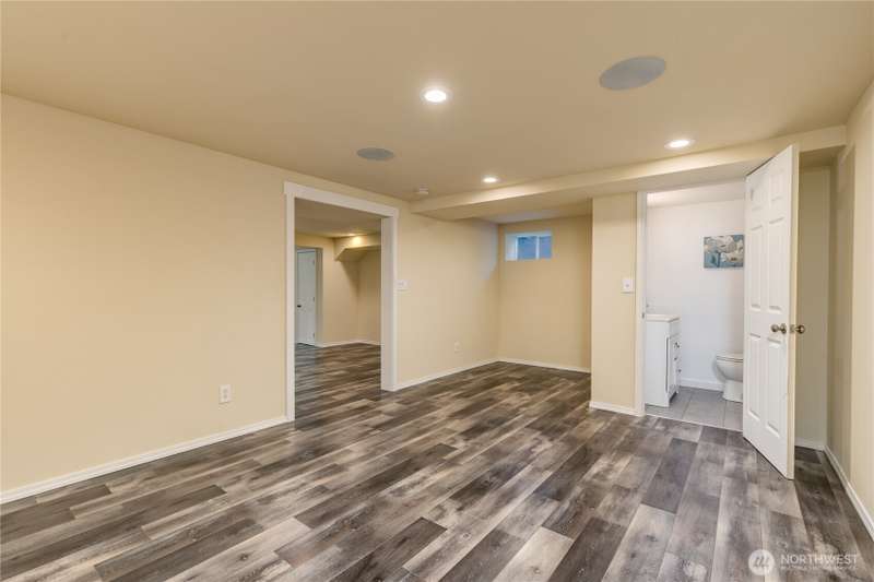 Enjoy the best of both worlds—peaceful seclusion on a shy acre, yet just minutes from town. This open-concept home features a spacious kitchen with white cabinetry and bamboo floors that flow through the living area, where a slider leads to an entertainment-sized deck with built-in benches. The primary suite includes an updated full bath with double sinks and stylish tile flooring & tub surround. The lower level offers a bonus room with built-in shelving, surround sound & half bath. Also downstairs are the 3rd bedroom, flex space, and laundry with exterior access. Enjoy a fenced garden area, fire pit, partial mountain view, garden shed and workshop/storage building with power. A serene, natural setting perfect for relaxing or entertaining!