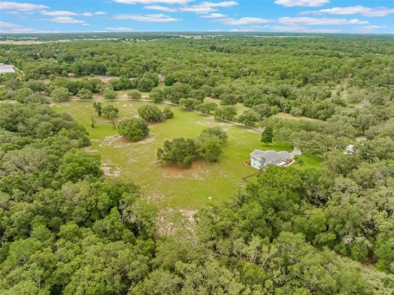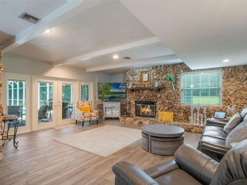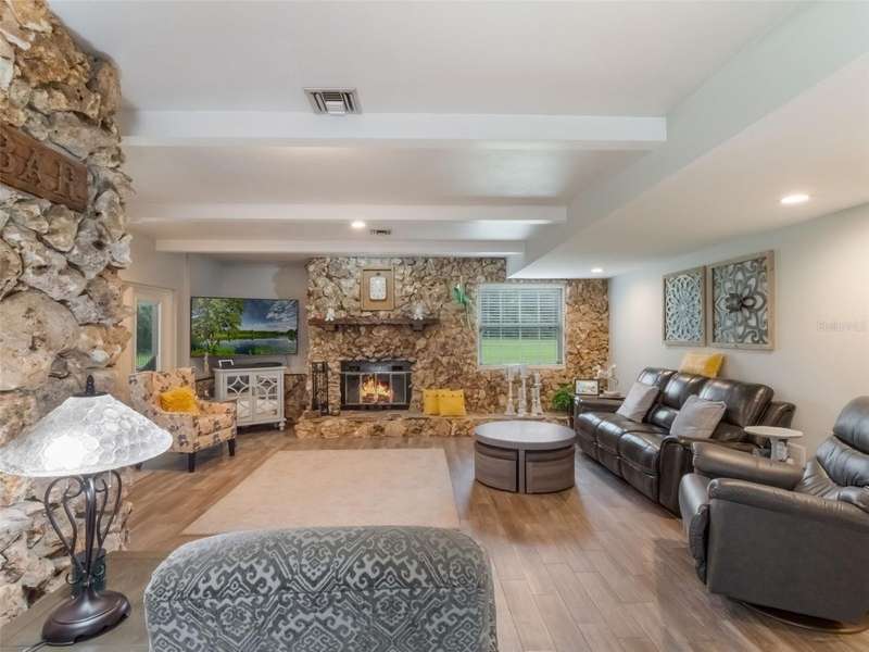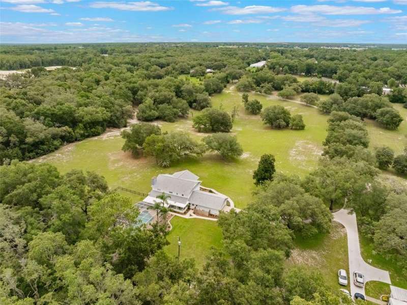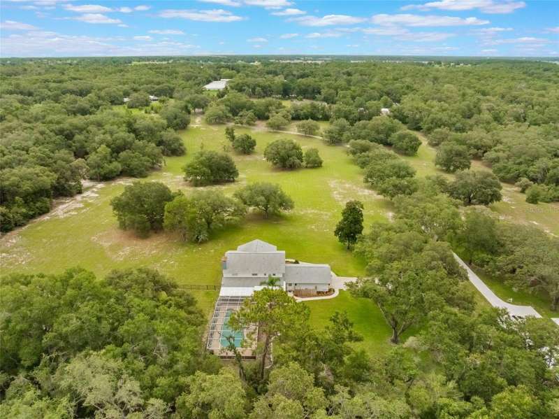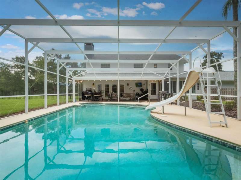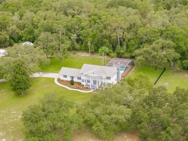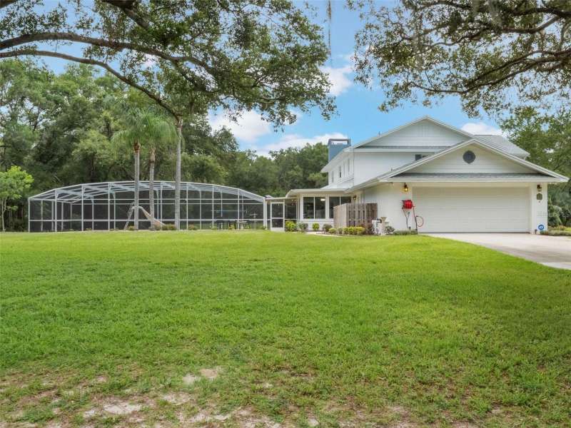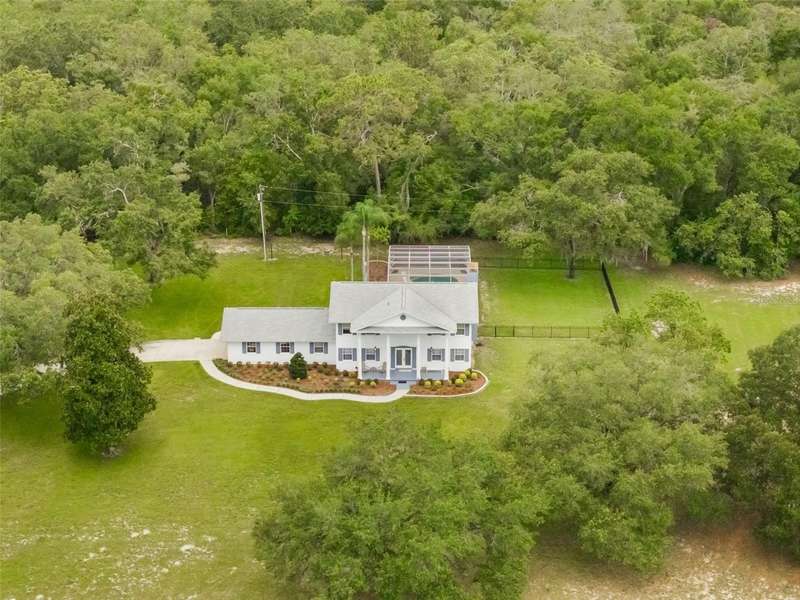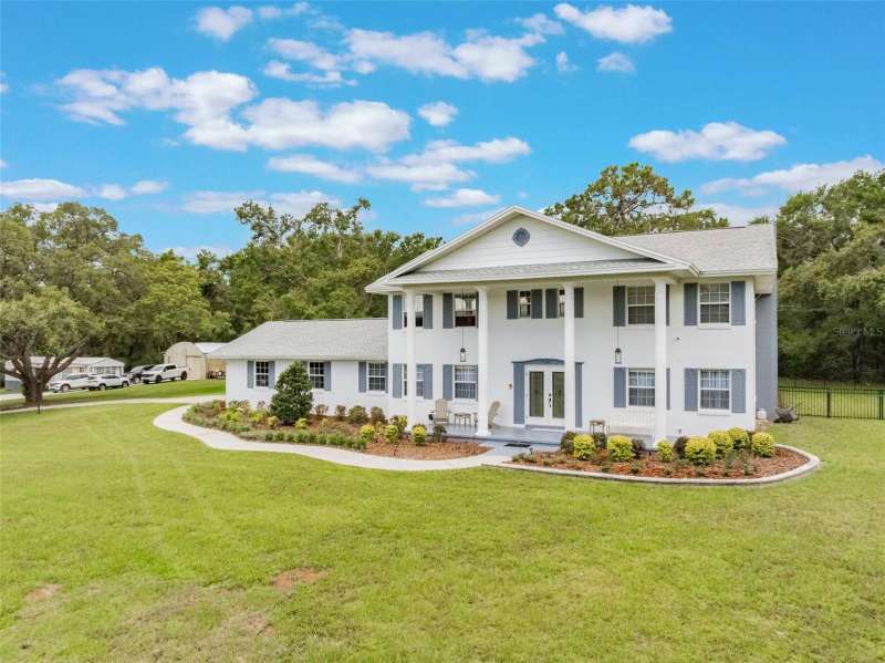 Under contract-accepting backup offers. Set atop a gently sloping hill, surrounded by nearly 17 acres of manicured, tree-canopied landscape, this stately Colonial estate invites you into a world of peace, privacy, and timeless elegance—just minutes from the charm of downtown Mount Dora and the convenience of the 429 exchange. Lovingly cared for by the same owners for over four decades, the property showcases both classic craftsmanship and thoughtful modernization. The main residence features four spacious bedrooms and three-and-a-half baths, while a separate 3-bedroom, 2-bath in-law suite offers comfort and flexibility for multigenerational living or extended guests. Step inside to discover a freshly renovated interior where natural light flows through updated windows and across gleaming tile floors. The heart of the home—a beautifully remodeled open-concept kitchen—combines sophistication with functionality, perfect for everyday living and effortless entertaining. From the cozy family room with its wood-burning fireplace and built-in wet bar to the inviting sunroom overlooking the grounds, each space invites you to slow down and savor the surroundings. Outside, a deep guinite pool with a slide and 9-foot end sits beneath a sprawling screened lanai—your own private resort. Beyond, automated irrigation spans over 3 acres of lush, irrigated greenery, making the outdoor spaces as turnkey as they are scenic. Additional highlights include a fenced dog park, dual A/C systems, updated roofing, motion-activated exterior lighting, formal living and dining rooms, and a grand front foyer that sets the tone from the moment you arrive.
