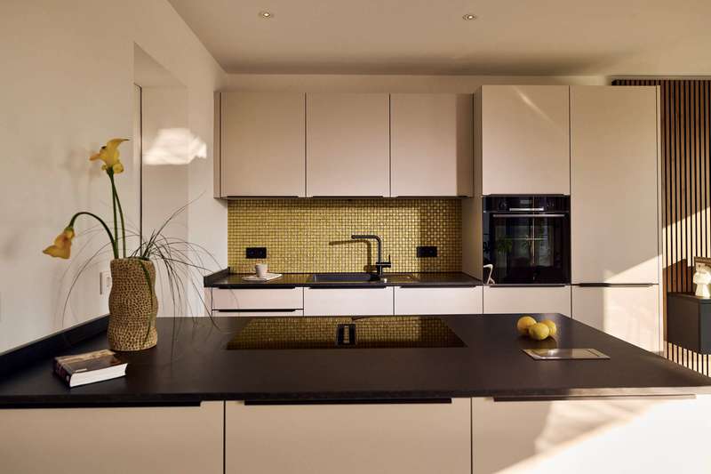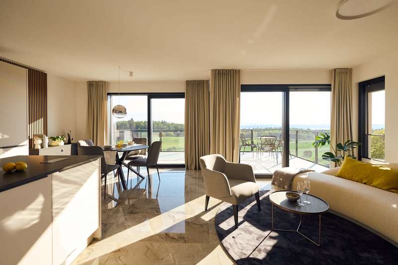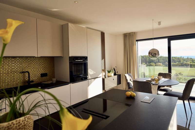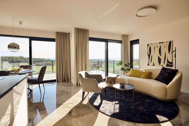In a prime location near Meersburg, an exclusive villa is being built with nine fully furnished luxury rental apartments that meet the highest living standards. Each unit combines stylish interiors with state-of-the-art equipment and a well thought-out room concept. High-quality materials, elegant design and spacious layouts create a living ambience in a class of its own. This high-quality furnished apartment offers an elegant living ambience with a checkroom in the entrance area, spacious living room with designer sofa, armchair, TV lowboard and round real wood dining table for 6 people. The modern fitted kitchen has natural stone worktops, induction hob with integrated fan, high-built oven, dishwasher, quartzite sink and mosaic tiles as splash protection. Two bedrooms with box-spring double beds, fitted wardrobes and desks offer maximum comfort. Bathroom with bathtub, walk-in shower with real glass, countertop washbasin and stainless steel-look fittings, plus separate guest WC. A utility room with washing machine and dryer as well as well thought-out lighting round off the offer.