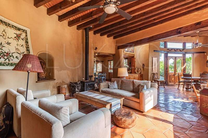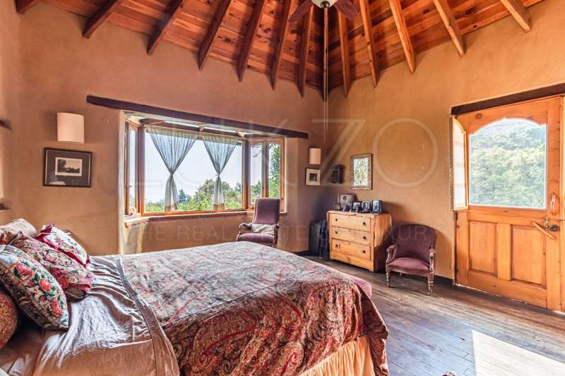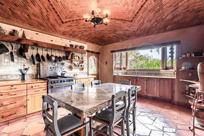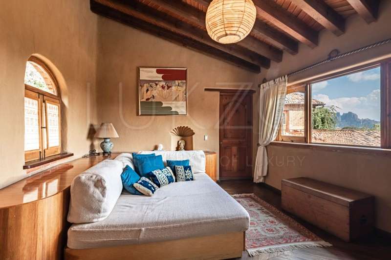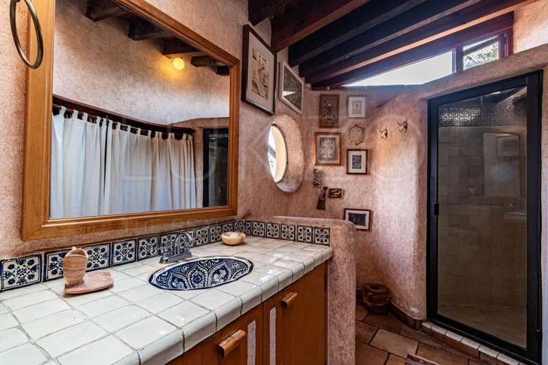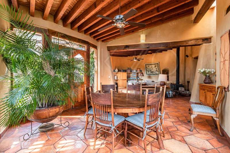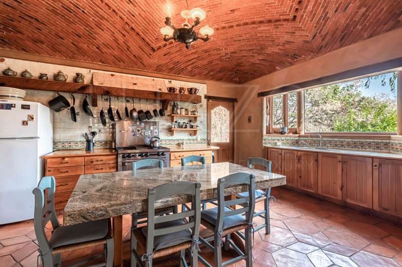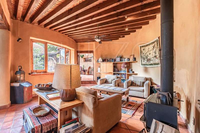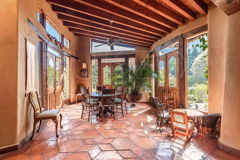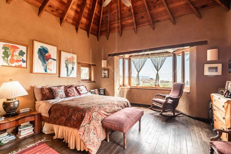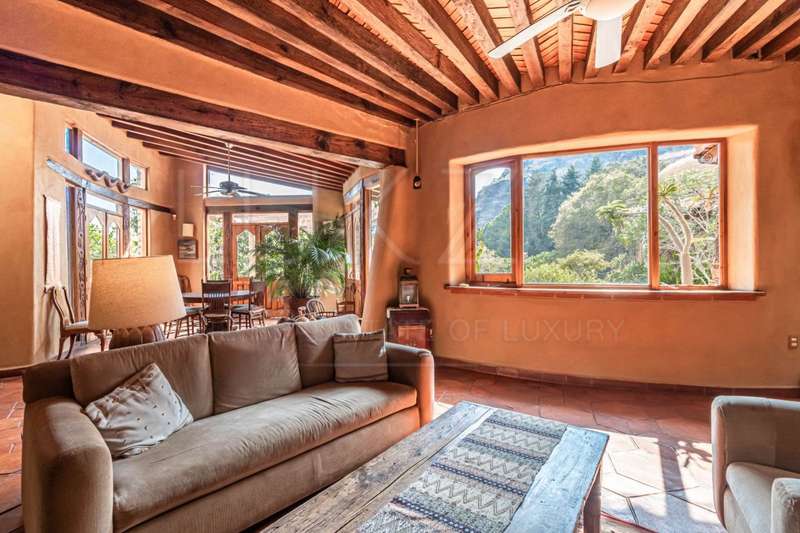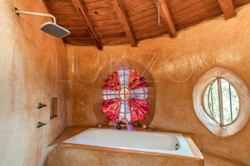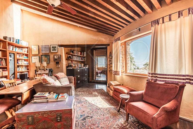 Designed by Mexican architect Michel Lewis, the house is built from local stone and adobe, with high ceilings, wooden beams, and views in all directions. Built in a distinctive half-moon shape, the home has three bedrooms, three bathrooms, a living room, dining room, office and kitchen. The floors are traditional tiles or wood.