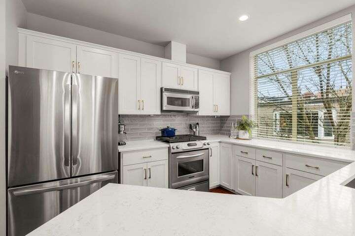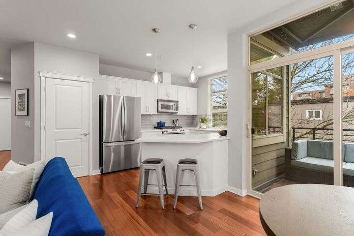 Experience sophisticated urban living at the timeless Abbey Condominiums, perfectly perched at the top of Queen Anne. This spacious 1BR/1BA home is filled with natural light and features a private deck off the living room. The brand-new chef’s kitchen with quartz countertops and stainless appliances flows to open living and dining areas, ideal for entertaining. The bedroom suite includes a walk-in closet, and a nearby nook offers the perfect office space. Enjoy in-unit laundry, garage parking with Level 1 EV charging, extra storage, and HOA dues covering nearly everything but electricity. The Abbey is a well-managed HOA with no pending assessments, all in a highly walkable location near Queen Anne Ave, SLU, parks, shops, and restaurants.