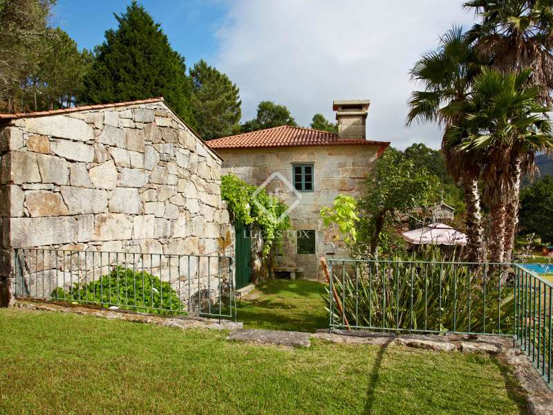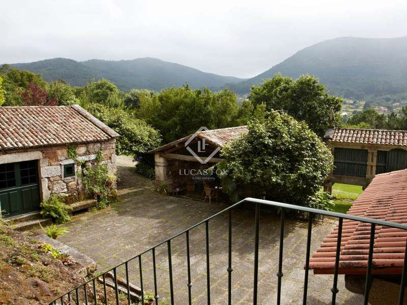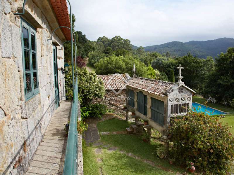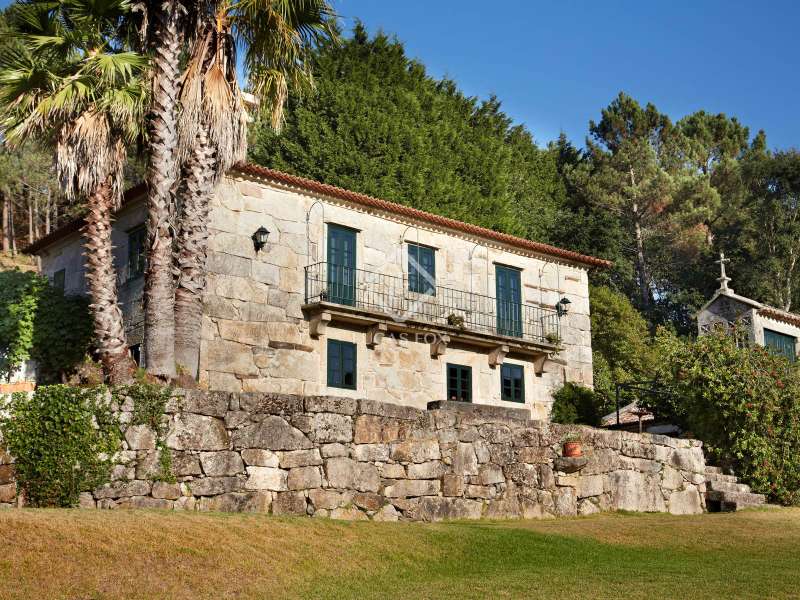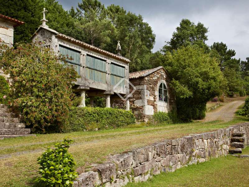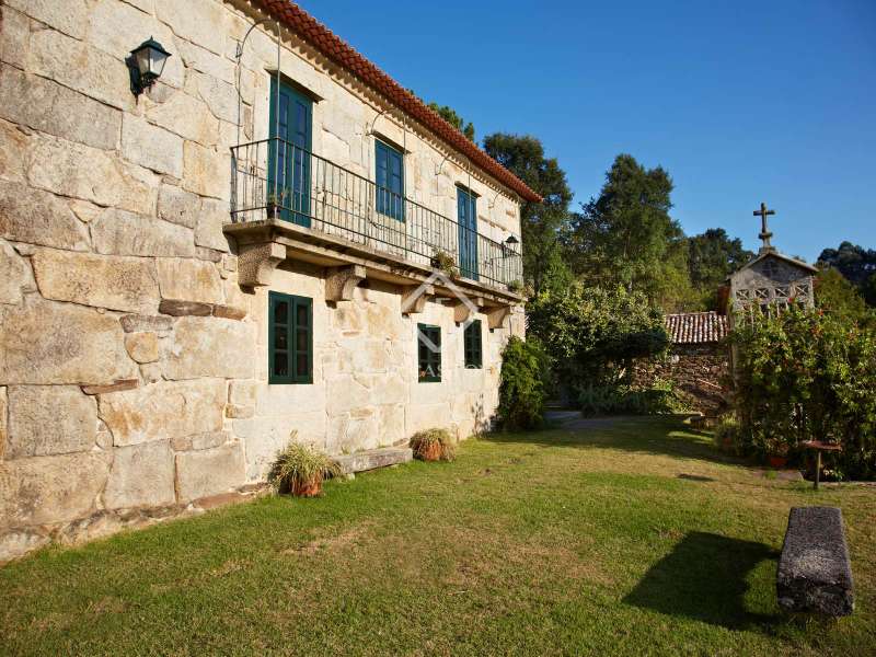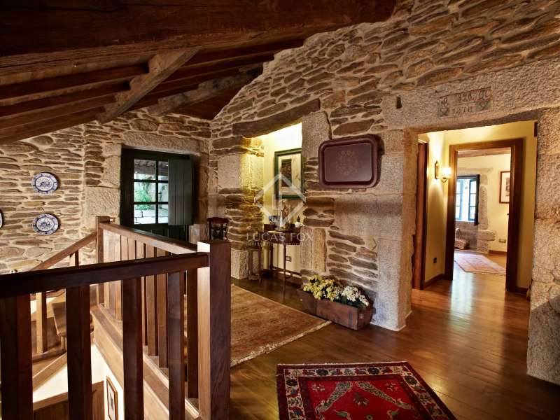 Inland in the Rias Baixas, a short distance to the Vigo Estuary, we find this special property with a lot of charm, character, and private land. The villa sits on two levels of space, offering lovely inner courtyards, good stone finished craftsmanship, well maintained carpentry and lovely mountain views. The villa and property date back top 1878, it has been completely restored with great attention to detail in 1996, adding all the necessary amenities for today’s requirements. The property continues to preserve its original charm. The property is situated in a peaceful, relaxed environment inland from the Baiona, Playa America beaches and the Nigran town centre. Once we arrive at the property, we are welcomed by the entrance gate, that gives us access to the property, and we proceed towards the entrance of the villa. Once inside the property, we find the mature grounds area, where there is a swimming pool section, a small horse stable area, garage for three cars, a well-kept chapel, two granaries, and the stone villa. From the garden area, we find stunning views of the hillside and mountains. The plot fully fenced and offers a plot size of 11,412 m². There is the potential to purchase more land if necessary. The property features its own natural water spring, which provide water to villa and the grounds. Once inside, we find the main entrance inner patio, finished with stonework, and which leads us to the reception hall of the villa. On the main floor, we find the living area, with an eat-in kitchen, the dining and living room with wood-burning fireplace. There is a guest toilet. On the first floor, we find the sleeping area. There is a main en-suite bedroom and three bedrooms with a shared bathroom. Two bedrooms offer balconies, overlooking the garden area, and have views of the mountain and the ocean. The finishes of the villa, offer good quality chestnut woodwork, with heated flooring and ceiling beams. Exposed stone offers the property a charming and rustic feel. Near the kitchen area, we find the inner patio, which offers access to the old wine cellar with features of the old used tools dating back to 1898. It has been converted into a barbecue section. There is a large outdoor enclosed dining area to enjoy with family and friends. The property would be ideal for a family or couple looking to enjoy the property with friends, family or just entertain. Also, for anyone looking to live in the relaxed environment and a short distance to Baiona marina.