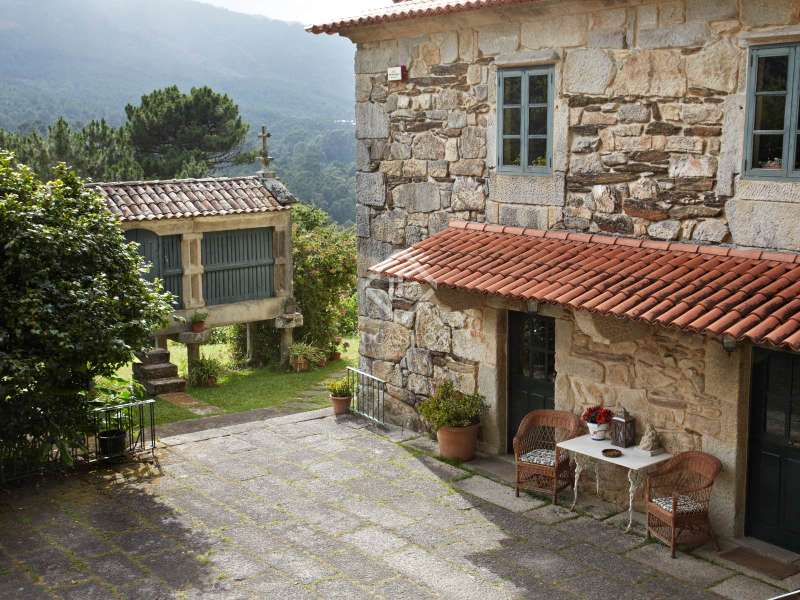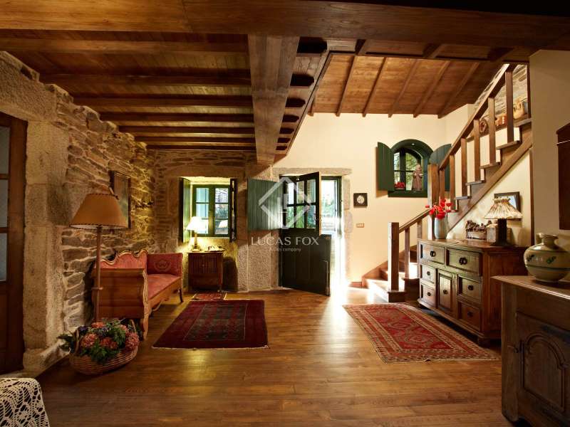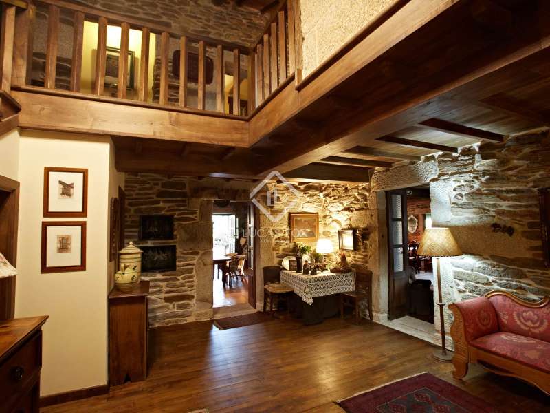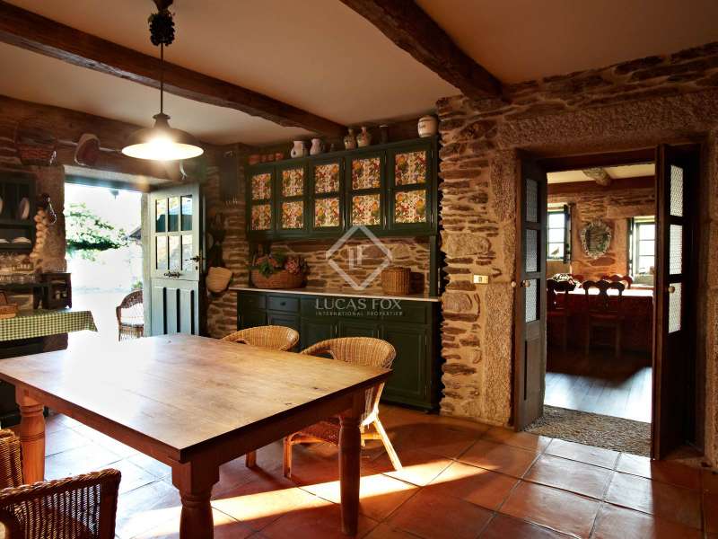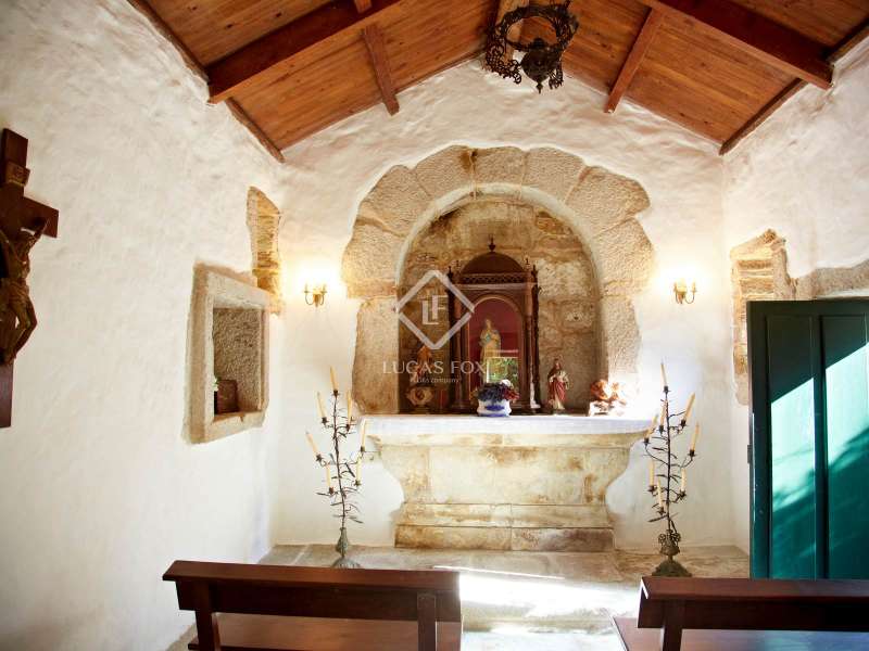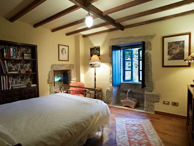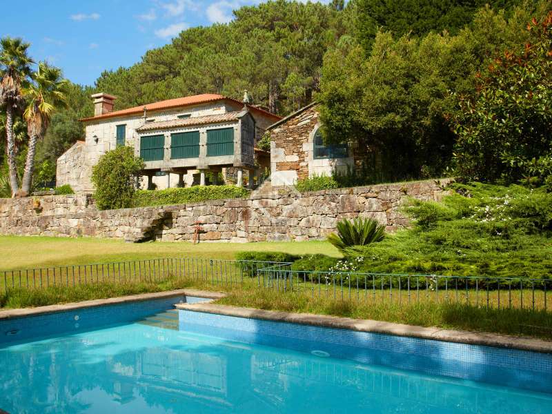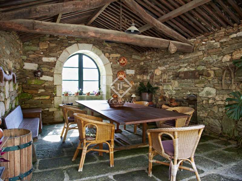 Inland in the Rias Baixas, a short distance to the Vigo Estuary, we find this special property with a lot of charm, character, and private land. The villa sits on two levels of space, offering lovely inner courtyards, good stone finished craftsmanship, well maintained carpentry and lovely mountain views. The villa and property date back top 1878, it has been completely restored with great attention to detail in 1996, adding all the necessary amenities for today’s requirements. The property continues to preserve its original charm. The property is situated in a peaceful, relaxed environment inland from the Baiona, Playa America beaches and the Nigran town centre. Once we arrive at the property, we are welcomed by the entrance gate, that gives us access to the property, and we proceed towards the entrance of the villa. Once inside the property, we find the mature grounds area, where there is a swimming pool section, a small horse stable area, garage for three cars, a well-kept chapel, two granaries, and the stone villa. From the garden area, we find stunning views of the hillside and mountains. The plot fully fenced and offers a plot size of 11,412 m². There is the potential to purchase more land if necessary. The property features its own natural water spring, which provide water to villa and the grounds. Once inside, we find the main entrance inner patio, finished with stonework, and which leads us to the reception hall of the villa. On the main floor, we find the living area, with an eat-in kitchen, the dining and living room with wood-burning fireplace. There is a guest toilet. On the first floor, we find the sleeping area. There is a main en-suite bedroom and three bedrooms with a shared bathroom. Two bedrooms offer balconies, overlooking the garden area, and have views of the mountain and the ocean. The finishes of the villa, offer good quality chestnut woodwork, with heated flooring and ceiling beams. Exposed stone offers the property a charming and rustic feel. Near the kitchen area, we find the inner patio, which offers access to the old wine cellar with features of the old used tools dating back to 1898. It has been converted into a barbecue section. There is a large outdoor enclosed dining area to enjoy with family and friends. The property would be ideal for a family or couple looking to enjoy the property with friends, family or just entertain. Also, for anyone looking to live in the relaxed environment and a short distance to Baiona marina.