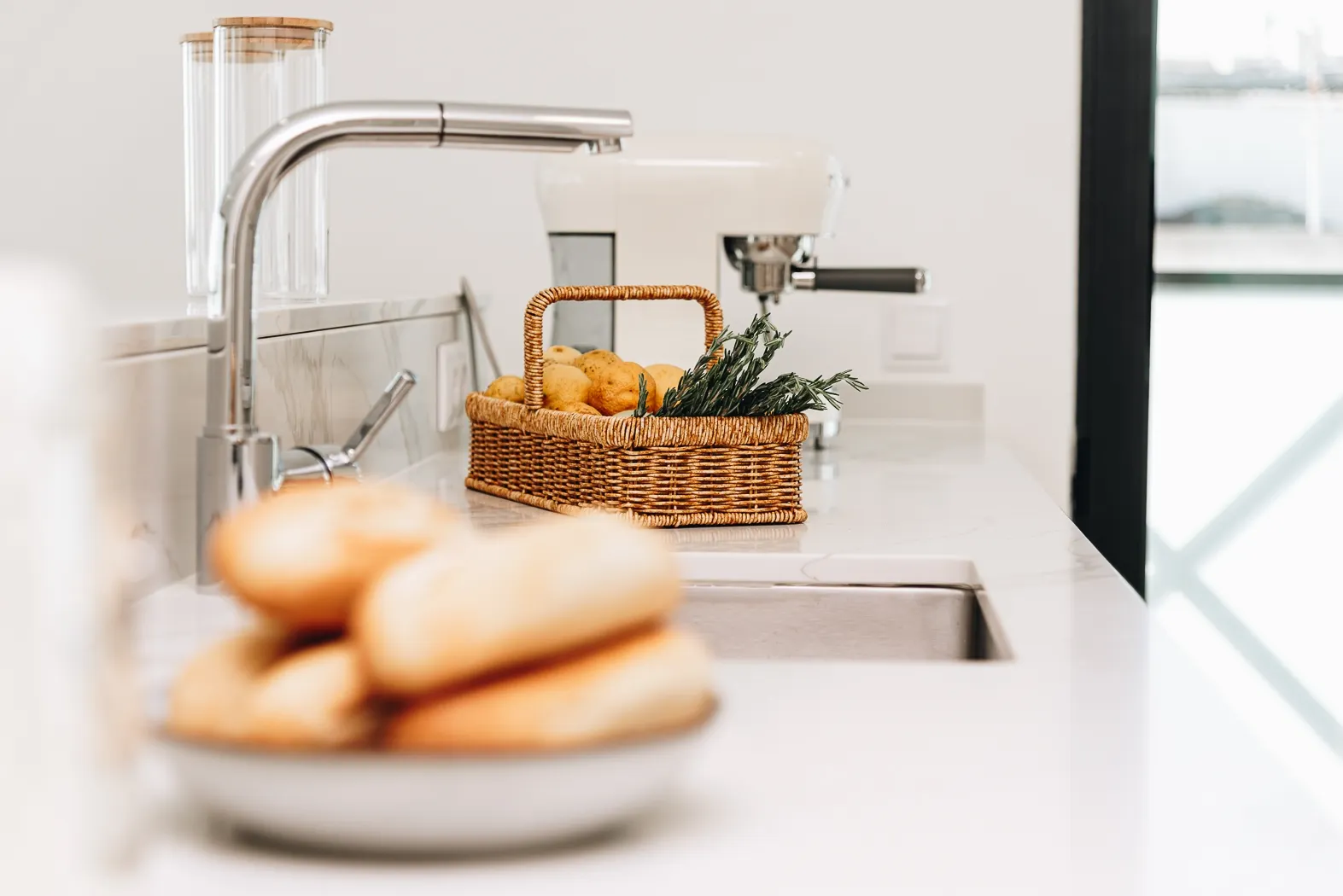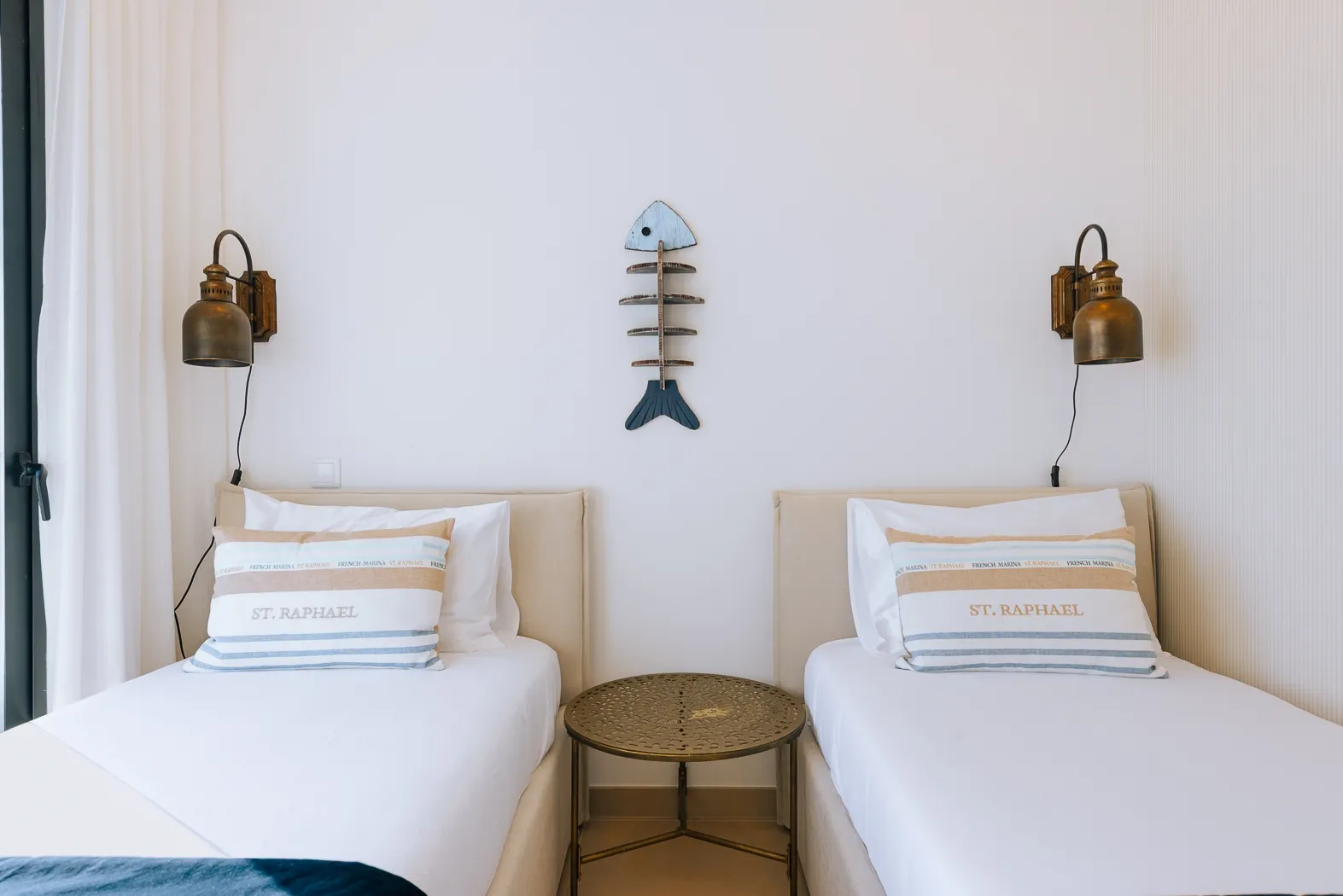 The overall atmosphere evokes a day by the seaside, with sandy colors, abundant natural light, and a touch of extravagance.