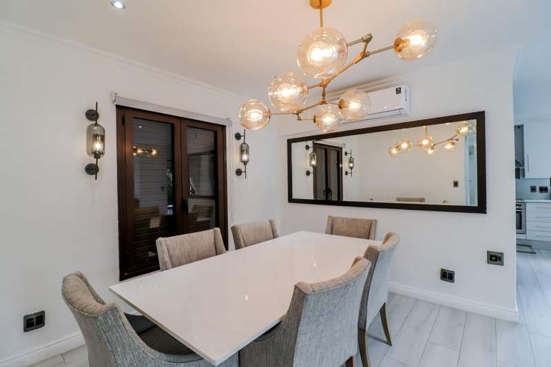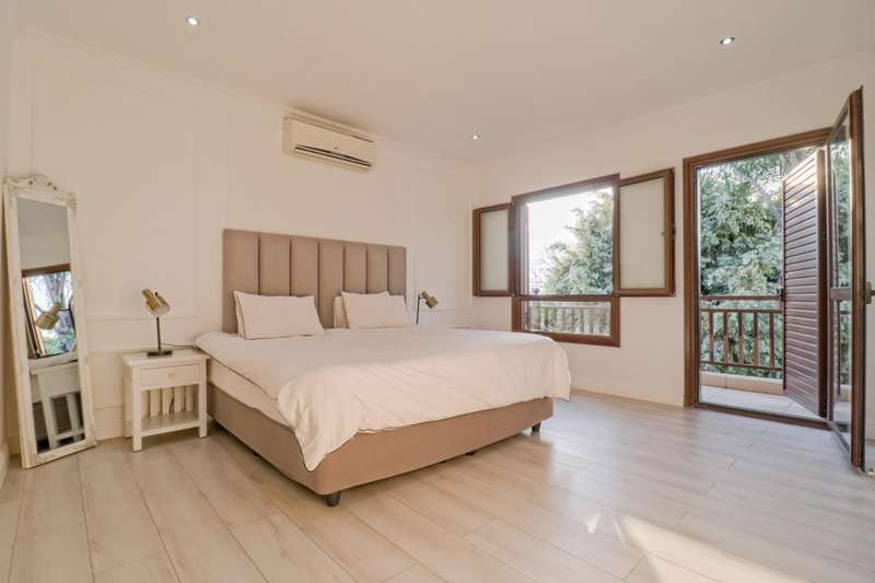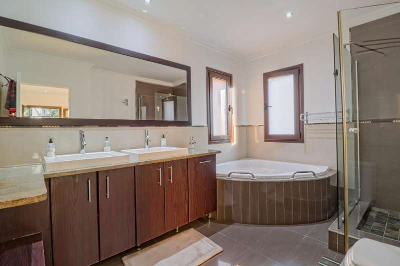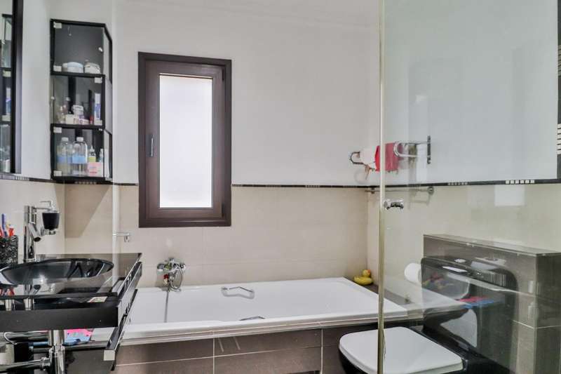 Upstairs, the bedrooms await, and the master bedroom is nothing short of a dream. Its sheer size impresses, while its private balcony offers stunning views of the garden, creating an intimate escape to unwind. The luxurious en-suite bathroom, complete with a jacuzzi bath, adds a touch of indulgence to your daily routine. The second and third bedrooms are spacious, providing ample room and comfort for family members or guests. They share a full bathroom, expertly designed with high-end finishes.
