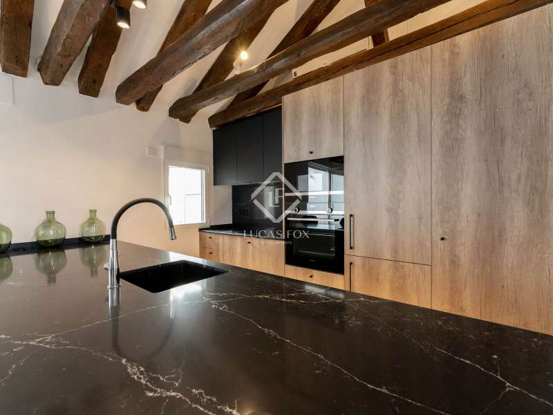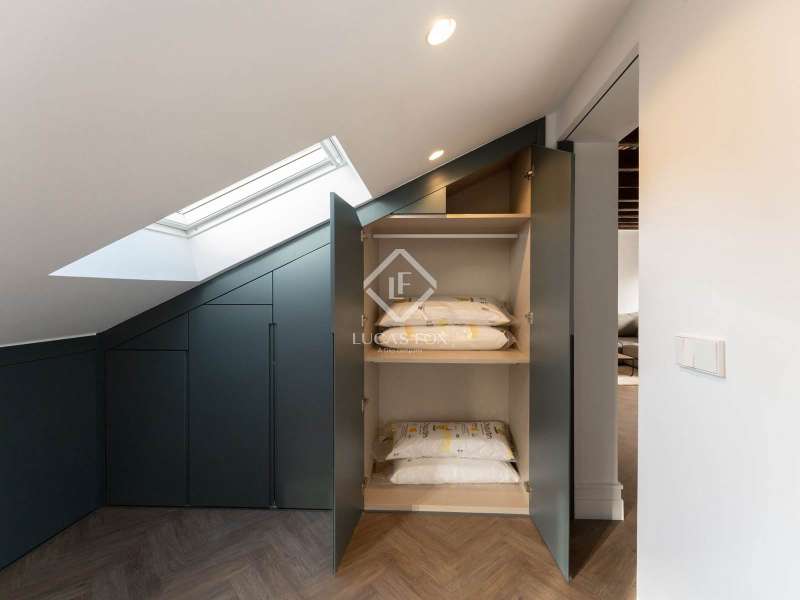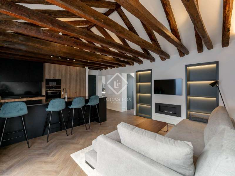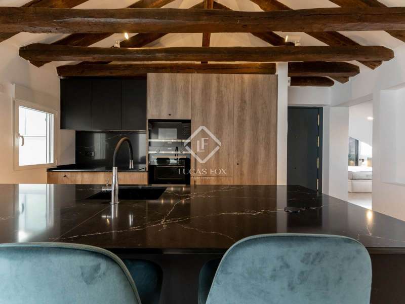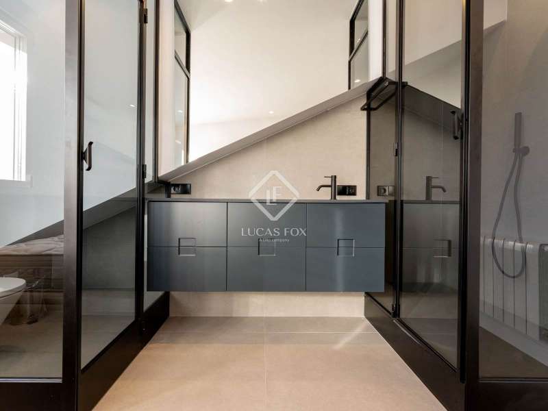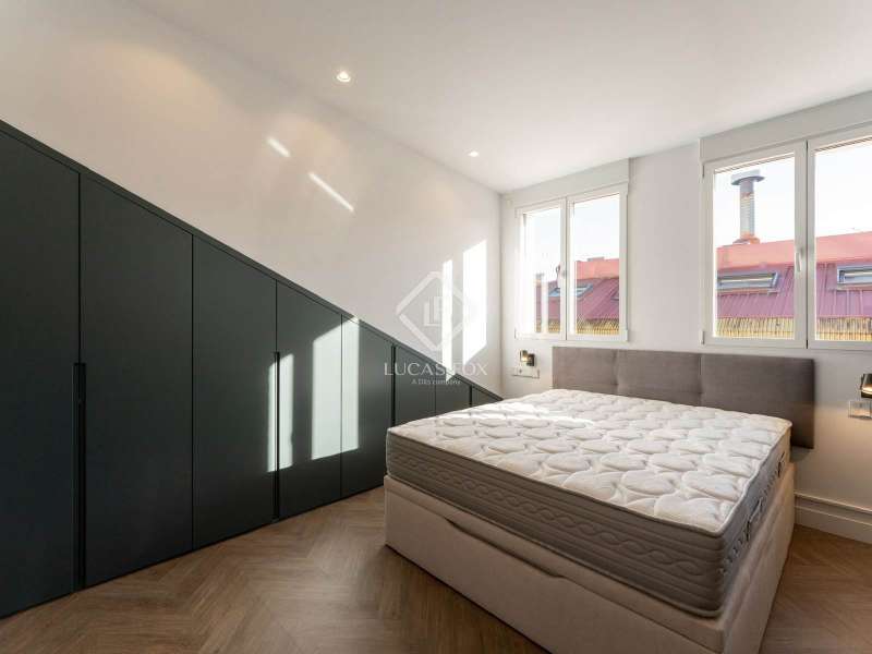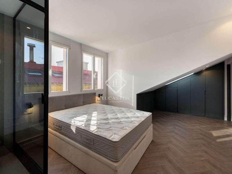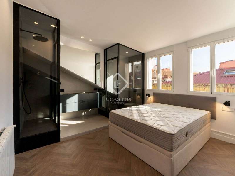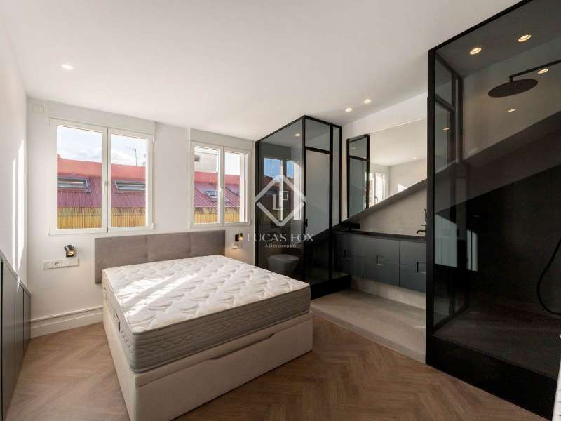 Lucas Fox presents this magnificent penthouse, renovated to a high specification. Located just a few meters from Plaza de Salesas, one of the most sought-after locations in the Justicia area. The penthouse consists of two bedrooms with en suite bathroom , and a spacious living area with an open kitchen, which opens directly onto the approximately 20-square-meter terrace, an oasis in the middle of the city. The classic red brick building from the early 20th century, perfectly maintained and with an elevator