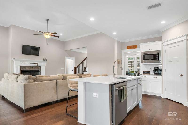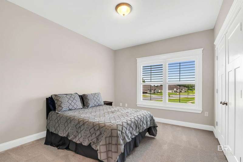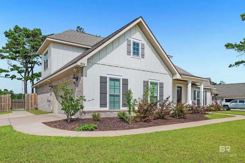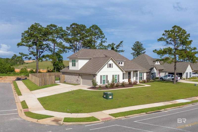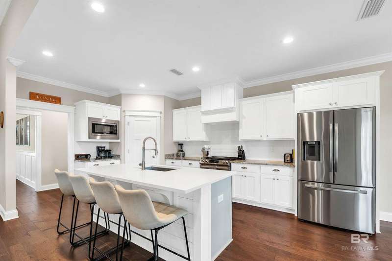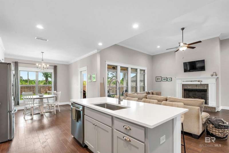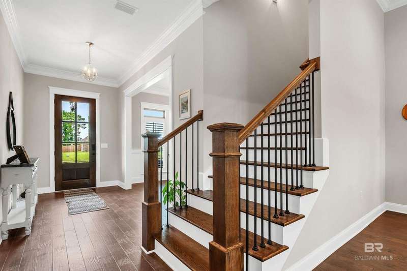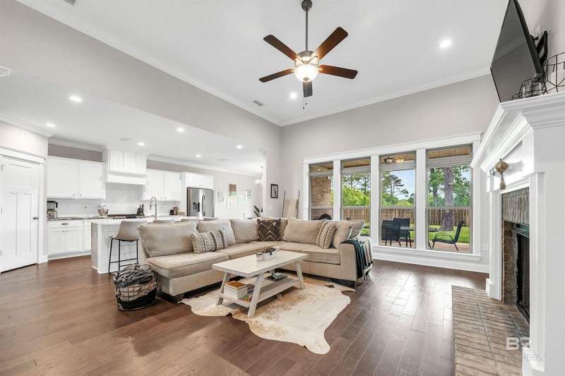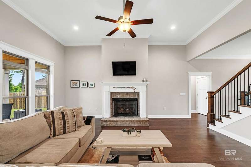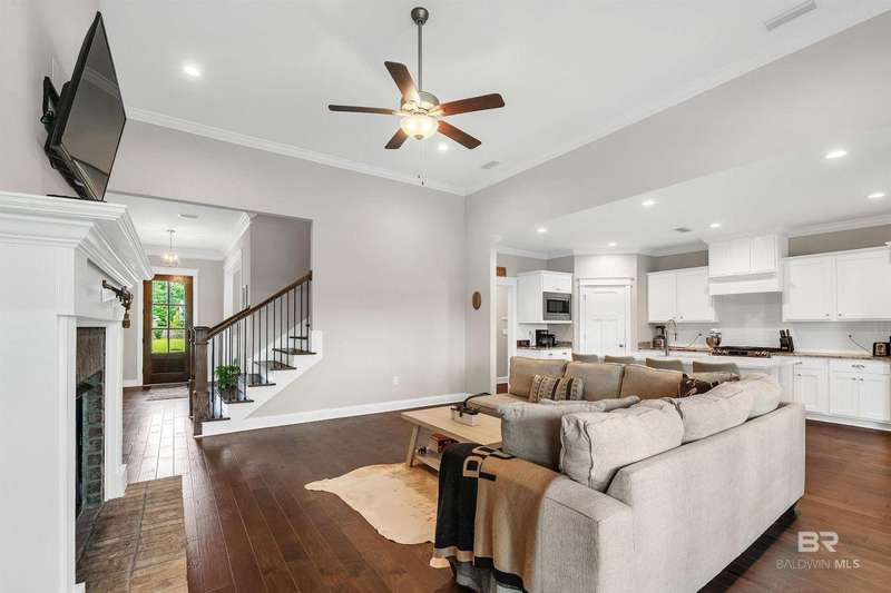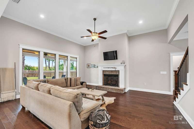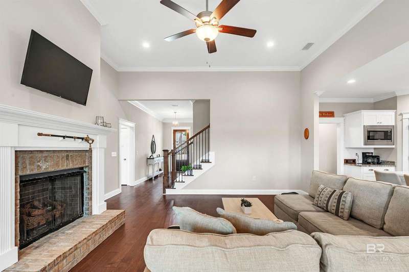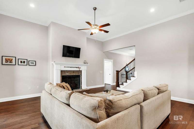 Welcome to this beautifully crafted Signature Series Truland Home, Gold Fortified and located in the desirable Aventura subdivision. This four-bedroom, three-bath property offers quality construction, thoughtful design, and an ideal location within the Gulf Shores City School District. The home's curb appeal is enhanced by a classic brick exterior, tiled front porch, and a stained solid oak front door with beveled glass. Inside, the spacious layout features 12-foot ceilings, hardwood flooring throughout the main living areas and primary bedroom, crown molding, and finely trimmed doors and windows. A gas fireplace with a painted brick surround adds warmth and character to the main living space, which is filled with natural light from a wall of windows overlooking the private, fenced backyard. The kitchen is designed for both function and style, showcasing painted cabinets, granite countertops, a quartz island, and stainless steel appliances including a slide-in gas range. The layout flows seamlessly into the living and dining areas, creating a welcoming space for daily living or entertaining. The primary suite overlooks the backyard and includes a tray ceiling and a spacious en-suite bathroom with double vanity, granite counters, a separate shower, a garden tub, and an oversized walk-in closet. Two additional bedrooms and a full bath are located upstairs, while the main floor also offers a formal dining area, laundry room, a guest bedroom, and another full bath. Additional features include an epoxy-finished side-entry garage, covered rear patio offering evening shade, a landscaped yard with a full irrigation system and courtesy meter, smart thermostat, and plantation blinds throughout. Situated in a prime Gulf Shores location close to schools, shopping, and recreational amenities, this move-in ready home in Aventura offers an exceptional opportunity to enjoy quality coastal living. Buyer to verify all information during due diligence.