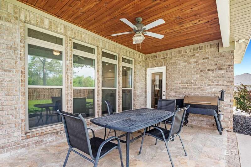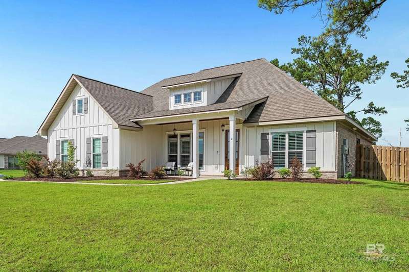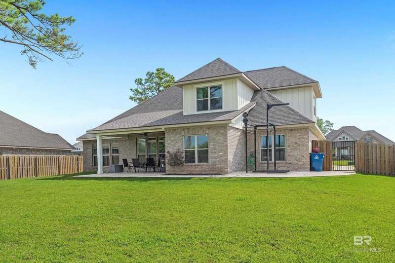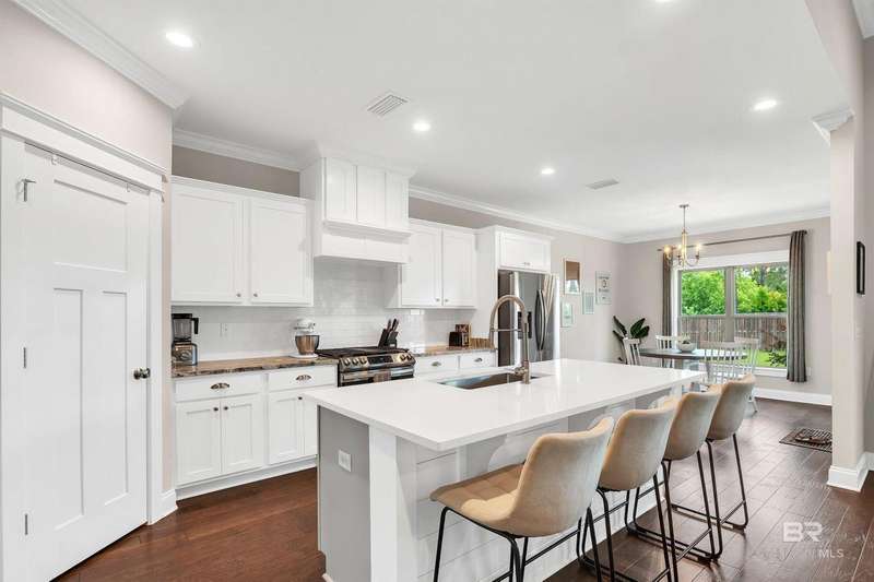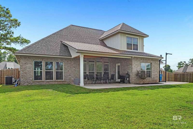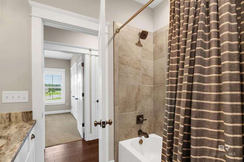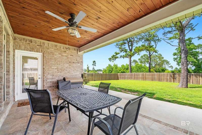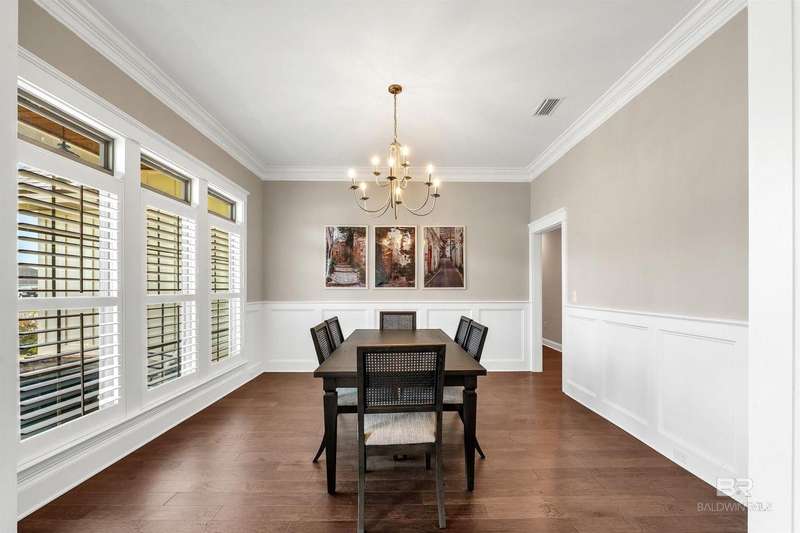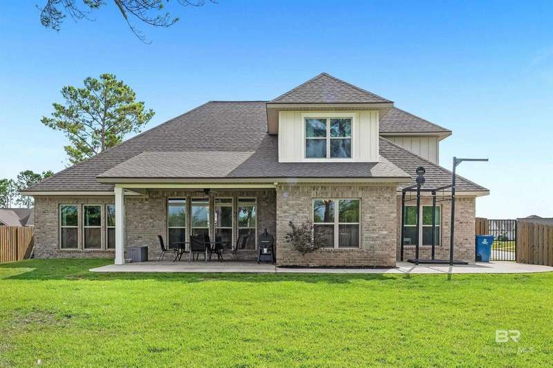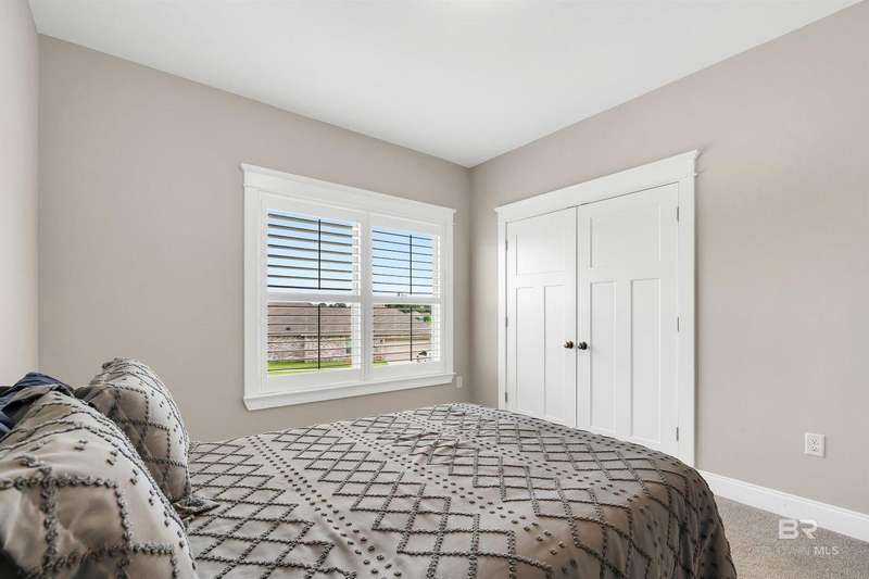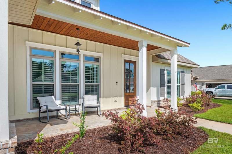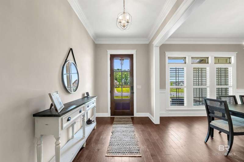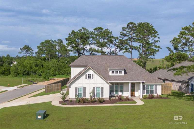 Welcome to this beautifully crafted Signature Series Truland Home, Gold Fortified and located in the desirable Aventura subdivision. This four-bedroom, three-bath property offers quality construction, thoughtful design, and an ideal location within the Gulf Shores City School District. The home's curb appeal is enhanced by a classic brick exterior, tiled front porch, and a stained solid oak front door with beveled glass. Inside, the spacious layout features 12-foot ceilings, hardwood flooring throughout the main living areas and primary bedroom, crown molding, and finely trimmed doors and windows. A gas fireplace with a painted brick surround adds warmth and character to the main living space, which is filled with natural light from a wall of windows overlooking the private, fenced backyard. The kitchen is designed for both function and style, showcasing painted cabinets, granite countertops, a quartz island, and stainless steel appliances including a slide-in gas range. The layout flows seamlessly into the living and dining areas, creating a welcoming space for daily living or entertaining. The primary suite overlooks the backyard and includes a tray ceiling and a spacious en-suite bathroom with double vanity, granite counters, a separate shower, a garden tub, and an oversized walk-in closet. Two additional bedrooms and a full bath are located upstairs, while the main floor also offers a formal dining area, laundry room, a guest bedroom, and another full bath. Additional features include an epoxy-finished side-entry garage, covered rear patio offering evening shade, a landscaped yard with a full irrigation system and courtesy meter, smart thermostat, and plantation blinds throughout. Situated in a prime Gulf Shores location close to schools, shopping, and recreational amenities, this move-in ready home in Aventura offers an exceptional opportunity to enjoy quality coastal living. Buyer to verify all information during due diligence.