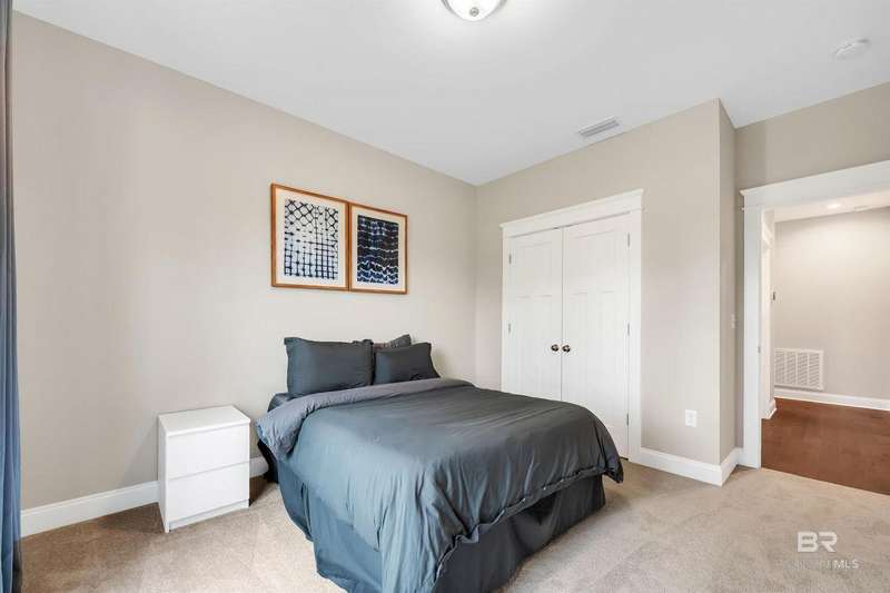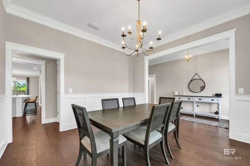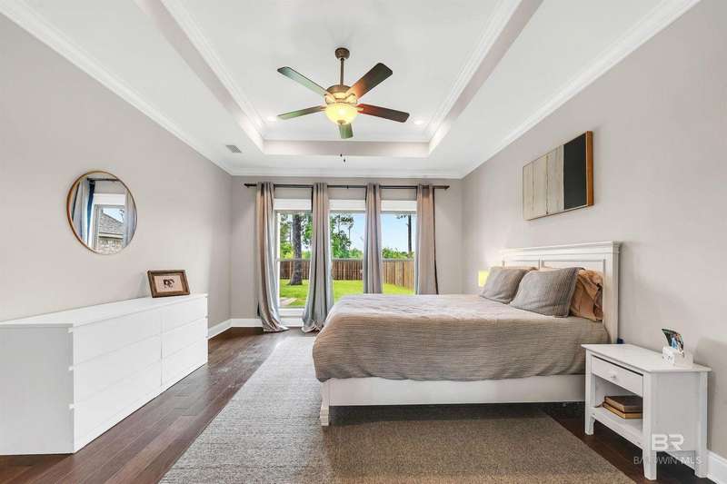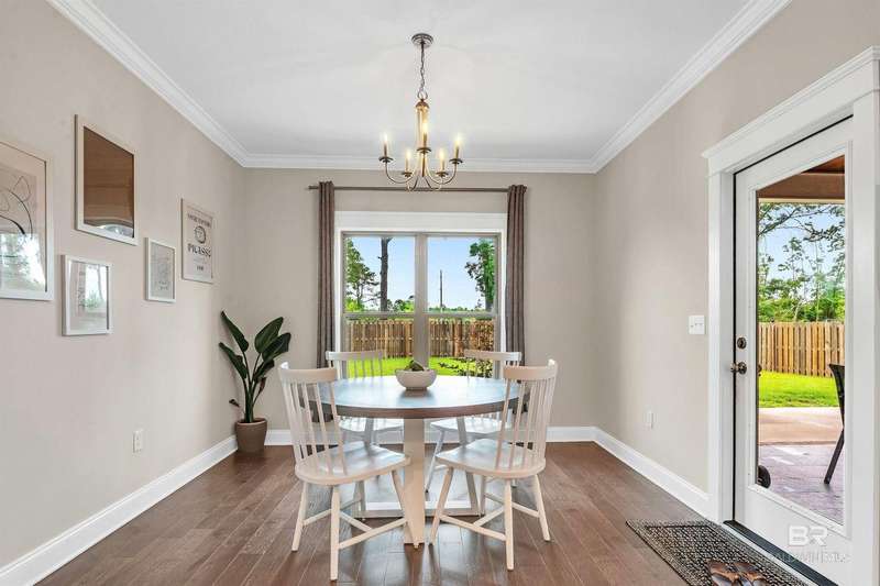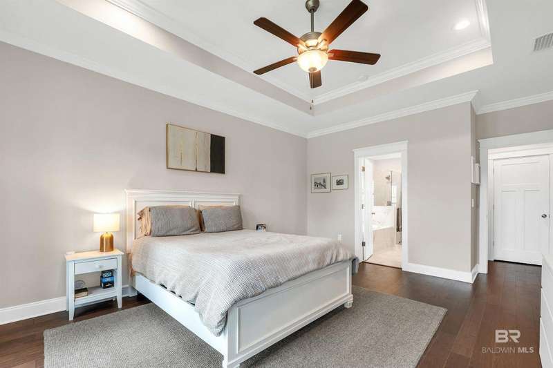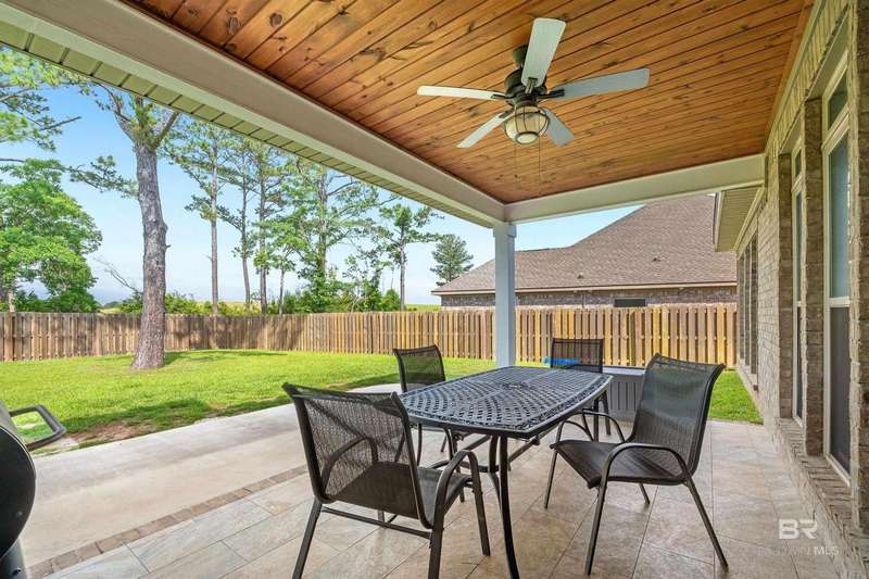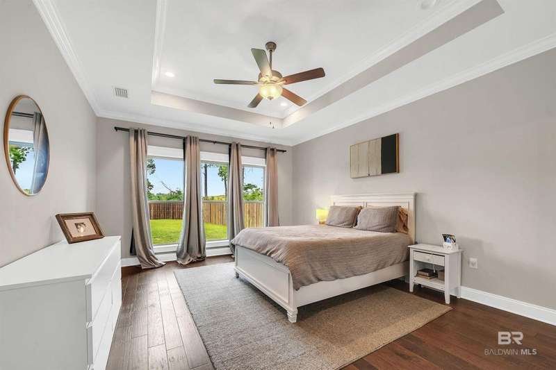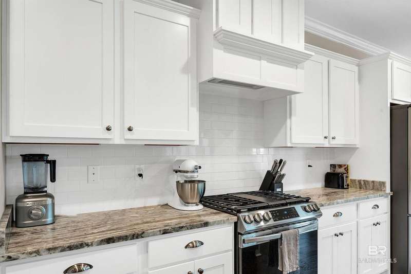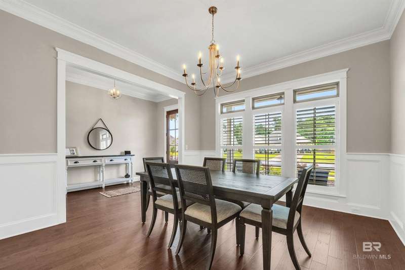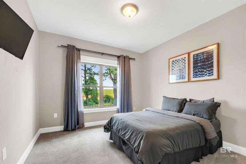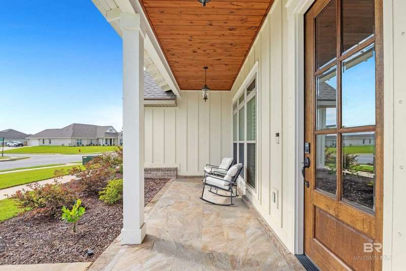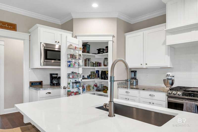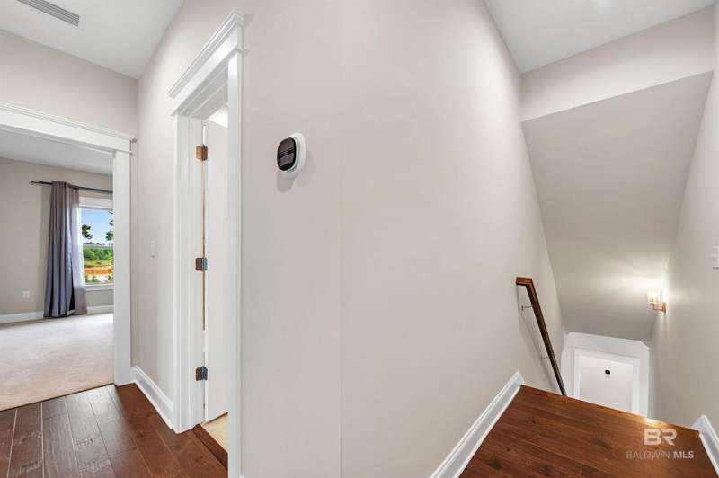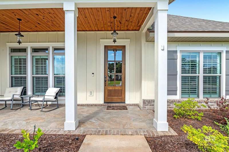 Welcome to this beautifully crafted Signature Series Truland Home, Gold Fortified and located in the desirable Aventura subdivision. This four-bedroom, three-bath property offers quality construction, thoughtful design, and an ideal location within the Gulf Shores City School District. The home's curb appeal is enhanced by a classic brick exterior, tiled front porch, and a stained solid oak front door with beveled glass. Inside, the spacious layout features 12-foot ceilings, hardwood flooring throughout the main living areas and primary bedroom, crown molding, and finely trimmed doors and windows. A gas fireplace with a painted brick surround adds warmth and character to the main living space, which is filled with natural light from a wall of windows overlooking the private, fenced backyard. The kitchen is designed for both function and style, showcasing painted cabinets, granite countertops, a quartz island, and stainless steel appliances including a slide-in gas range. The layout flows seamlessly into the living and dining areas, creating a welcoming space for daily living or entertaining. The primary suite overlooks the backyard and includes a tray ceiling and a spacious en-suite bathroom with double vanity, granite counters, a separate shower, a garden tub, and an oversized walk-in closet. Two additional bedrooms and a full bath are located upstairs, while the main floor also offers a formal dining area, laundry room, a guest bedroom, and another full bath. Additional features include an epoxy-finished side-entry garage, covered rear patio offering evening shade, a landscaped yard with a full irrigation system and courtesy meter, smart thermostat, and plantation blinds throughout. Situated in a prime Gulf Shores location close to schools, shopping, and recreational amenities, this move-in ready home in Aventura offers an exceptional opportunity to enjoy quality coastal living. Buyer to verify all information during due diligence.