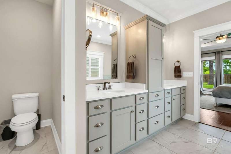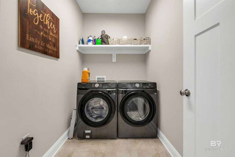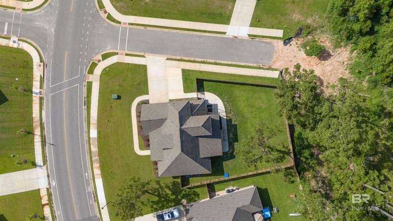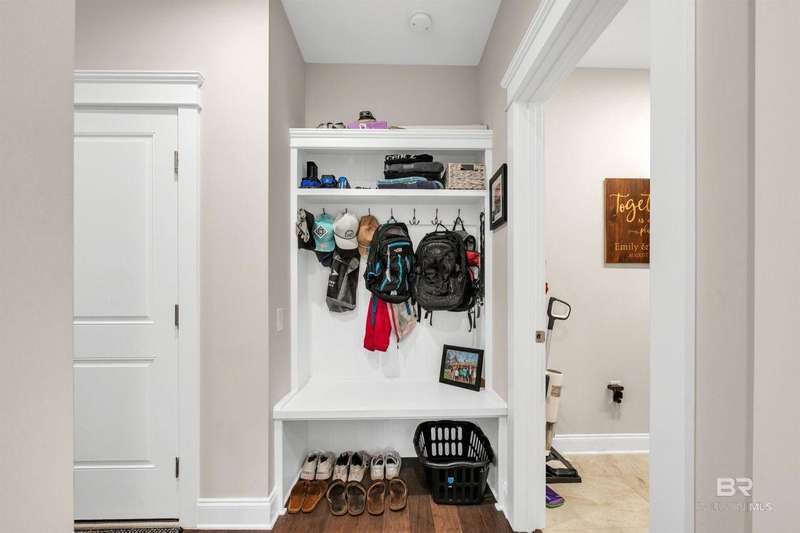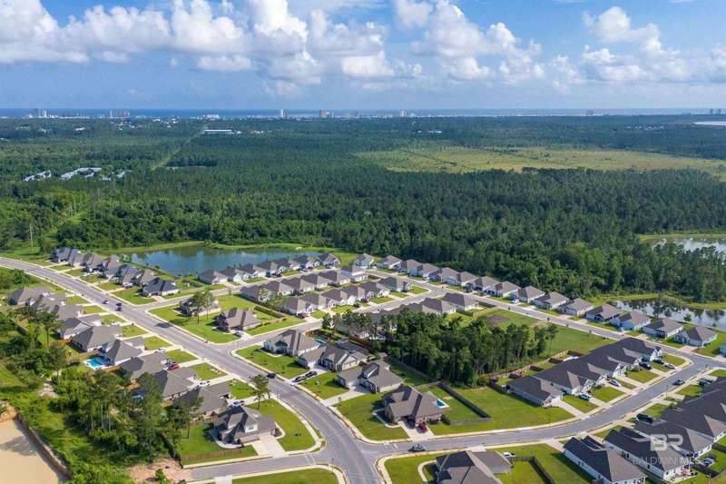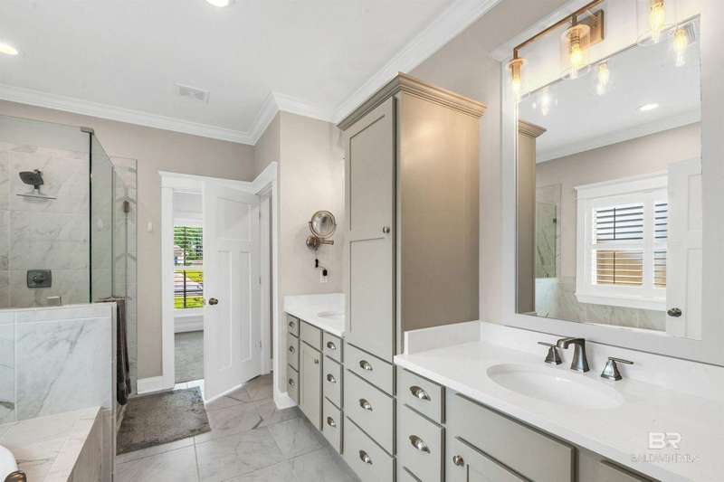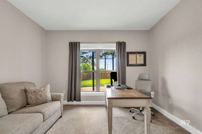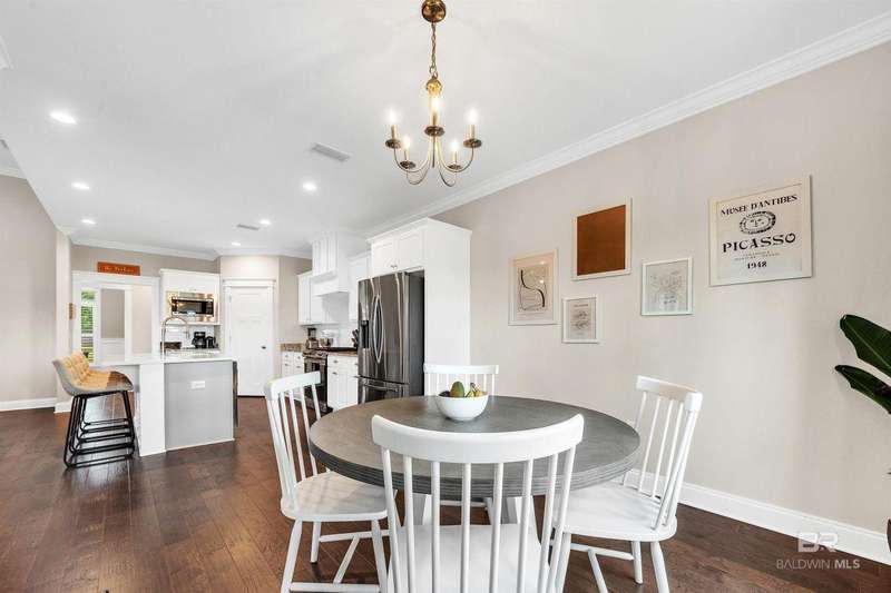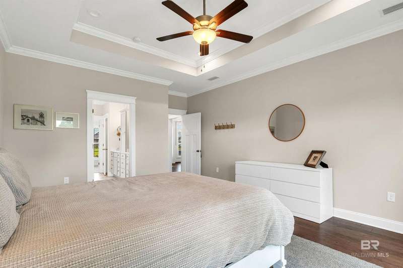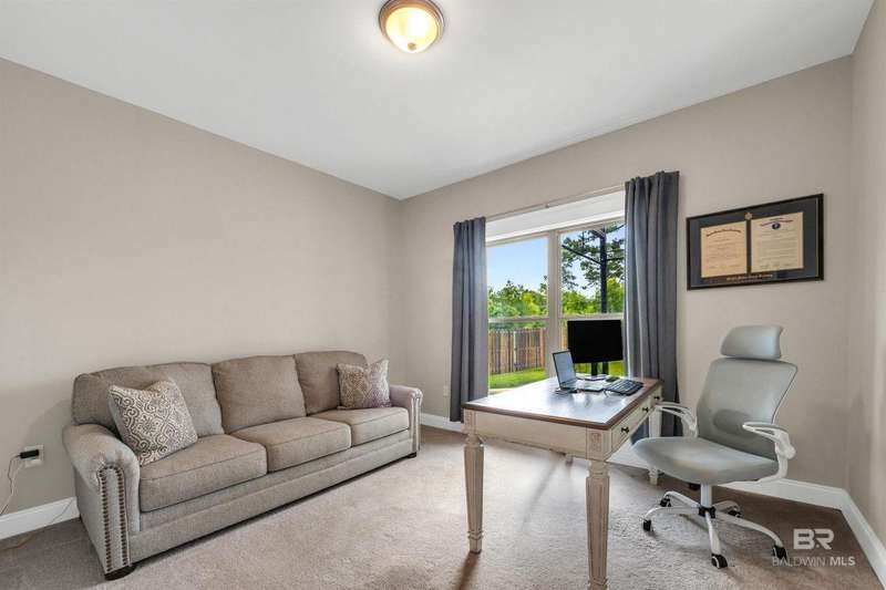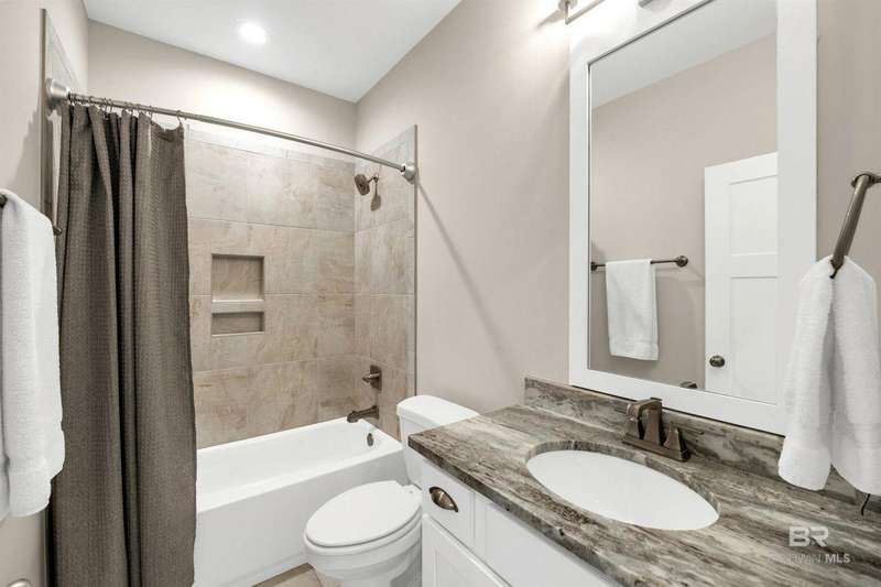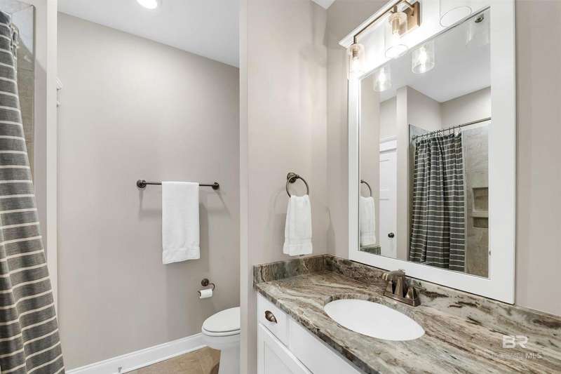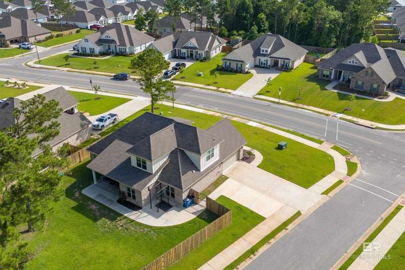 Welcome to this beautifully crafted Signature Series Truland Home, Gold Fortified and located in the desirable Aventura subdivision. This four-bedroom, three-bath property offers quality construction, thoughtful design, and an ideal location within the Gulf Shores City School District. The home's curb appeal is enhanced by a classic brick exterior, tiled front porch, and a stained solid oak front door with beveled glass. Inside, the spacious layout features 12-foot ceilings, hardwood flooring throughout the main living areas and primary bedroom, crown molding, and finely trimmed doors and windows. A gas fireplace with a painted brick surround adds warmth and character to the main living space, which is filled with natural light from a wall of windows overlooking the private, fenced backyard. The kitchen is designed for both function and style, showcasing painted cabinets, granite countertops, a quartz island, and stainless steel appliances including a slide-in gas range. The layout flows seamlessly into the living and dining areas, creating a welcoming space for daily living or entertaining. The primary suite overlooks the backyard and includes a tray ceiling and a spacious en-suite bathroom with double vanity, granite counters, a separate shower, a garden tub, and an oversized walk-in closet. Two additional bedrooms and a full bath are located upstairs, while the main floor also offers a formal dining area, laundry room, a guest bedroom, and another full bath. Additional features include an epoxy-finished side-entry garage, covered rear patio offering evening shade, a landscaped yard with a full irrigation system and courtesy meter, smart thermostat, and plantation blinds throughout. Situated in a prime Gulf Shores location close to schools, shopping, and recreational amenities, this move-in ready home in Aventura offers an exceptional opportunity to enjoy quality coastal living. Buyer to verify all information during due diligence.