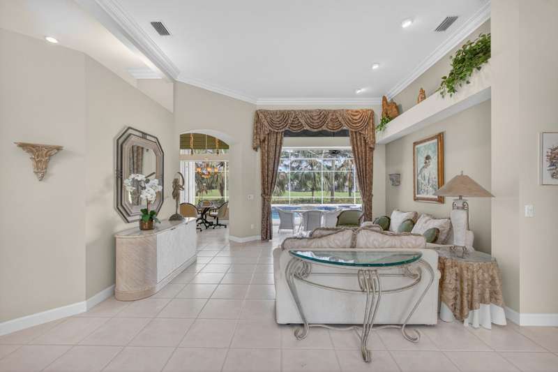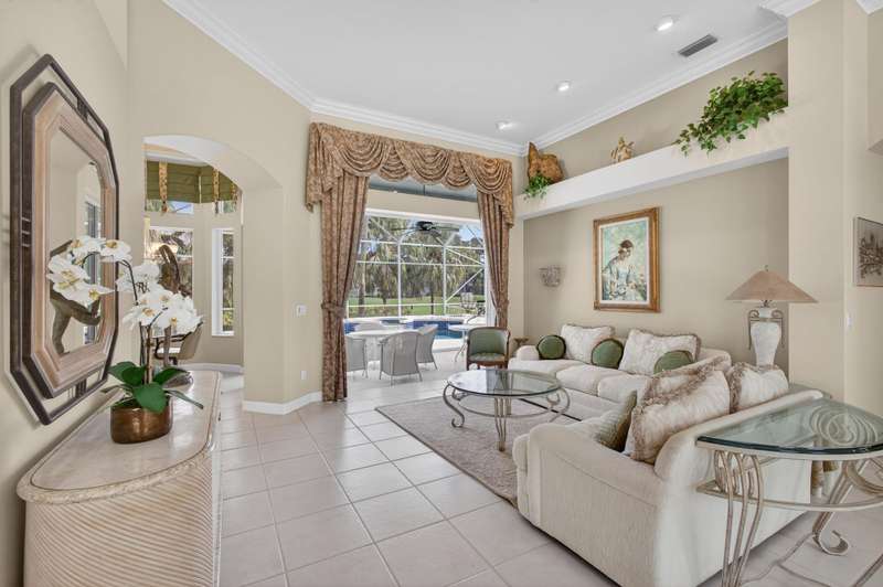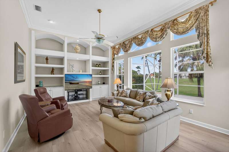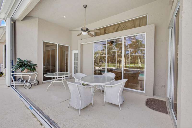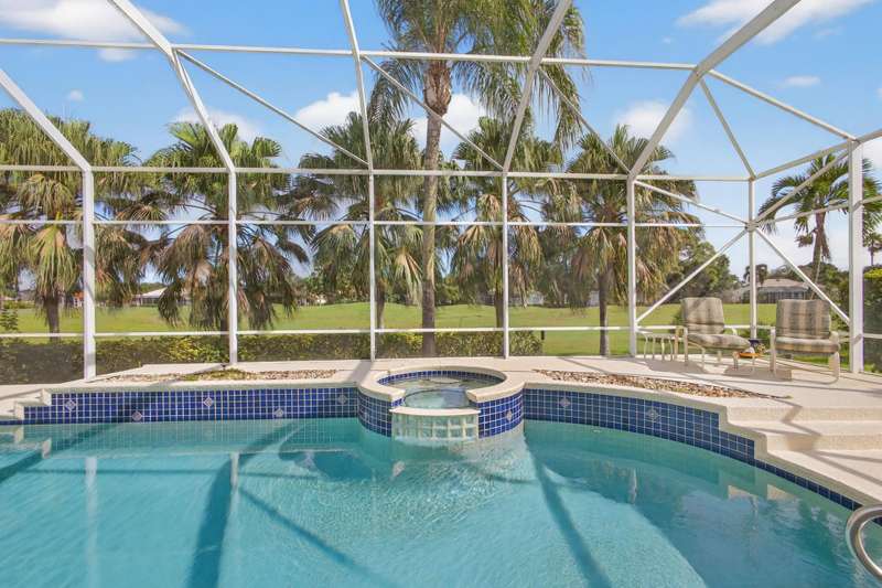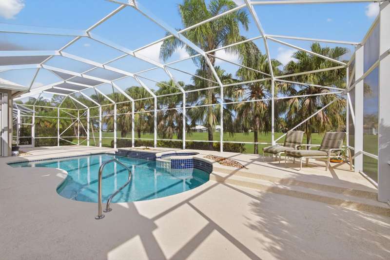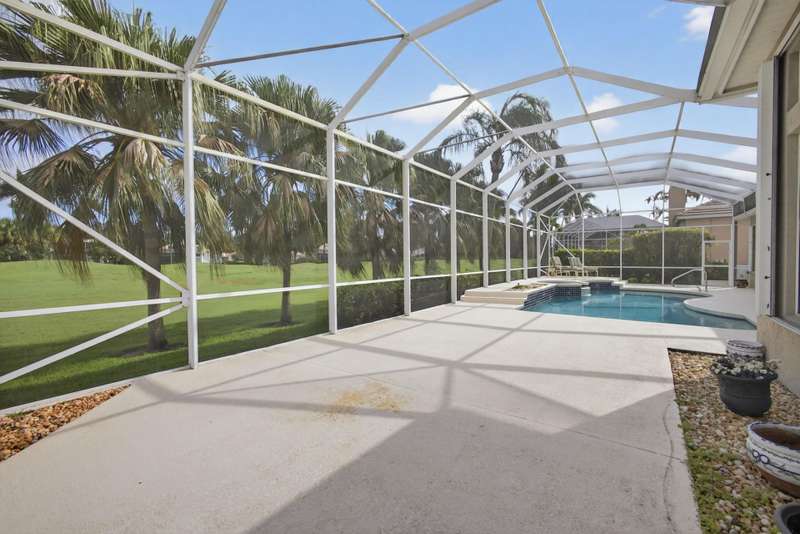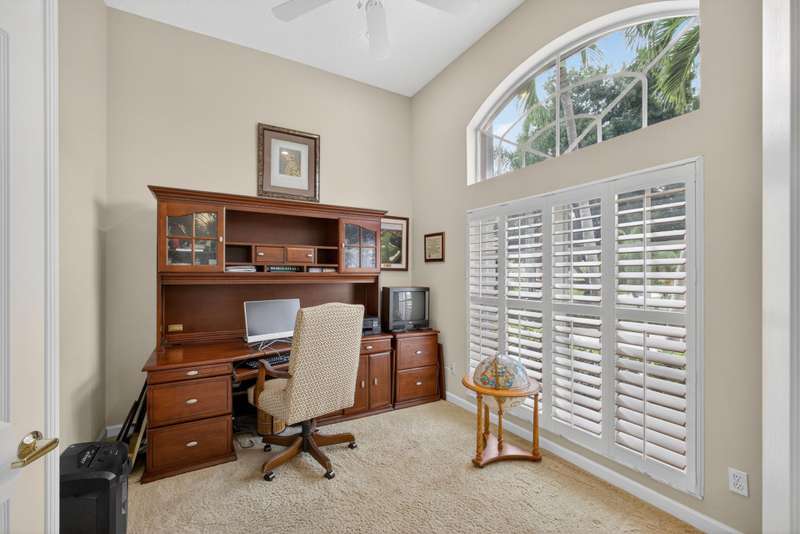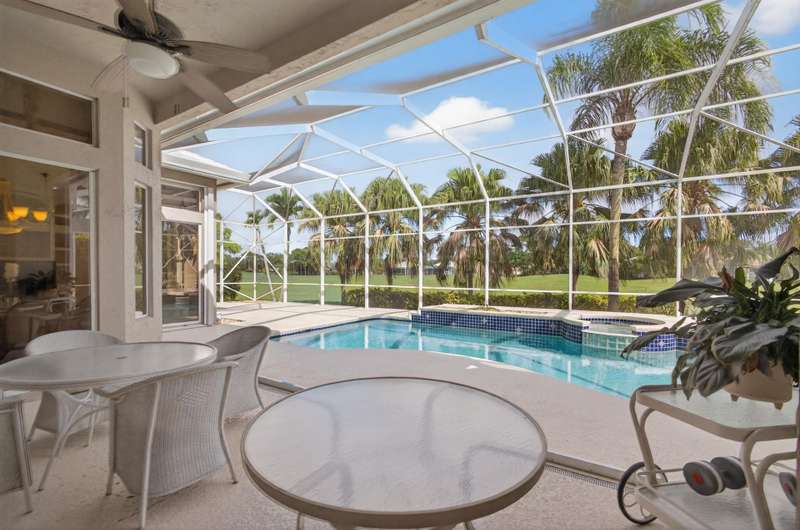 Discover the elegance of Monarch Country Club in this stunning 3-bedroom, 3-bathroom plus den home. Enjoy the spacious living with 14-foot ceilings, a large deck with heated pool and Jacuzzi overlooking the 9th hole of the golf course. The home features double door entry, a 3-car garage, new flat tile roof (2024), stainless steel appliances with double oven in kitchen, and complete accordion shutters. Beautifully landscaped yard with a large paver driveway. The community is man-gated with non-mandatory club membership. HOA includes lawn care, exterior painting every six years, cable, fiber optic internet, and more for just $575/month. One of the most sought-after floor plans in the community!