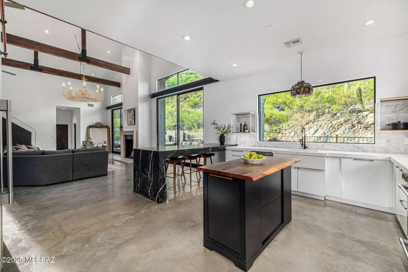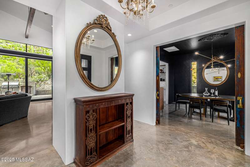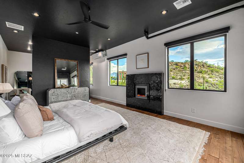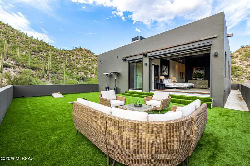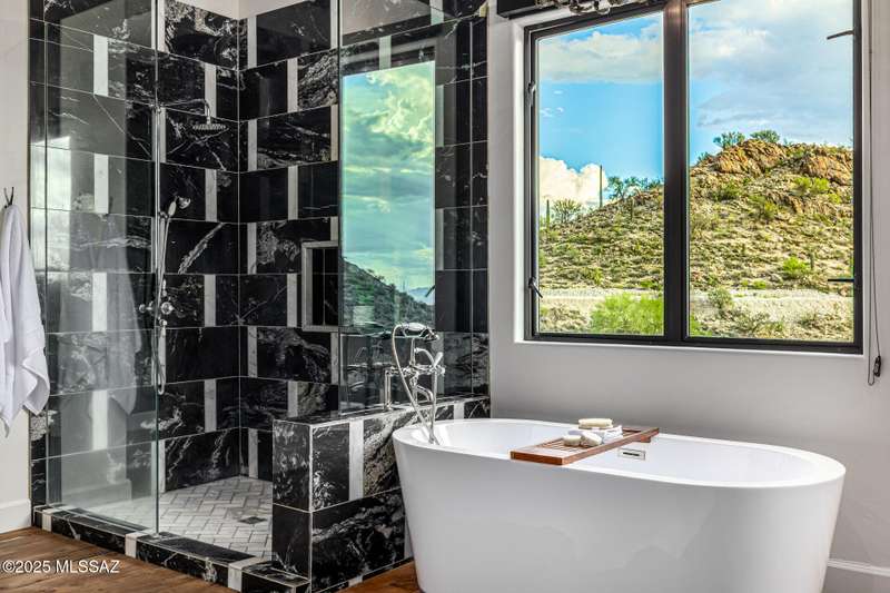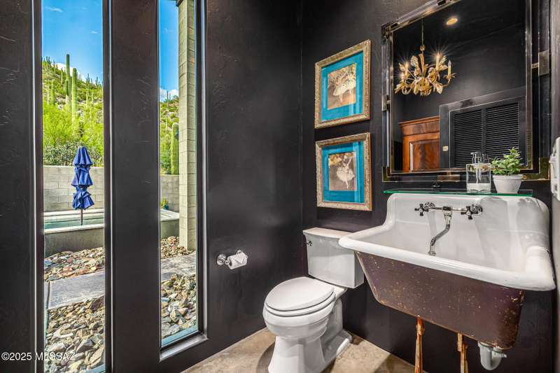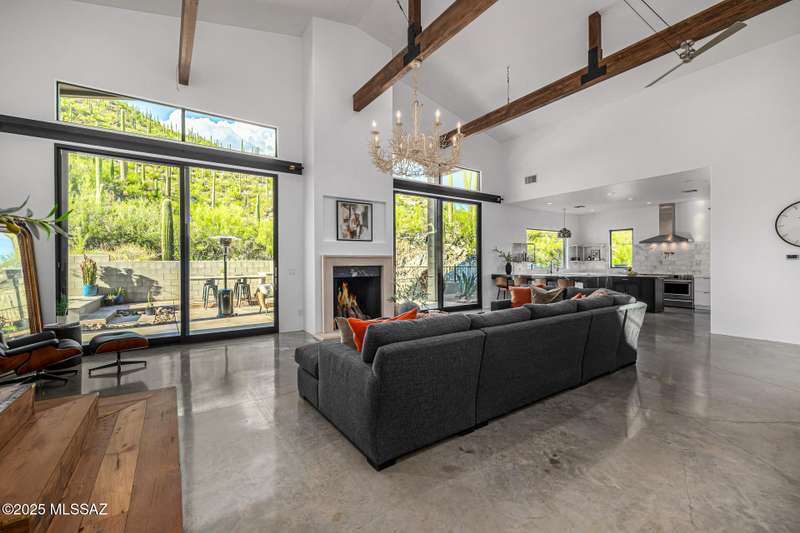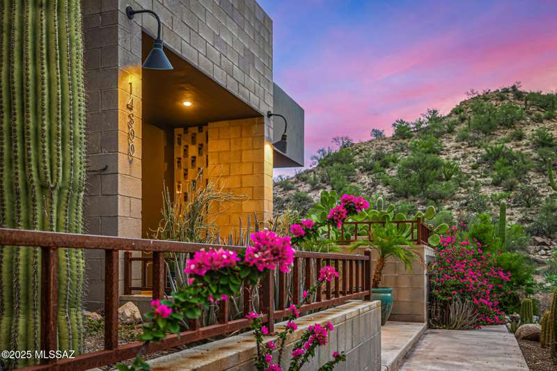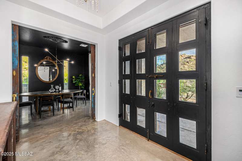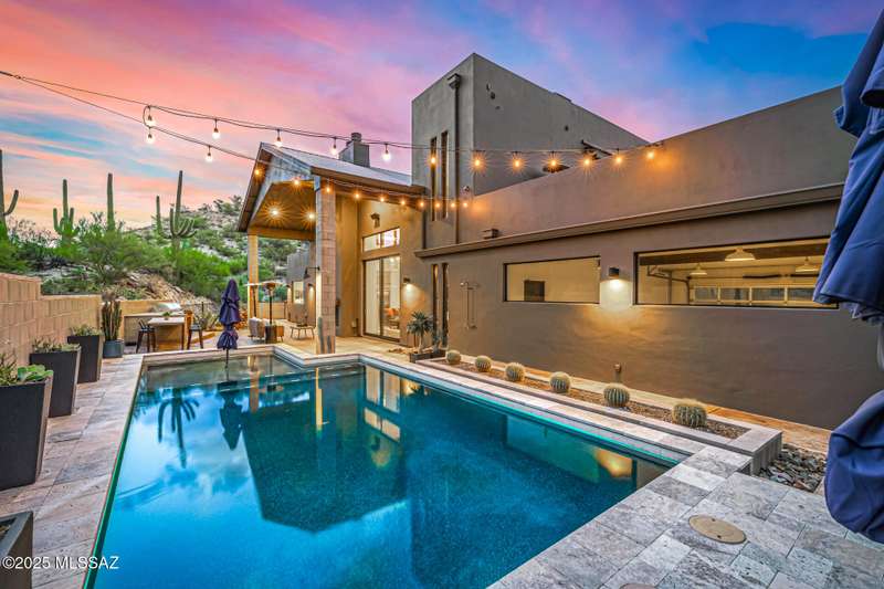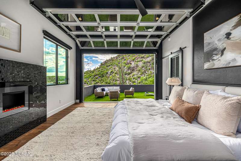 Nestled deep in the scenic Tortolita Mountains, this fully custom-built 2018 estate combines refined design with extensive upgrades inside and out. The property welcomes you with an asphalt driveway, elegant paver accents, and professionally landscaped grounds featuring outdoor lighting, solar lamps, a decorative fountain, and a custom-finished front entry. All the doors used in the home were from the historic Hotel Hidalgo! The roof has been resealed and the exteriors freshly repainted. Enjoy resort-style outdoor living with a sparkling pool (new heater), a mesquite-mantle fireplace with a custom screen, propane starter, built-in barbecue mechanics, and decorative fencing. Set against a backdrop of untouched desert beauty, the estate offers breathtaking 360-degree panoramic views of
