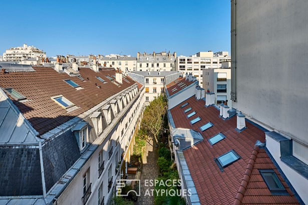Located on the 3rd and 4th floors of an old building with no elevator, this 89.19 m2 (87.10 m2 Carrez law) duplex apartment perfectly combines character, light, and serenity, nestled between a lively street and a tree-lined courtyard, sheltered from view.
