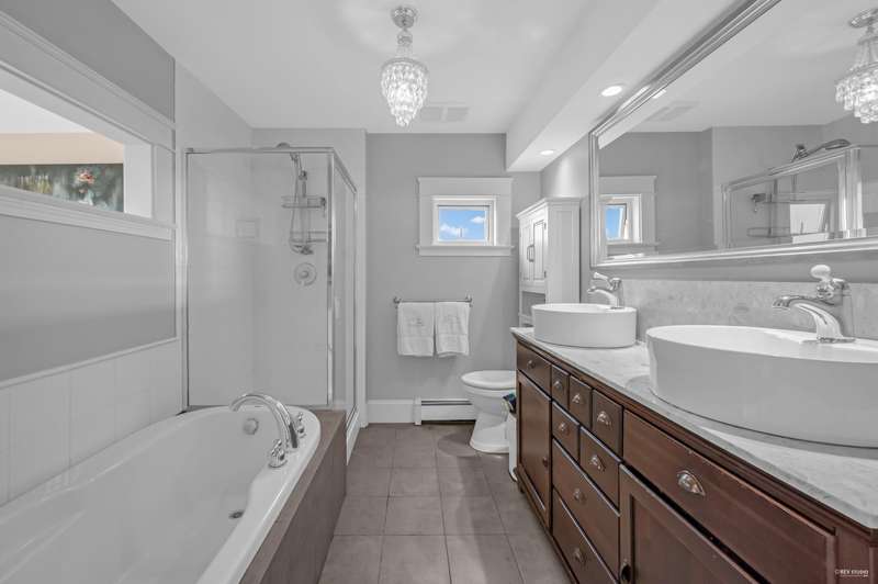 Elegance & Charm in Lower Lonsdale! Beautiful spacious south facing VIEW heritage home, on desirable boulevard street. Architecturally remodeled 2518 sq ft. High ceilings with house size rooms, 4 bedrooms, 2½ bathrooms (luxury master suite with spa like bathroom), gourmet kitchen, pantry, formal dining area, large upper rec room, laundry room, h/w floors & air con. Enjoy covered veranda overlooking fenced garden & decks boasting harbor, city & bridge views from all levels…a perfect entertaining home. Garage & Carport off back lane with space for recreation toys. Walk to Lonsdale Quay, Seabus, transit, Shipyards Victoria Park, Hospital, Spirit Trail, etc. Classified as duplex, but looks & feels like a 3 level detached home with discreet 4th level separate title suite below. A Gem!
