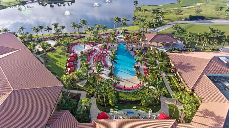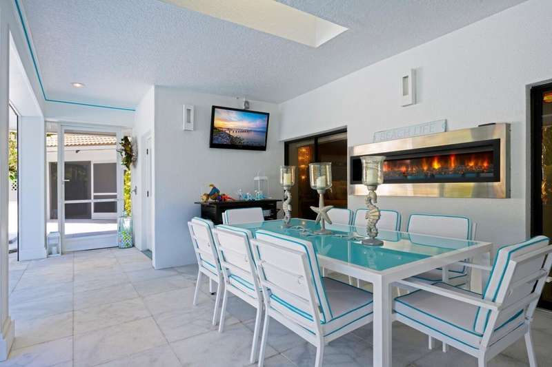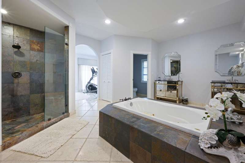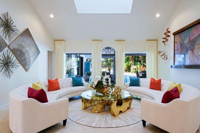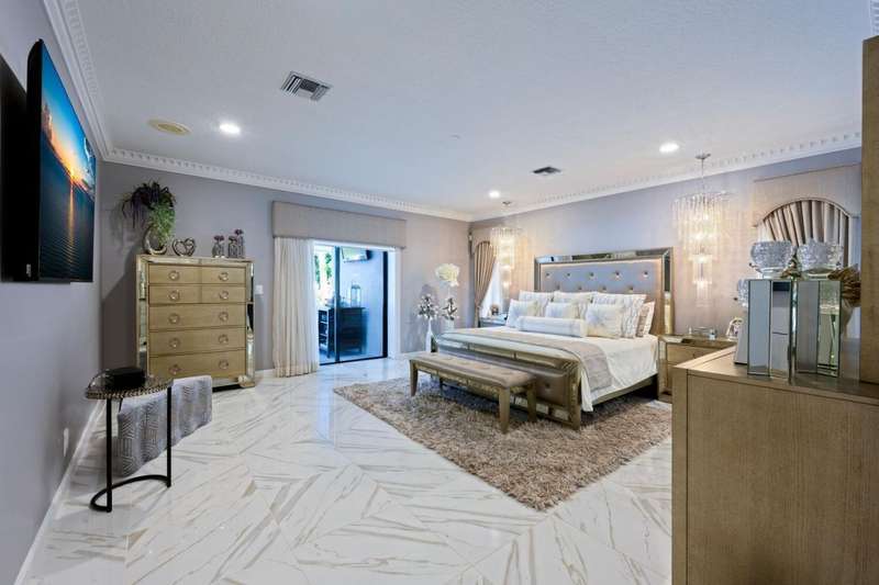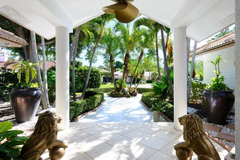 Discover luxury living in the heart of PGA Nationals prestigious Marlwood. Perfectly situated on the 13th hole of The Match Course, this elegant 5-bedroom, 3 full bath 2 half bath estate (including a private casita) blends timeless design with resort-style amenities offering the ultimate in South Florida living.The main residence features 4 bedrooms, 2 full bath and 2 half baths, with a thoughtfully designed layout ideal for entertaining. A custom wood front door with glass accents welcomes you into marble-clad living spaces, a sunken living room with sliders to the pool, custom wall coverings, designer lighting, recessed lighting, and skylights. A tranquil water feature and artful details, including sculptures that convey, enhance the homes serene ambiance.