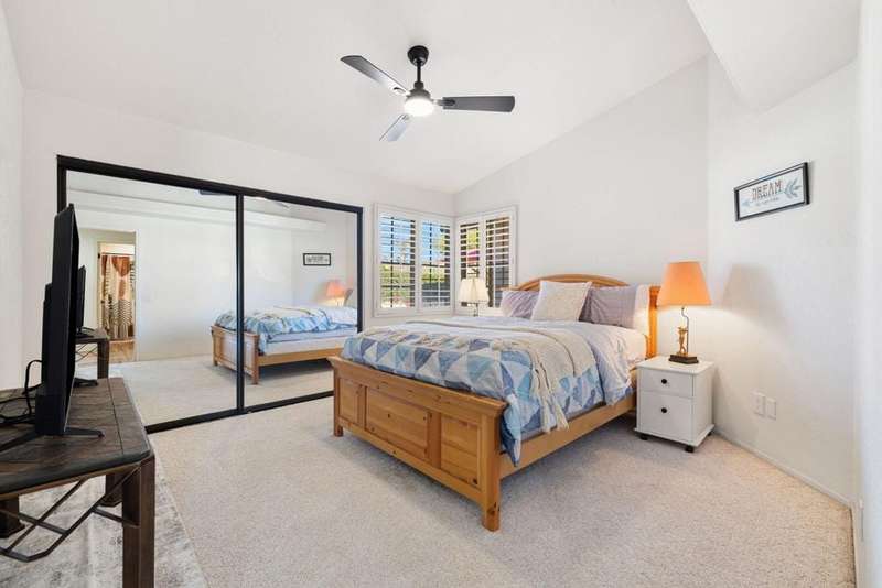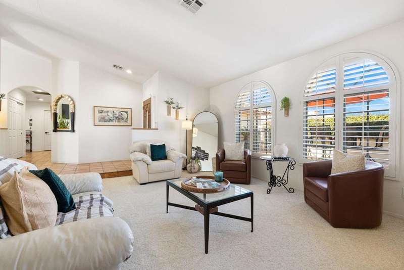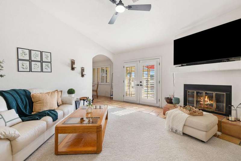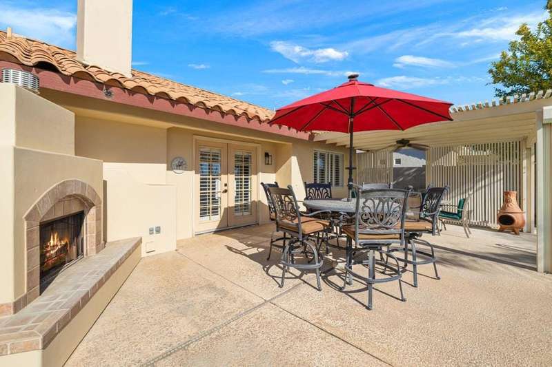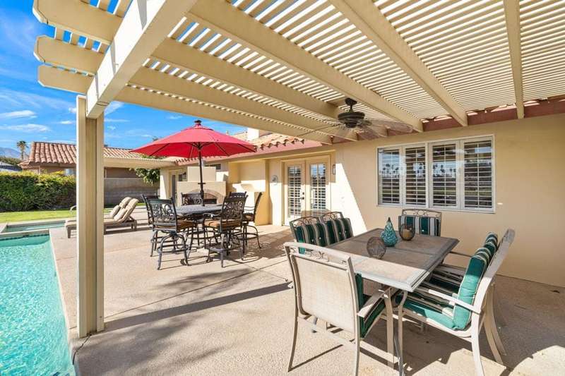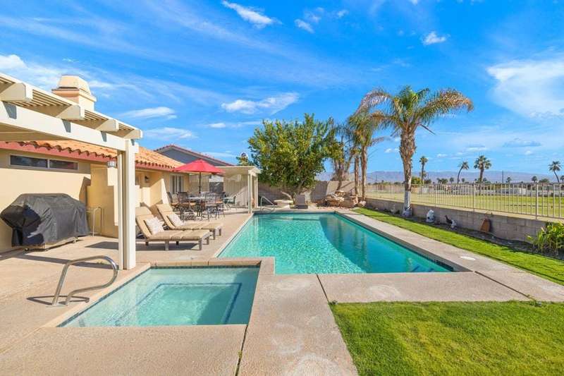 Cute, cozy and tastefully decorated seasonal rental on hole 7 of the Royal Course at Indian Palms Country Club. This custom 3 bedroom 2 bath home faces East and is close to the green giving you beautiful sunrises in the morning, the occasional hot air balloon, and the entertainment of golfers playing thru. There are three generous bedrooms with queen beds and TVs, a shared hallway bath with tub/shower and en-suite for the primary bedroom. There are two living spaces inside the home and two more outside. The front patio will give you warm sunsets and the back patio gives you a sparkling pool and spa, fireplace, covered dining space and a small grassy area for games. The home is equipped with everything you need to make your stay enjoyable. Renters will have access to the two car garage. Call today for availability or a private showing. RENTED: 3/29/25 - 5/3/25