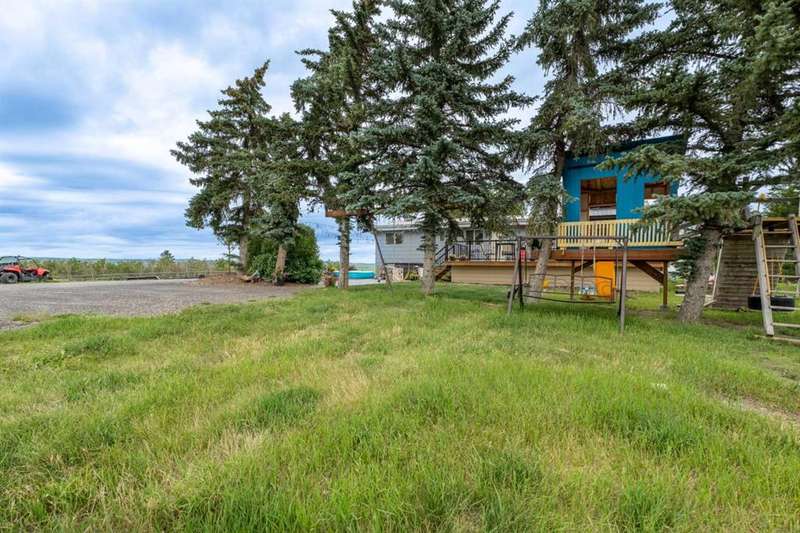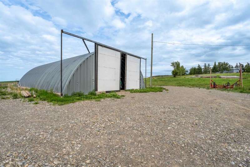 Welcome to your dream country retreat, nestled on 145.11 acres in picturesque Foothills County. Perfectly set up for cattle, horses, or any four-legged friends you wish to raise, this property features mature trees, rolling pastures, and 180-degree unobstructed views of the Rocky Mountains and Foothills, offering the ultimate rural lifestyle—just minutes from Diamond Valley and Okotoks. The 1,300 sq. ft. bilevel home is warm and inviting, with five bedrooms and three full bathrooms, ideal for family living. Enjoy cozy evenings by the wood-burning fireplace, and host gatherings on the expansive outdoor patio and large back deck, where you can watch breathtaking sunsets over the hills. Families will also appreciate school bus service to both public and Catholic schools, ensuring convenient access to education while still enjoying the peace of country living. For livestock and equipment needs, the property is exceptionally well-equipped with a drive-through Quonset featuring horse stalls, a second Quonset ideal for equipment storage, and an additional shed for extra space. All outbuildings are powered with electricity, while stock waterers and strategically placed water hydrants ensure convenience and efficiency for your animals and operations. The land is cross-fenced, making it ideal for grazing and easy livestock management. This acreage offers the best of both worlds when it comes to location and accessibility. It sits along Highway 7, providing excellent year-round access for cattle, agricultural, or commercial operations. Moving livestock, hauling equipment, or transporting goods is effortless with the direct highway frontage—yet the home itself is set far enough back from the road, surrounded by mature trees and natural landscaping, creating a peaceful, private setting where you won’t hear the traffic. There is also an opportunity to lease the land to a neighboring farmer, offering potential supplemental income or an option for those who want to enjoy the rural lifestyle without actively farming the entire acreage. Ask for further details on leasing arrangements. This prime location offers the perfect balance of rural serenity and convenience, situated just minutes from Diamond Valley, Okotoks, and all essential amenities. From the “Back 40,” you’ll enjoy incredible panoramic views of the rolling Foothills and the majestic Rocky Mountains, creating a truly breathtaking backdrop for your country lifestyle. Whether you’re looking for a working cattle operation, an equestrian setup, or a private countryside escape, this property is a rare find with endless potential. Don’t miss this opportunity to own a true Foothills gem with room to grow, play, and thrive!