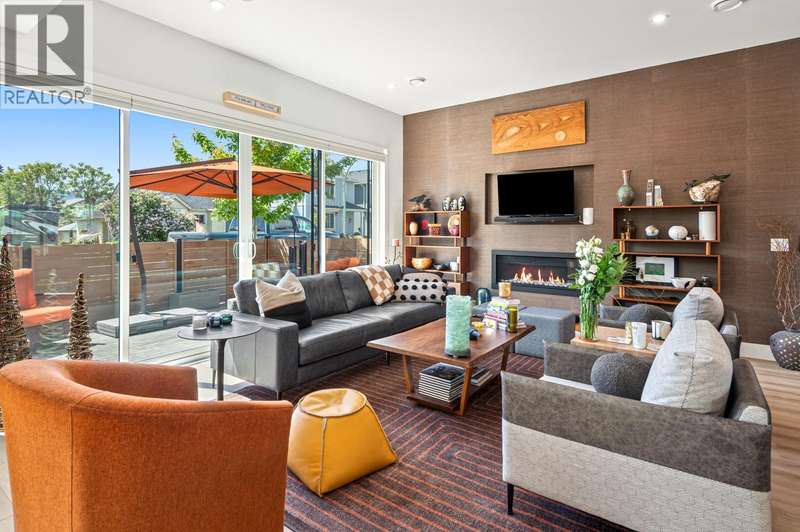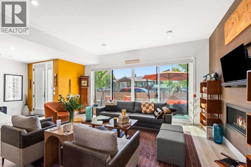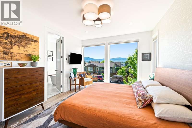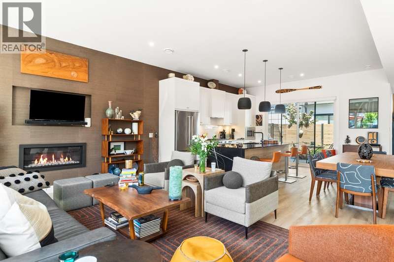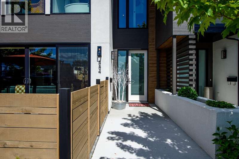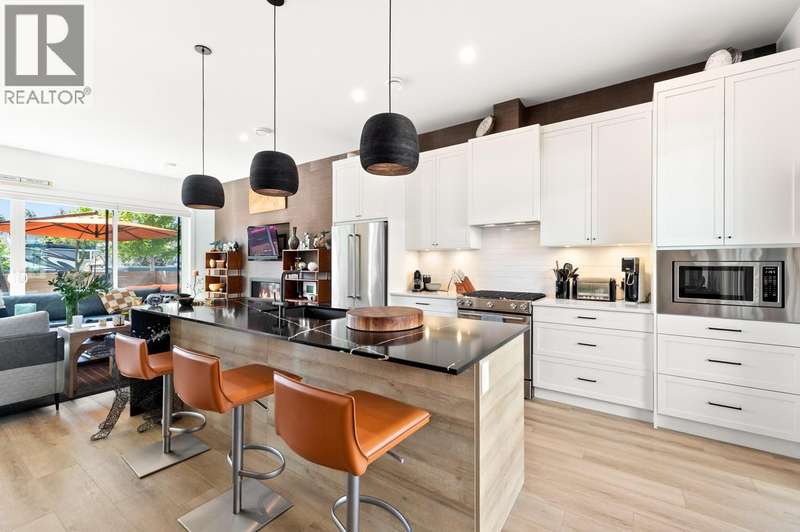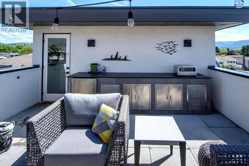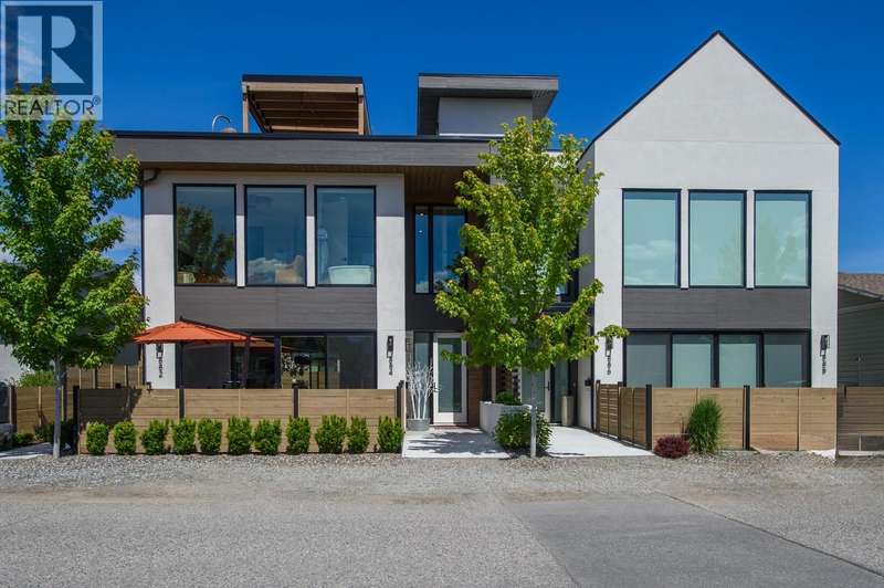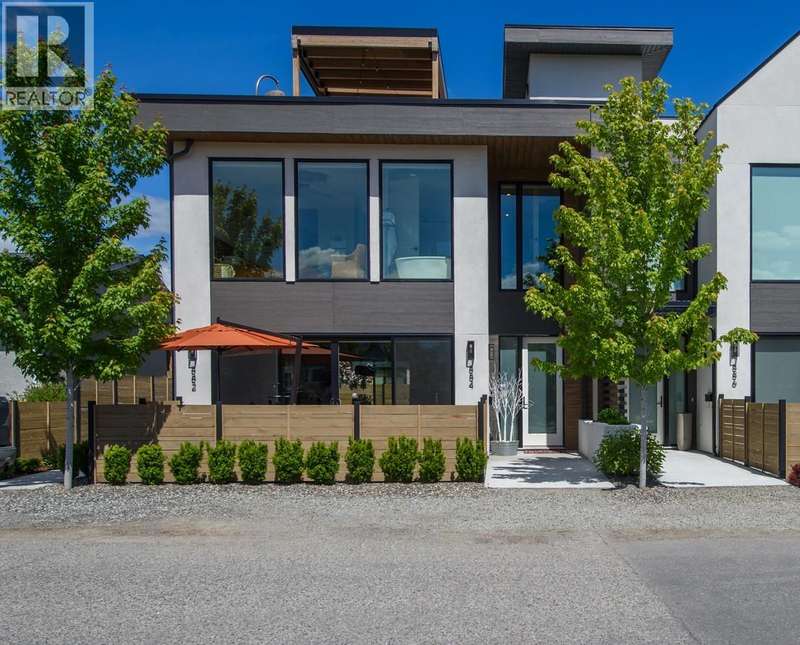 Stunning luxury townhome in the heart of Kelowna South, just steps to beaches, restaurants, shops, and cafes. This modern barn-style design features a spacious open layout, oversized windows, and a sun-soaked south-facing exposure. Enjoy 3 bedrooms, 2.5 baths, and upscale finishings throughout: vinyl plank and tile flooring, quartz counters, a 42” linear gas fireplace, and a fenced backyard. The highlight is a spectacular rooftop patio with panoramic mountain views, custom outdoor kitchen, Dekko fire pit, and automated pergola system. Thoughtfully upgraded with Lutron app-controlled lighting, custom blinds, Nest thermostat, wine fridge, custom cabinetry, river rock fireplace insert, garage storage lift, EV-ready garage, Ring security system, and more. Pets welcome—bring 2 dogs (breed restrictions apply) and 2 cats! This is your chance to own a one-of-a-kind home in one of Kelowna’s most desirable neighborhoods. (id:7434)