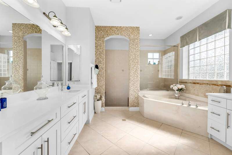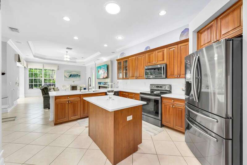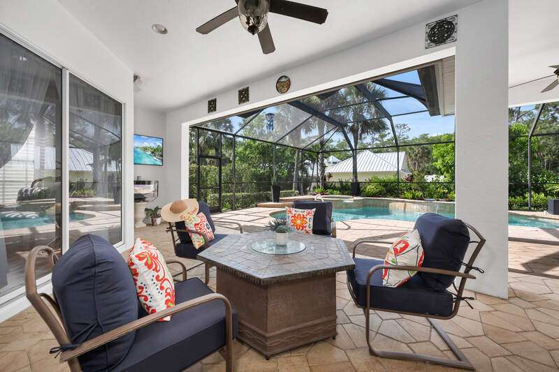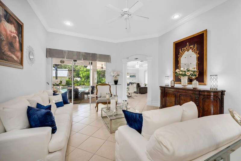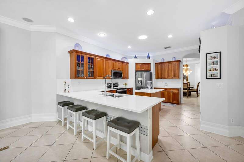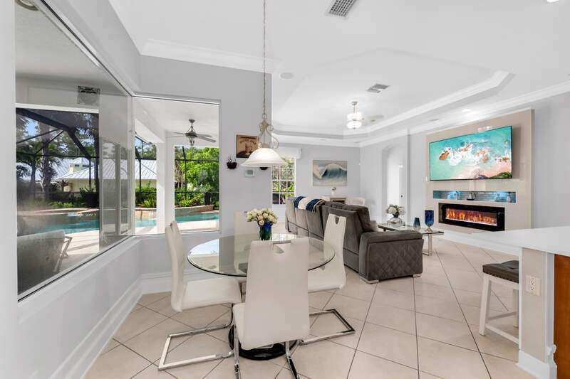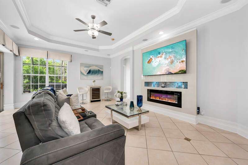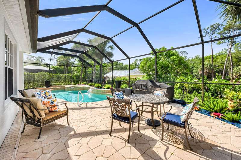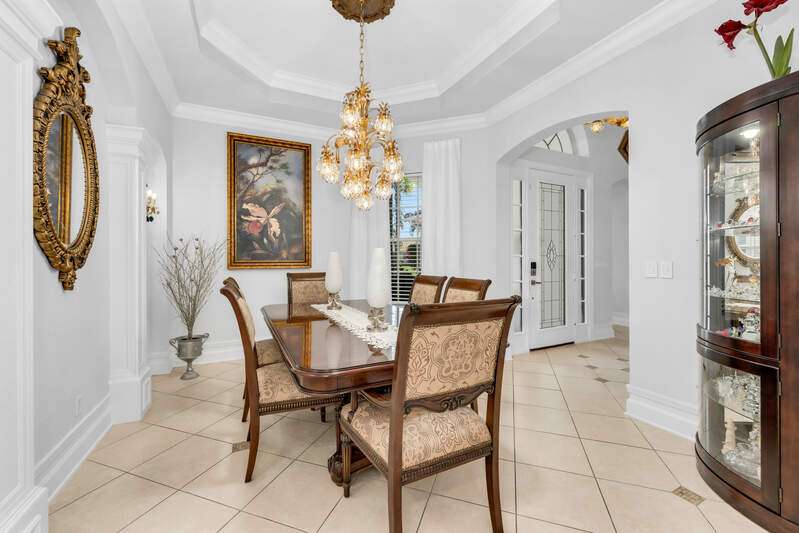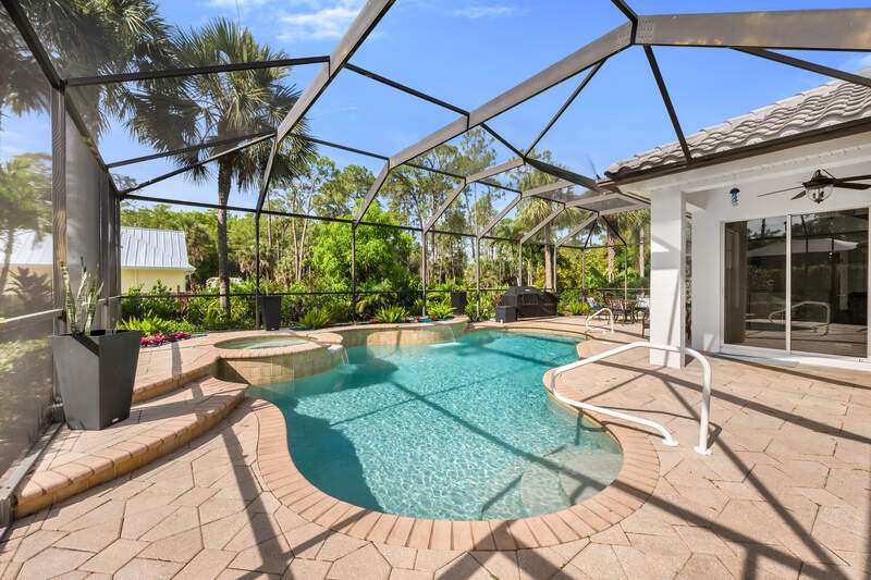 Welcome to this exquisite 5-bedroom, 4-bathroom, 3-car garage estate home, offering over 3200 square feet of living space and featuring the highly sought-after ESTRELLA floorplan in the beautiful gated community of Delasol. Meticulously maintained by its original owner and never rented, this home is truly move-in ready. The open and bright layout includes an oversized family room with double sliders leading to a covered patio, complete with a stunning pool and spa-perfect for entertaining. The upgraded kitchen is a chef's dream, showcasing 42-inch raised maple cabinets, quartz countertops, a plumbed utility island, custom backsplash, and crown molding. The spacious master suite features a large walk-in closet and a luxurious en-suite bathroom with upgraded flooring and tile work, a soaking tub, separate shower, and dual quartz vanities. Custom tile and engineered wood flooring throughout the main living areas provide both elegance and low-maintenance living. Tray ceilings and crown molding in all primary living spaces and the master bedroom add refined touches throughout the home. Additional highlights include a NEW ROOF, large formal dining and living areas, and abundant storage space. Delasol offers low HOA fees and premium amenities including a newly renovated clubhouse, fitness center, pickleball and tennis courts, basketball court, playground, and a resort-style community pool and spa. Xfinity cable and internet are also included. Conveniently located just west of I-75, this home is close to award-winning beaches, top-rated restaurants, and is part of an A-rated school district, including the new Aubrey Rogers High School. Best of all, the home is not located in a flood zone. This is a rare opportunity to own a meticulously cared-for home on a prime lot in one of Naples' most desirable communities.