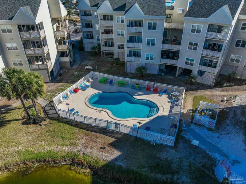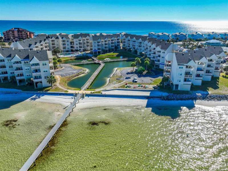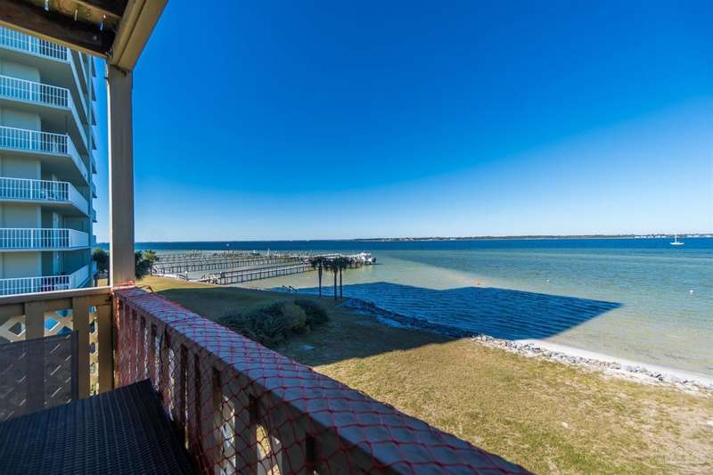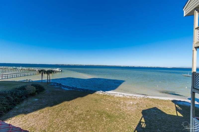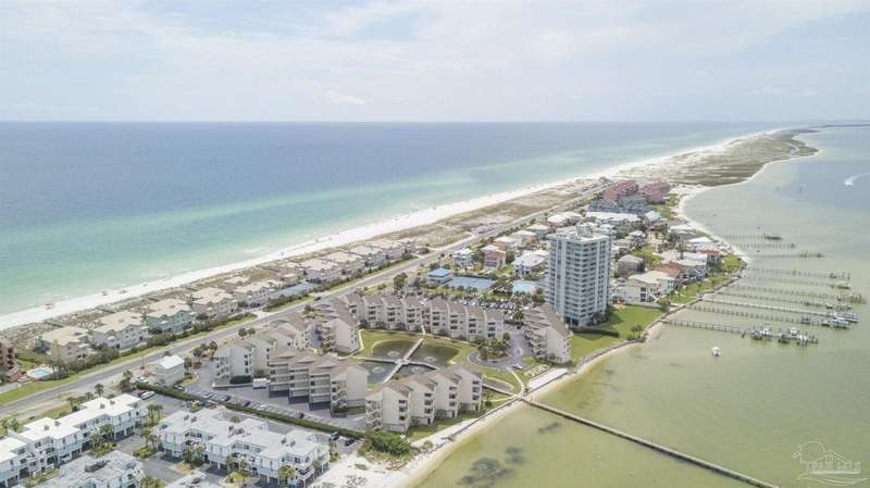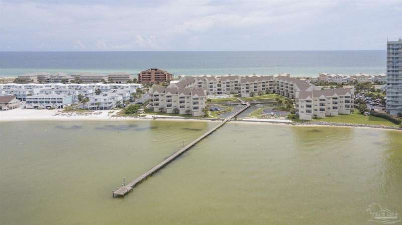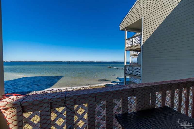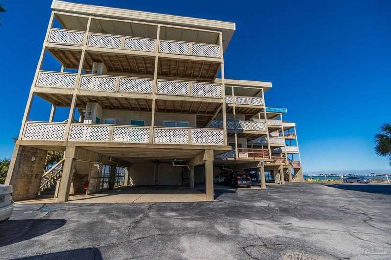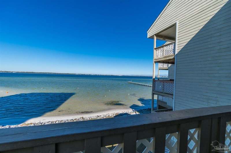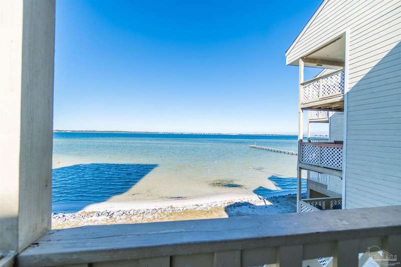 Your Gateway to Coastal Paradise Awaits! Whether you're seeking the ideal vacation retreat, an investment property, or a permanent residence, this is an incredible opportunity to own a fully furnished waterfront Baywatch condo. Revel in breathtaking views of the Sound, spectacular sunsets and boat activity. This second floor unit is tastefully furnished with coastal decor and an inviting open floor plan directly overlooking the Sound. The front bedroom has its own access to the guest bathroom, while the master bedroom overlooks the Sound and boasts its own bathroom. The covered lanai provides the perfect space for relaxation, and you'll have access to the complex's amenities, including a pool, private beach and dock, and picnic and grilling area. This unit is equipped with two covered parking spots. Only steps away from the sugar white sand and emerald green water of the Gulf of Mexico, you can indulge in miles of scenic running paths, dine at local's favorite Peg Leg Pete's, or bike to Ft Pickens State Park. Explore everything Pensacola Beach has to offer with a short drive or seasonal trolley ride. This condo is currently a Premier listing on VRBO. Unit is compliant with the complex's flooring guidelines. Entire complex has recently been painted a coastal blue. Don't miss out on this extraordinary opportunity! Embrace the enchantment of coastal living, seize your slice of paradise, and unlock the endless possibilities within this exquisite furnished Baywatch condo.