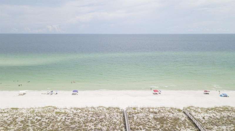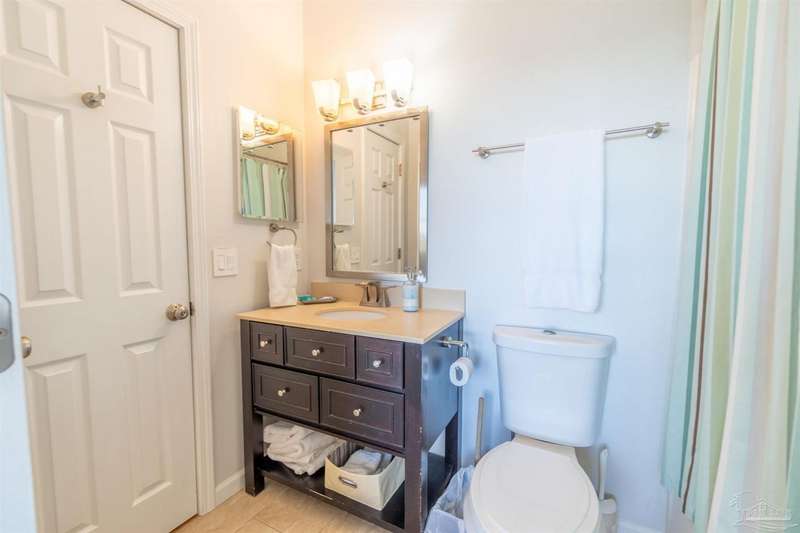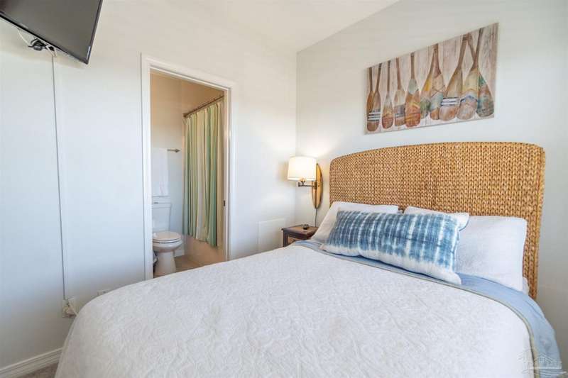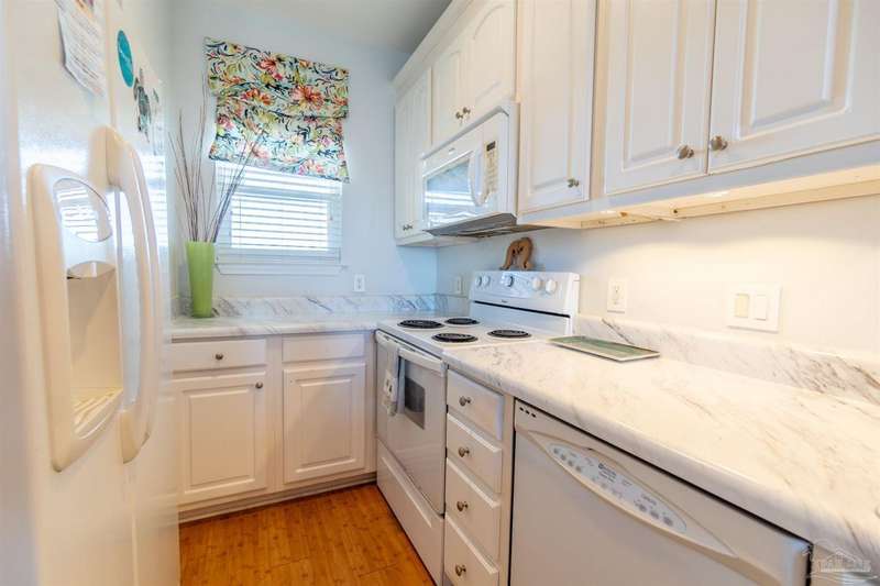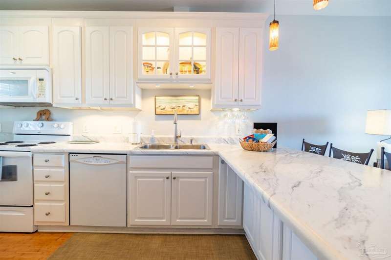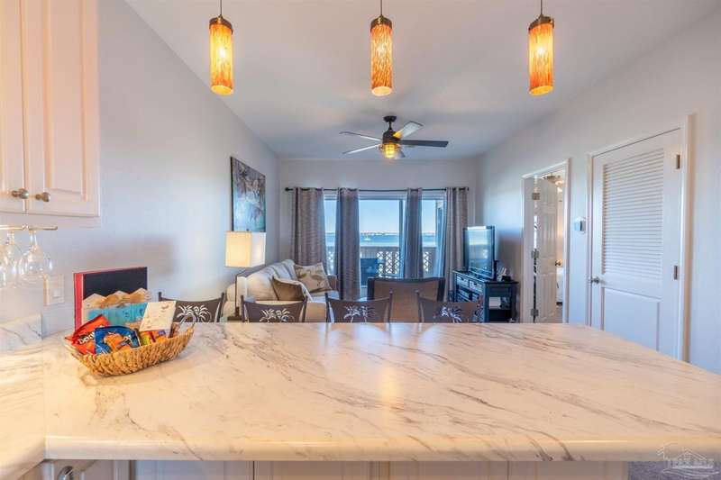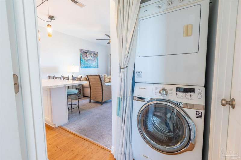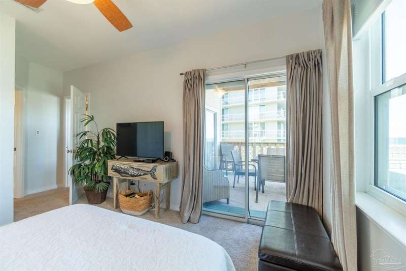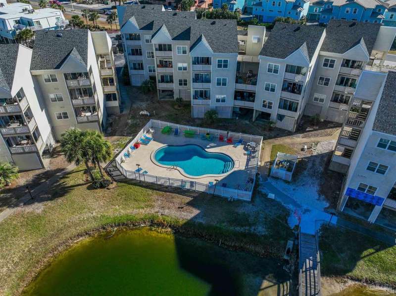 Your Gateway to Coastal Paradise Awaits! Whether you're seeking the ideal vacation retreat, an investment property, or a permanent residence, this is an incredible opportunity to own a fully furnished waterfront Baywatch condo. Revel in breathtaking views of the Sound, spectacular sunsets and boat activity. This second floor unit is tastefully furnished with coastal decor and an inviting open floor plan directly overlooking the Sound. The front bedroom has its own access to the guest bathroom, while the master bedroom overlooks the Sound and boasts its own bathroom. The covered lanai provides the perfect space for relaxation, and you'll have access to the complex's amenities, including a pool, private beach and dock, and picnic and grilling area. This unit is equipped with two covered parking spots. Only steps away from the sugar white sand and emerald green water of the Gulf of Mexico, you can indulge in miles of scenic running paths, dine at local's favorite Peg Leg Pete's, or bike to Ft Pickens State Park. Explore everything Pensacola Beach has to offer with a short drive or seasonal trolley ride. This condo is currently a Premier listing on VRBO. Unit is compliant with the complex's flooring guidelines. Entire complex has recently been painted a coastal blue. Don't miss out on this extraordinary opportunity! Embrace the enchantment of coastal living, seize your slice of paradise, and unlock the endless possibilities within this exquisite furnished Baywatch condo.
