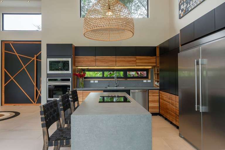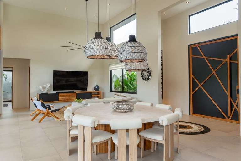 From the moment you arrive, a mature Guanacaste tree and a meticulously landscaped garden set the tone. Inside, a grand pivot door opens to a light-filled living space with full-height sliding glass doors that dissolve the boundary between indoors and out.