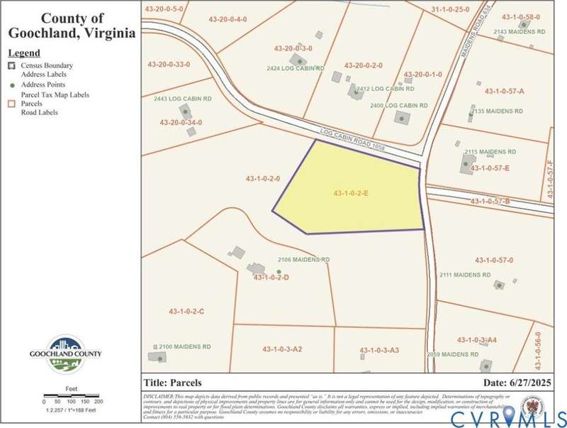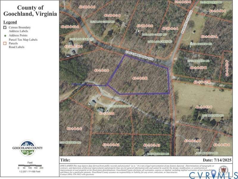 New Homesite totaling 3.074 acres. Property offers beautiful 80+ year old hardwoods. Located in Maidens VA - Lickinghole District. 2 miles to Goochland's New Elementary School, Middle & High School. 1.5 Miles to J Sargent Reynolds Community College, YMCA, Courthouse & 14 miles to Short Pump. Lot is perked for conventional septic up to 4 bedroom home. Approved driveway access off Log Cabin Road. NO HOA!! Underground Power & Internet (Comcast). Quiet dead end road with absolutely no road noise. Seller has multiple builders available upon request. Seller has another lot with 3 acres