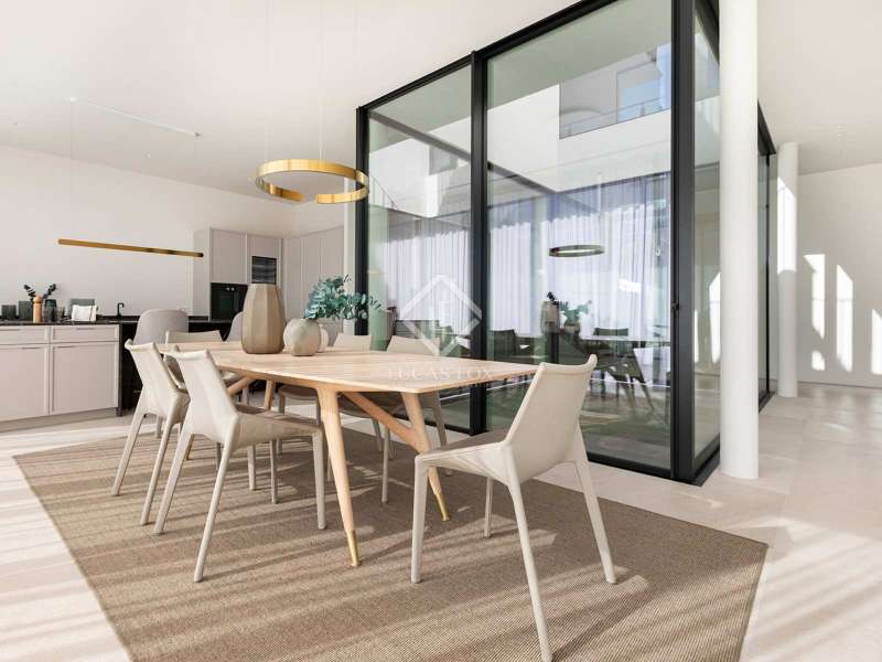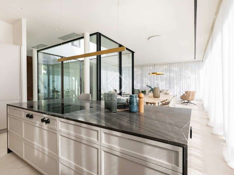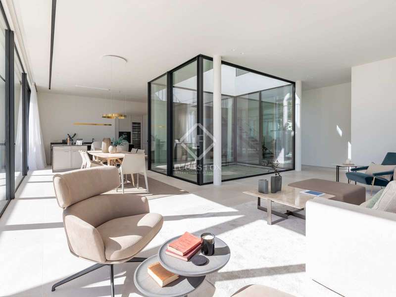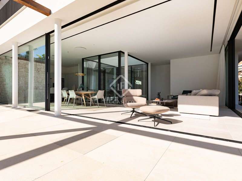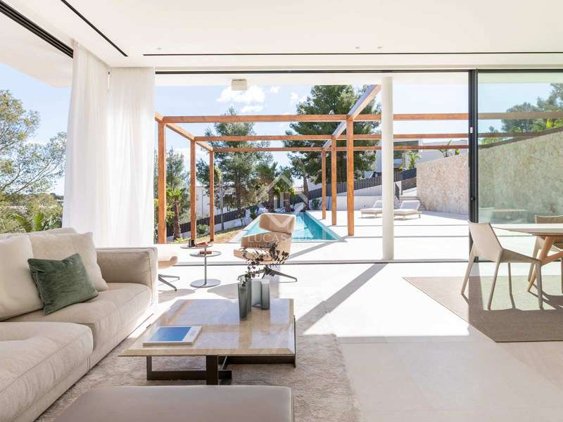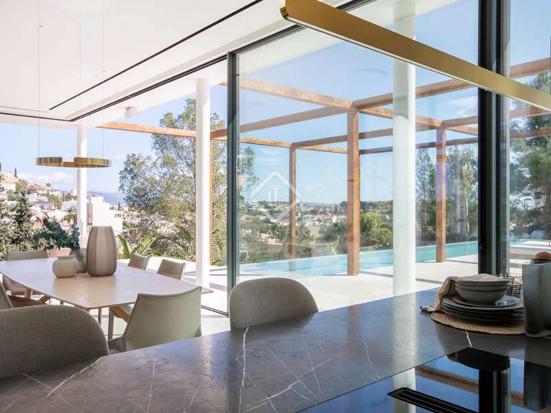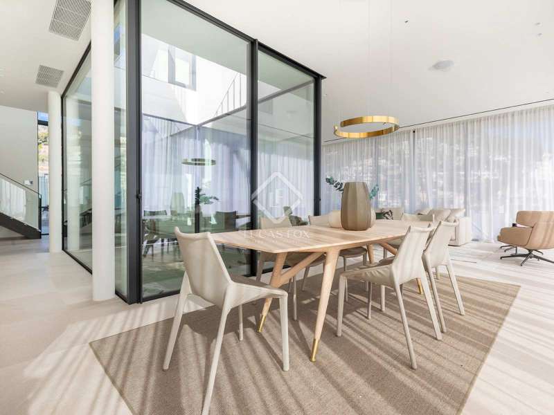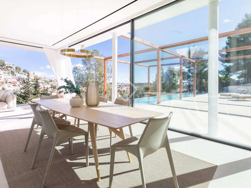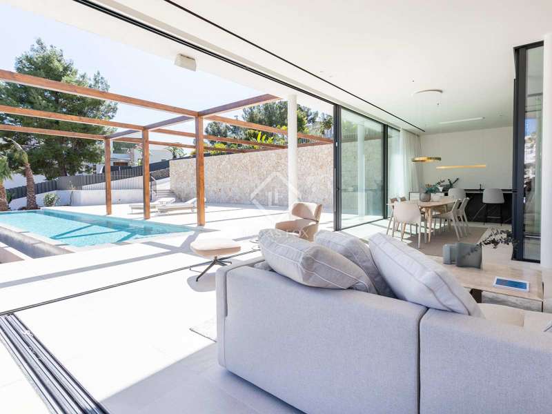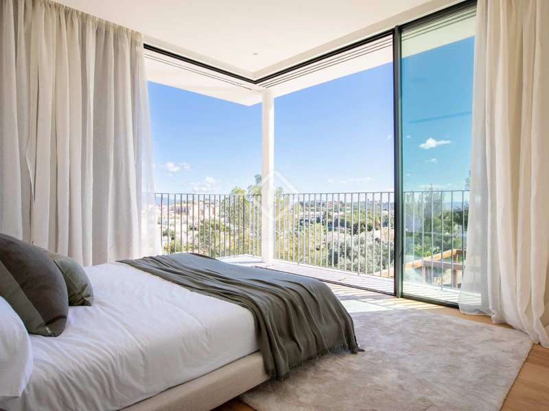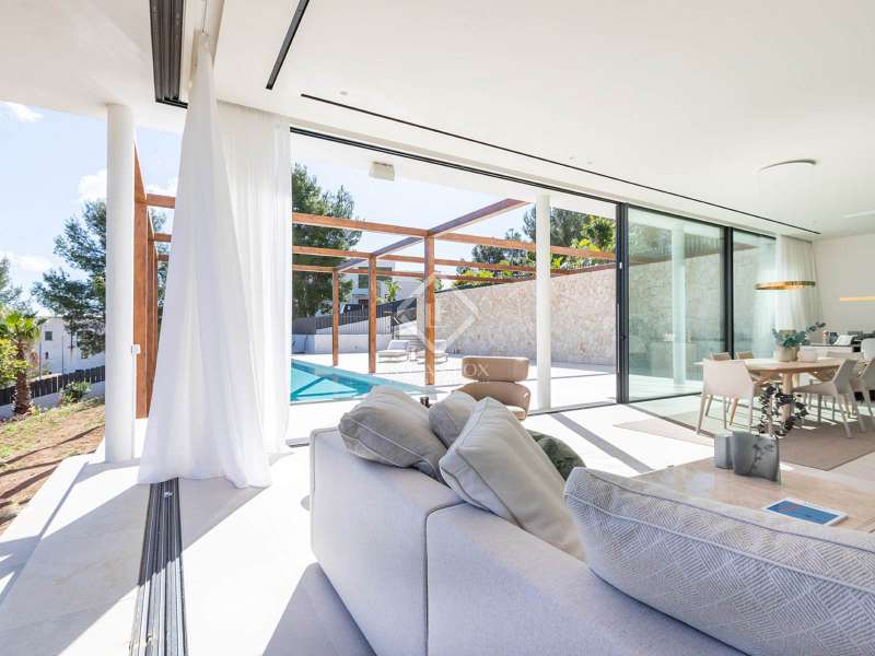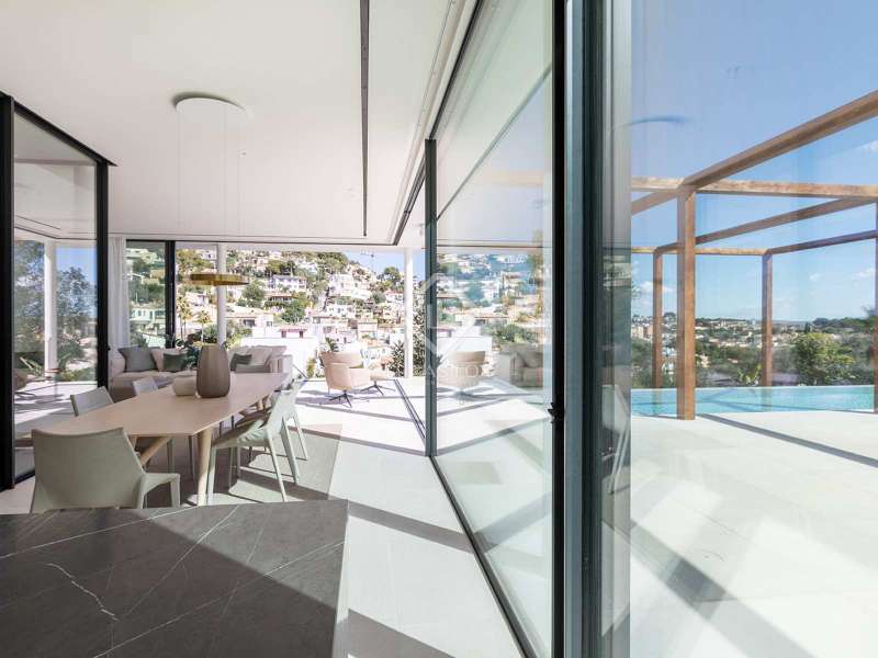 This luxury villa offers over 500 square metres of sophisticated living space, seamlessly blending indoor and outdoor environments. Key features of this exceptional property include a private pool, expansive terraces, a central atrium that floods the interior with natural light, and underground parking for three cars. Situated on gently sloping land, the villa is surrounded by landscaped gardens with an infinity pool at the lowest point. The terraces and living areas are oriented towards the mountains, enhancing the open-concept interior connection to the natural surroundings. At the heart of the ground floor is a plant-filled atrium, illuminating the space with natural light. Radiating from this central feature are the entrance hall and staircase, a pantry/utility room, a double bedroom with an en suite bathroom, and a spacious open-concept kitchen, dining, and living room. These areas are arranged on split levels, reflecting the terraced design of the outdoor spaces. Floor-to-ceiling glass along one side of the living area offers uninterrupted views of the terrace dining and seating areas, maximizing the potential for outdoor living. The first floor comprises three additional double bedrooms, each with its own bathroom. Two of these bedrooms face the atrium, ensuring plenty of natural light, and have access to a shared terrace with stunning countryside views. This modern home is constructed to the highest standards, using the finest materials and top-quality appliances. The consistent use of pale woods, natural stone cladding, and abundant glass throughout the interior and exterior creates a cohesive aesthetic. This design ensures the property is warm, bright, and contemporary, while providing a close connection to nature and convenient access to Palma and the coast. Please contact us to arrange a viewing.