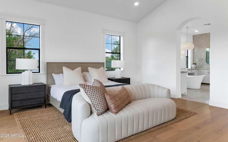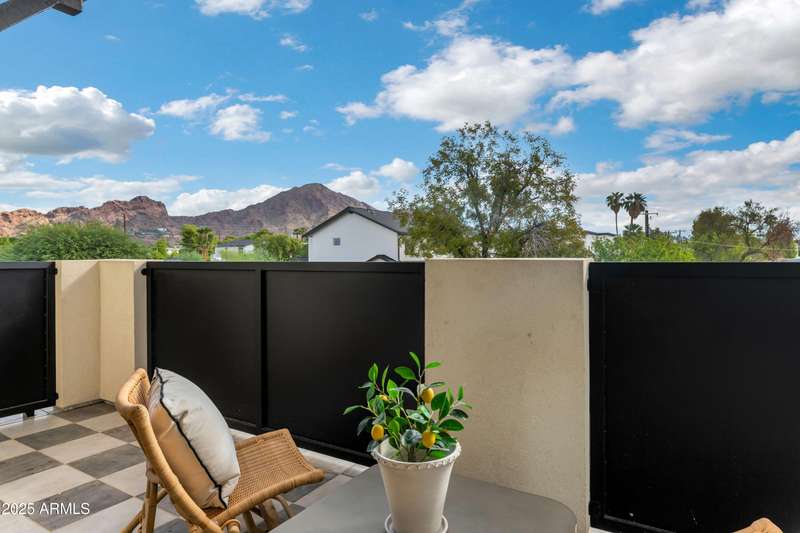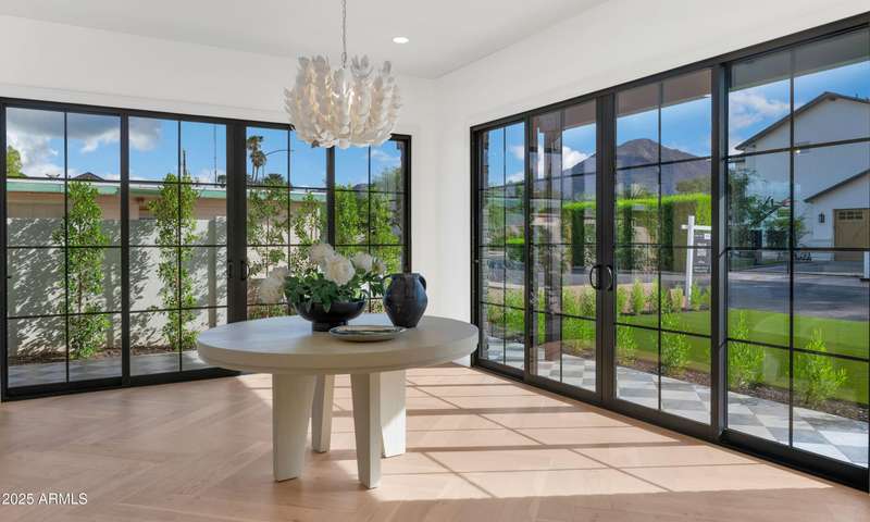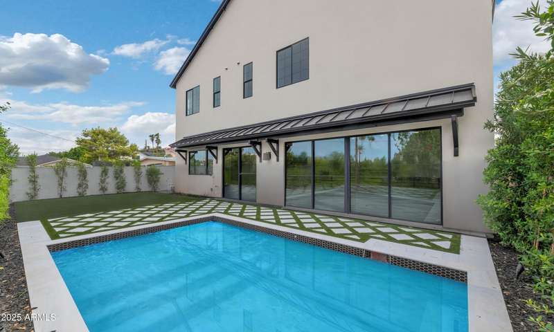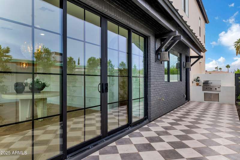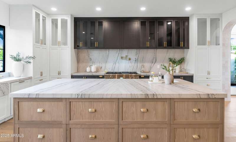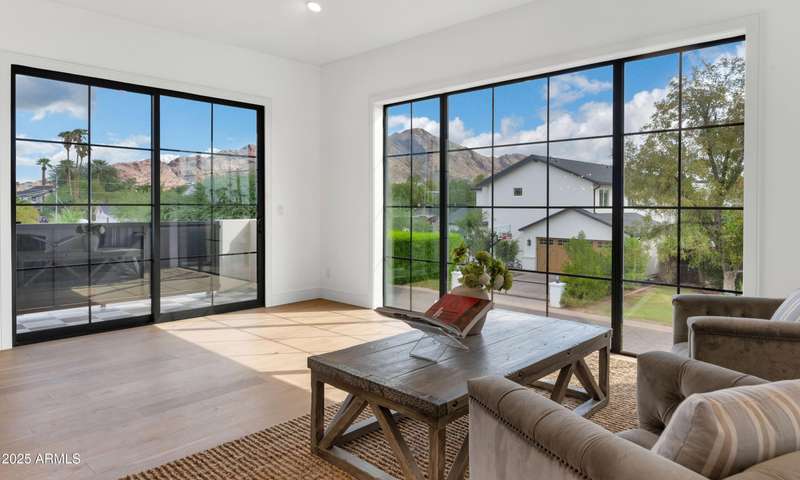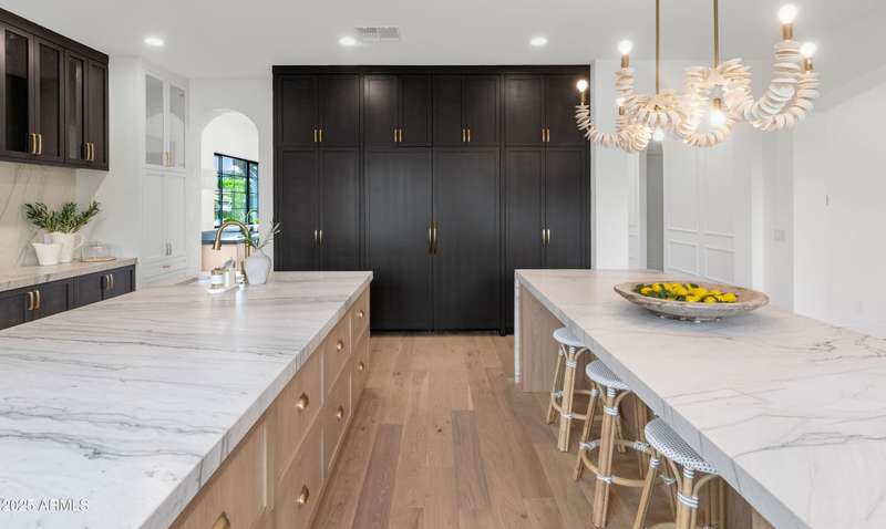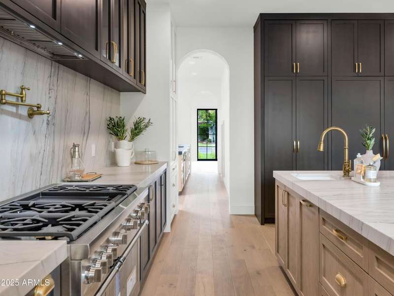 Experience elevated Arcadia living with this stunning new build in the Hopi school district. Spanning 4,557 sq ft, this thoughtfully designed home offers 5 bedrooms, 5.5 bathrooms, a formal dining area and an upstairs flex space, all showcasing breathtaking Camelback Mountain views. The home features a chef's dream kitchen complete with dual oversized islands & Thermador appliances. A walk-through butler's pantry offers direct access to the built-in outdoor grill, perfect for entertaining. The luxurious primary suite boasts Camelback Mountain views and a spa-like marble bathroom. All guest bedrooms are ensuite, with two featuring unique loft spaces ideal for kids or additional play areas. Step outside to a fully landscaped backyard oasis, complete with lush ficus, a new pool, and room to relax or entertain. Curb appeal shines with a cobblestone driveway, custom wood garage door, brick accents, and black-and-white checkered flooring at the outdoor entry.