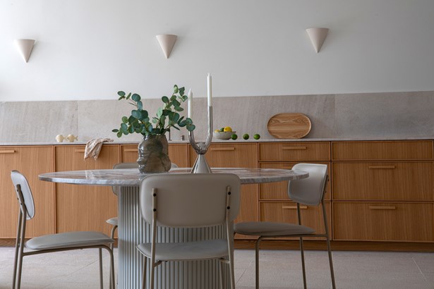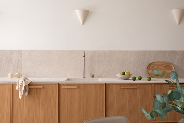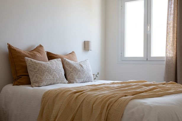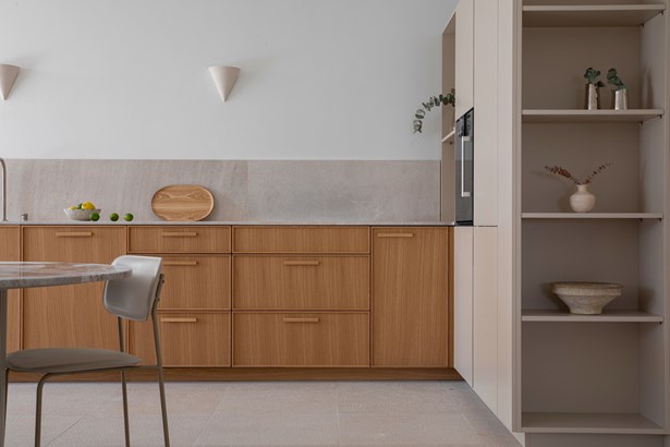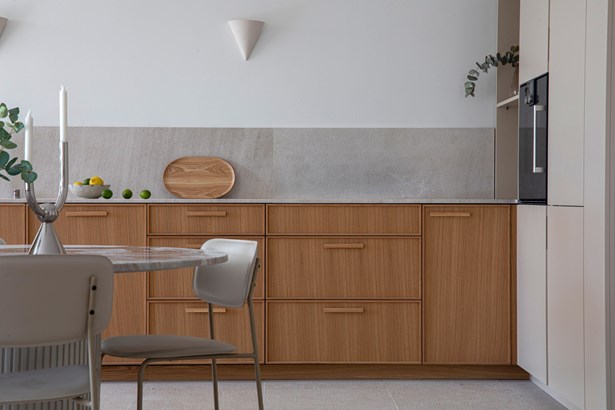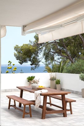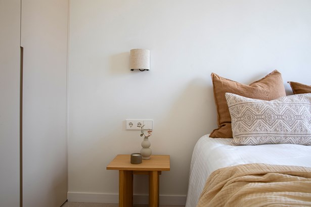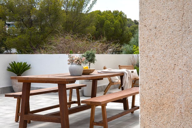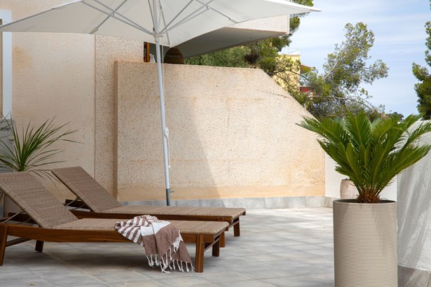 Nestled in the serene and highly sought-after residential area of Carrer de Barranc in Cas Català, this exceptional ground-floor apartment offers a rare combination of indoor luxury and outdoor Mediterranean living. With a total area of 200 m²—comprising 100 m² of elegant interior space and a remarkable 100 m² terrace—this property stands out for its stunning sea views, high-end finishes, and tranquil ambiance.Upon entering, you are welcomed by an open-plan living and dining area filled with natural light, featuring premium Zarci natural stone floors that create a sense of timeless sophistication. The designer kitchen is equipped with top-of-the-line Gaggenau appliances, elegant oak finishes, and a beautiful Binissalem marble countertop, making it both functional and stylish—ideal for those who appreciate quality and design.The apartment offers three generously sized bedrooms, all with breathtaking views of the sea. The master suite includes a luxurious en-suite bathroom and provid