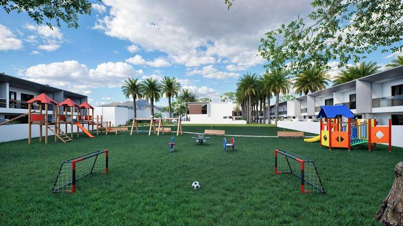 Modern two-bedroom townhouse in a new private condominium called Zion Oasis, with private pool and garden, about 10 minutes from Burgau Beach, for sale in Almádena, Luz, Algarve. This 2-bedroom villa, in a privileged location just a few minutes from the beach, has been thought out in detail to offer convenience, luxury, comfort and privacy to its residents. With two floors and spacious areas, the villa comprises a small garden. Upon entering the house, we have access to the fantastic open-plan living room with dining room and fully-equipped kitchen with modern built-in appliances. There is also access to the terrace with barbecue and private pool, a service bathroom, and the stairs to the upper floor, where the bedrooms are, both with en-suite bathrooms and balconies. This villa is an excellent option for a permanent residence or second home. With stunning beaches nearby, renowned golf courses, quality restaurants, easy access to the EN125 national road and the A22 highway, and Faro International Airport is about an hour away. CHARACTERISTICS: Plot Area: 186 m2 | 2 002 sq ft Area: 140 m2 | 1 507 sq ft Deployment Area: 72 m2 | 775 sq ft Bedrooms: 2 Bathrooms: 3 Energy efficiency: A+ FEATURES: 2 suites Equipped kitchen Balconies Terrace Garden Swimming pool