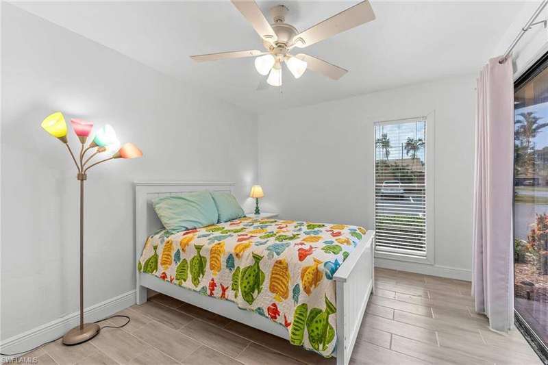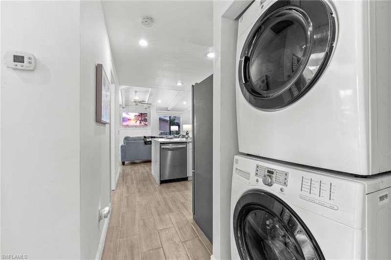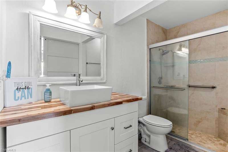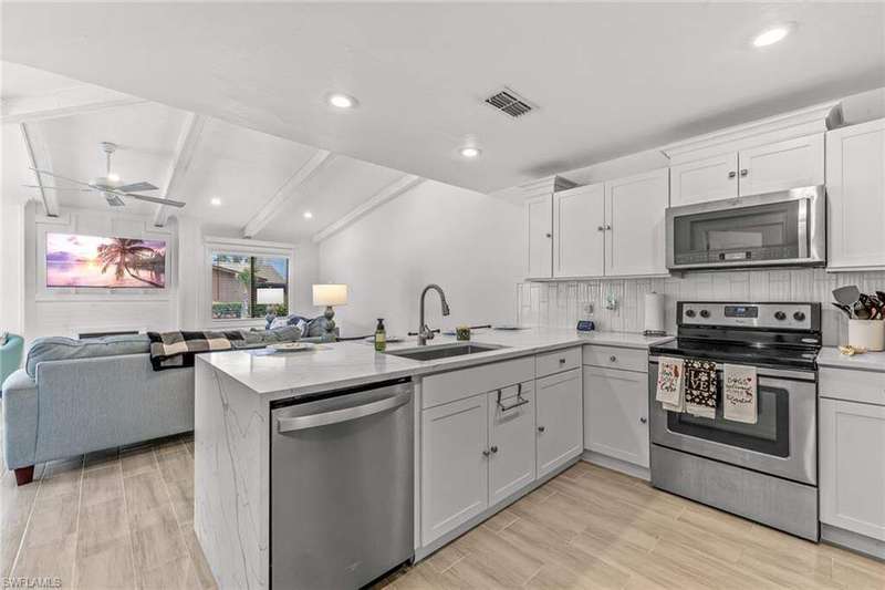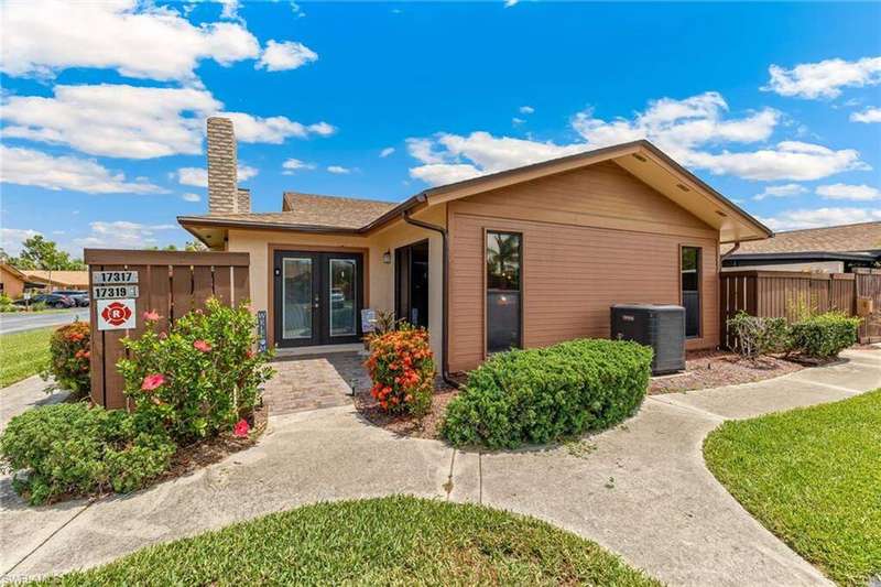 GREAT VALUE + PRICE REDUCTION....Perfectly positioned with easy access to FGCU, Estero/Bonita Springs and Naples, this affordable 3B/2BA unit is ideal for first time home buyers or investors looking to build their portfolio. The completely remodeled open floor plan features a vaulted ceiling w/ beams, electric fireplace, (2024) A/C unit, (2024) water heater, (2023) washer/dryer, (2018) roof and modern updates with an inspiring crisp/clean interior color palette throughout to compliment the brand new plank tile flooring. Kitchen boasts white shaker cabinets, cool wavy tile backsplash, dramatic quartz waterfall counter w/ bar seating + stainless steel appliances. The primary ensuite and guest bath have been updated as well. Even better.... this bright and sunny villa offers several sliding glass doors to 2 separate outdoor open patios to unwind with a book or favorite beverage. Community is pet-friendly and less than 10 miles from RSW airport. Truly a coastal get-a-way you'll love coming home to.