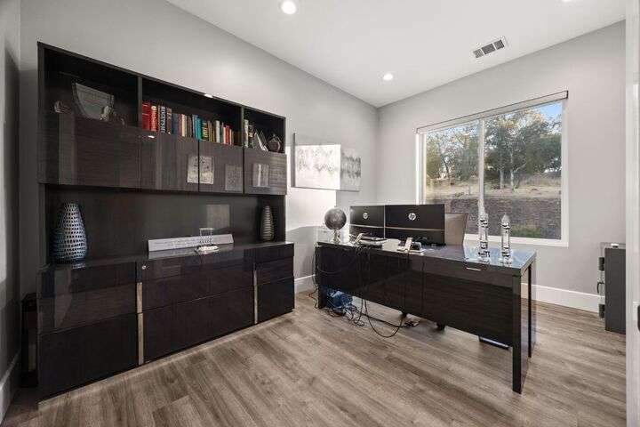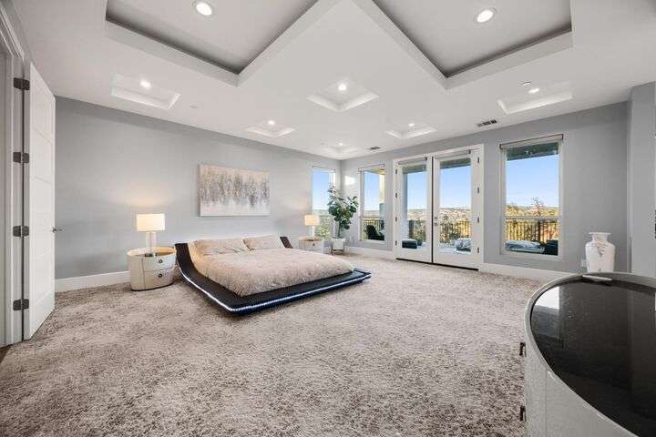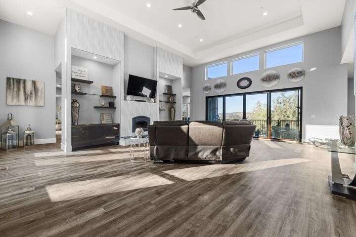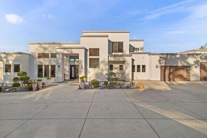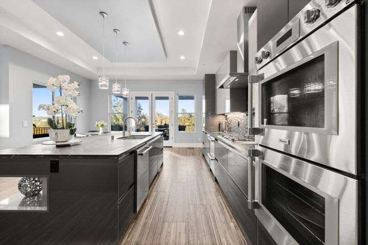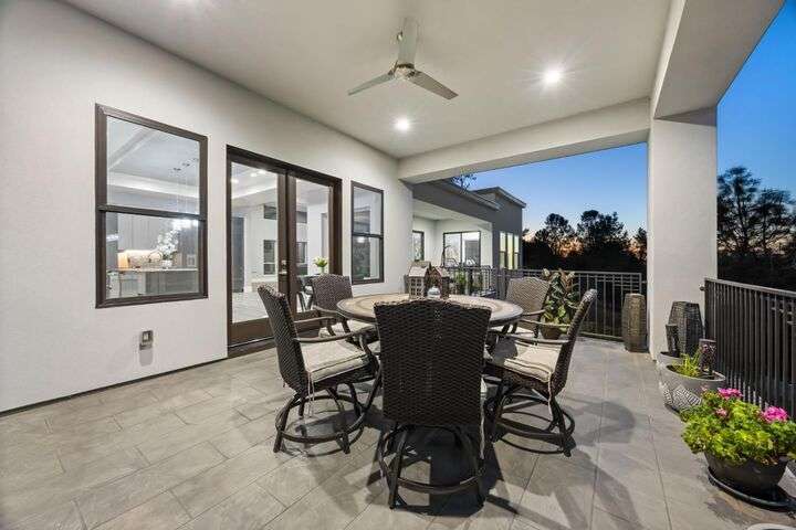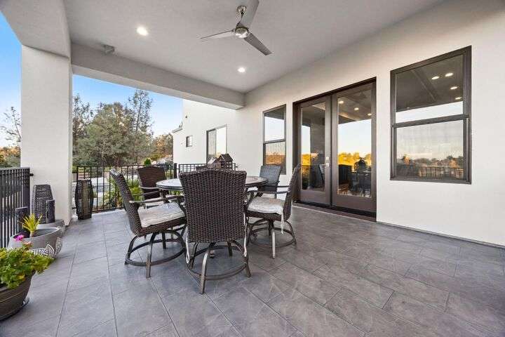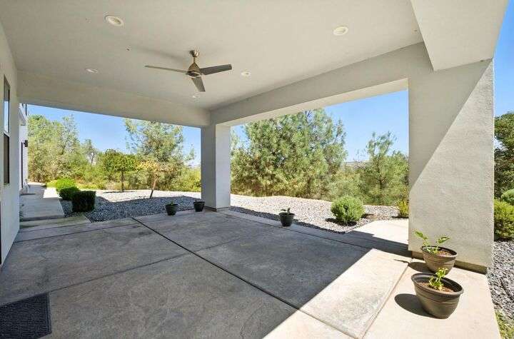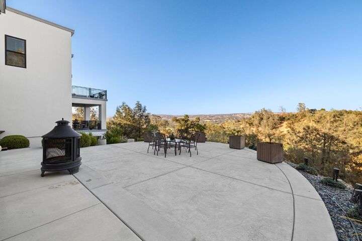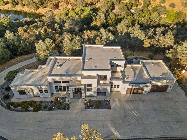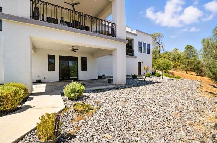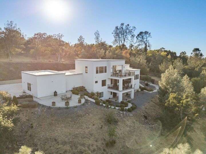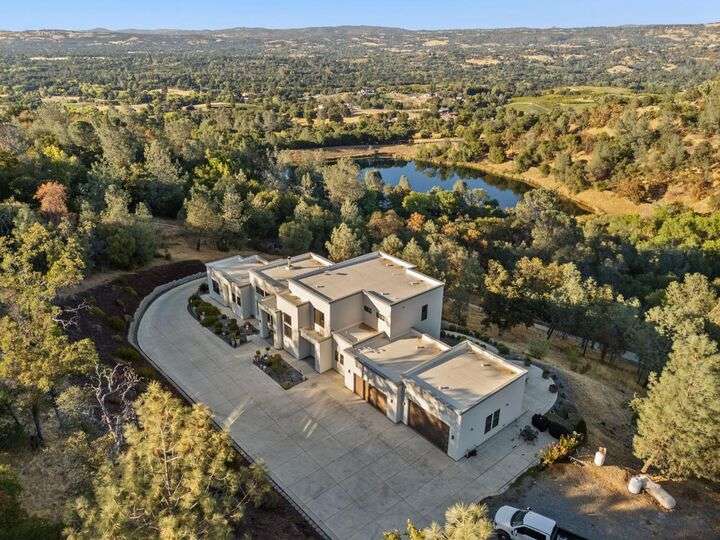 Luxury mountain top mansion - exquisitely appointed contemporary work of art with one of Northern California's finest views. Unbelievable value: over 5,000 sq ft, floating stainless cable staircase, dramatic double-height ceiling. Entertainer's kitchen with Thermador appliances, built-in panel refrigerator, wall coffee maker, pot filler, prep sink, and gloss European flat front solid wood cabinetry. Soaring floor-to-ceiling fireplace, remote-controlled window treatments. Multiple balconies with fully tiled flooring overlooking canyon and private reservoir. Paved road leads to sprawling driveway, finished oversized garage, and ample parking. Lower level perfect for fitness facility with bathroom/shower or multigenerational living. Built in 2020 - construction and detail impossible to duplicate at this price. Minutes from town and freeway, yet feels like a private compound with auto-controlled front gate on 6 acres. Primary suite with private office, walk-out balcony, spa-like primary en suite with rainfall shower, and soaking tub. MUST SEE!