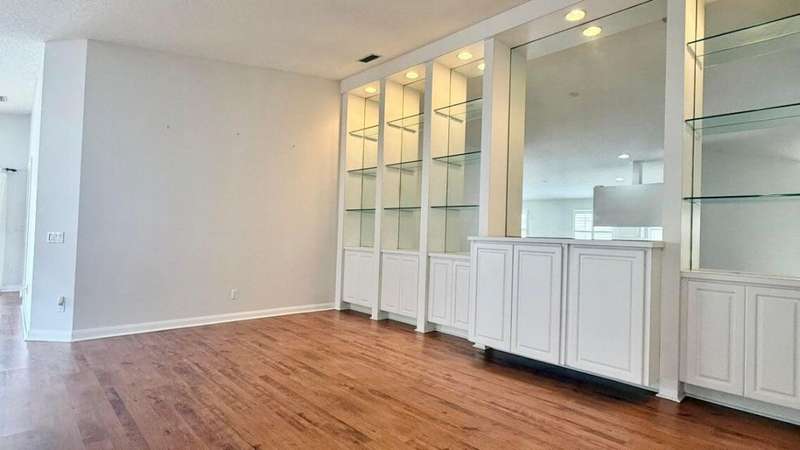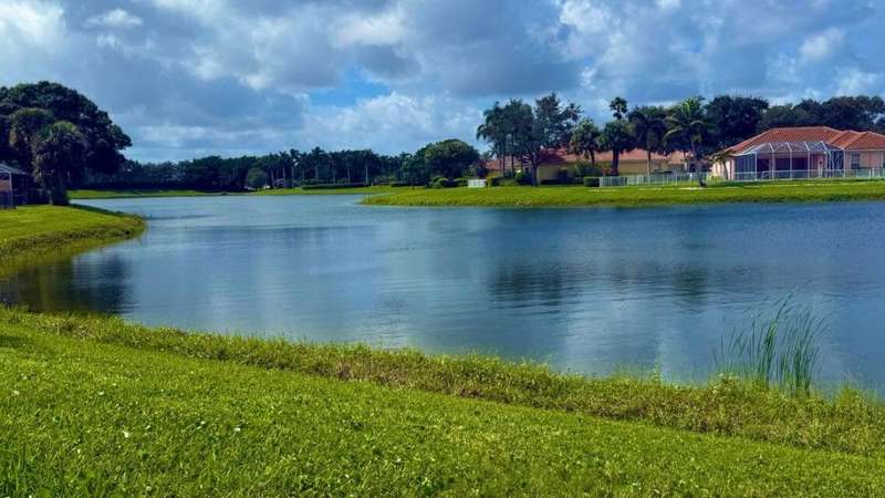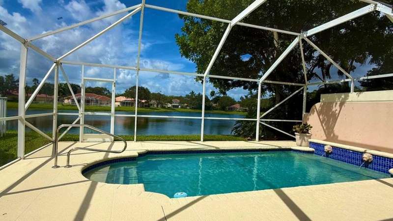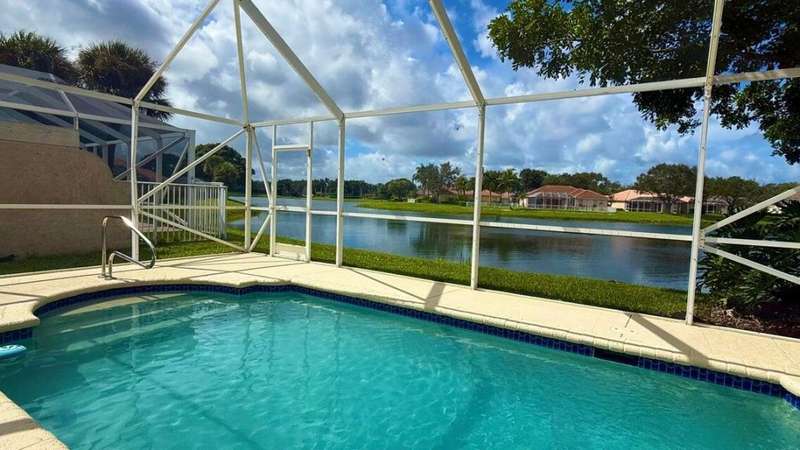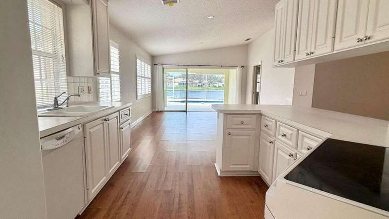 Spectacular wide lake view from the custom screened pool of this 2BR/2BA Capri model villa. Ideally located just a short walk from the Town Center with Centannis Restaurant, community pools, fitness center, and more. New laminate flooring in main living areas. The Great Room offers a built-in entertainment unit and vaulted ceilings for a bright, open feel. Accordion storm shutters, laundry room with full-size washer, dryer, and utility sink, central vacuum, and alarm system. Enjoy serene lakefront living with resort-style amenities right at your doorstep!