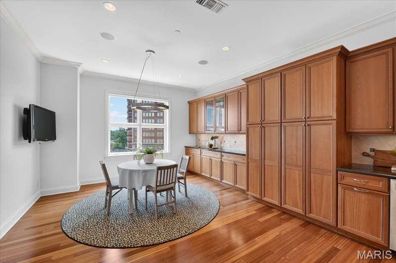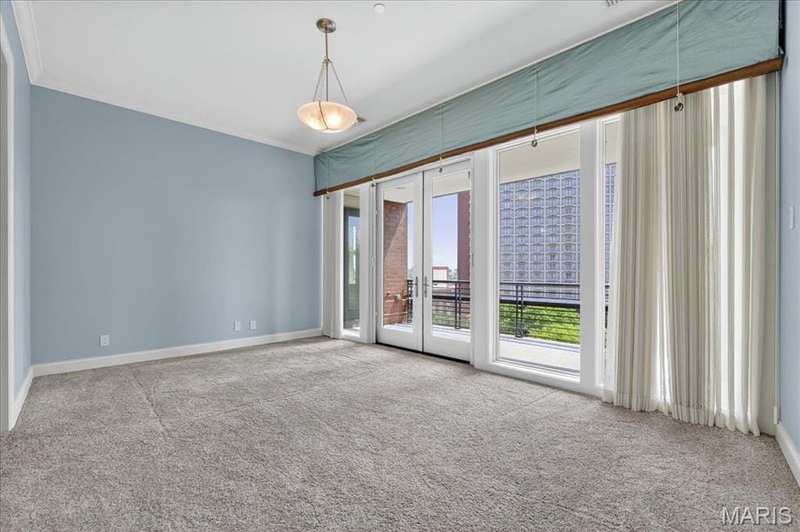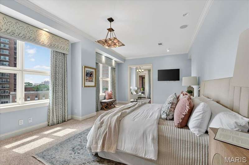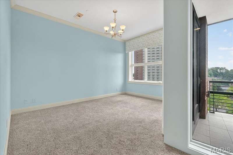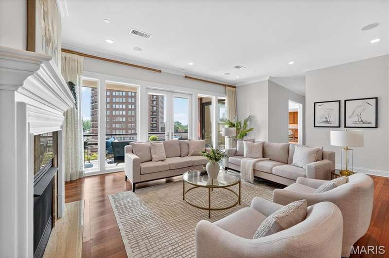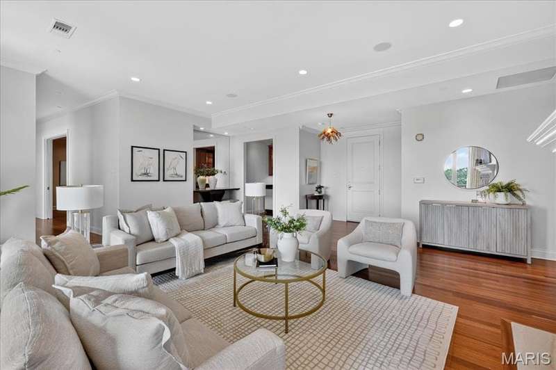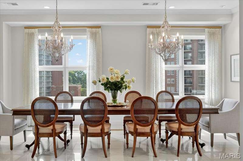 A rare opportunity to own a stunning 4-bed condo in the exclusive The Crescent, located in the heart of downtown Clayton. This 6th-fl residence offers sweeping views of Clayton and the St Louis skyline from 2 inset balconies. An expansive open floor plan with 9-10 foot ceilings, floor-to-ceiling windows, and high-end finishes throughout. Rich wood floors, custom built-ins, and gas fireplace create an inviting ambiance. The gourmet eat-in kitchen with Wolf and SubZero appliances flows into the spacious dining and family rooms, perfect for entertaining. The luxurious primary suite features 2 custom closets, remote operated shades, and a spa-like bath. 3 additional beds with ensuite baths provide ultimate comfort and privacy. Addtl. highlights include an office, sitting rm, 2 laundry rms, and 4 parking spaces. Enjoy world-class amenities such as a fitness center, concierge, dog park, secure heated garage, 24-hour doorman, valet, onsite manager, moments from fine dining and shopping. Location: Interior Unit