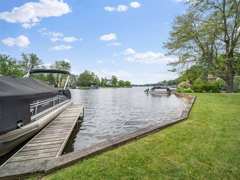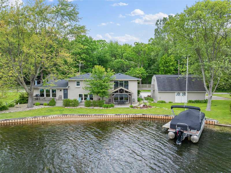 Welcome to Lake Life on All-Sports Strawberry Lake! This stunning 4-bedroom, 3-bath lakefront home offers 125 feet of private waterfront on one of Michigan’s desirable chains of lakes. With over 3,000 sq ft of living space, you’ll enjoy sweeping views, warm finishes, and comfortable spaces designed for both entertaining and relaxing. Step into the main living area with soaring ceilings, a wall of windows overlooking the lake, and a cozy loft above. The open-concept layout features a beautifully updated kitchen with custom cabinetry, island seating, fireplace and an expansive dining area that comfortably fits a crowd—all with panoramic water views. Cozy up in a spacious family room with a lodge-like feel, stone fireplace, media center, and easy access to the backyard and lake. Whether you’re enjoying coffee on spacious deck under the covered gazebo or sunset cruises on the water, this home is made for year-round enjoyment. Additional features include a large pole barn with space above ready to be finished for extra living quarters, a second lot across the street offering 2.30 acres of added privacy with unlimited potential. This is more than just a home—it’s a retreat. Whether it’s fishing, boating, or gathering with friends, Strawberry Lake living delivers a lifestyle you’ll treasure.