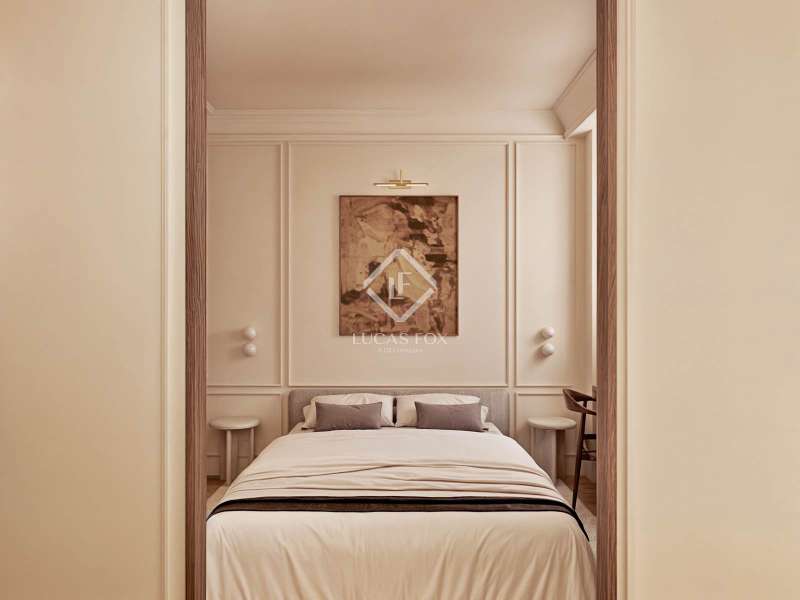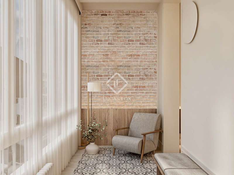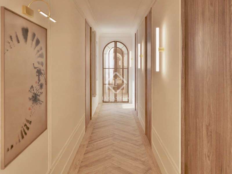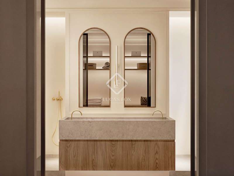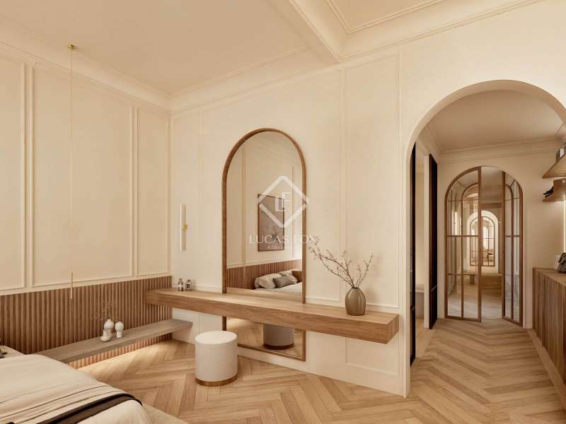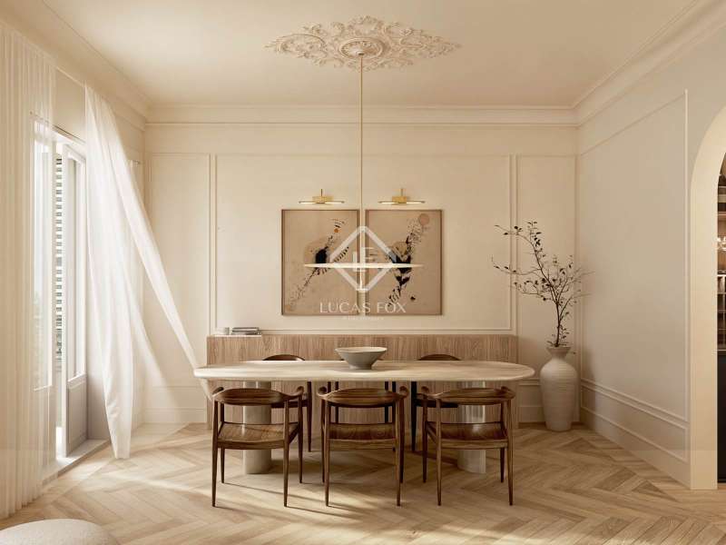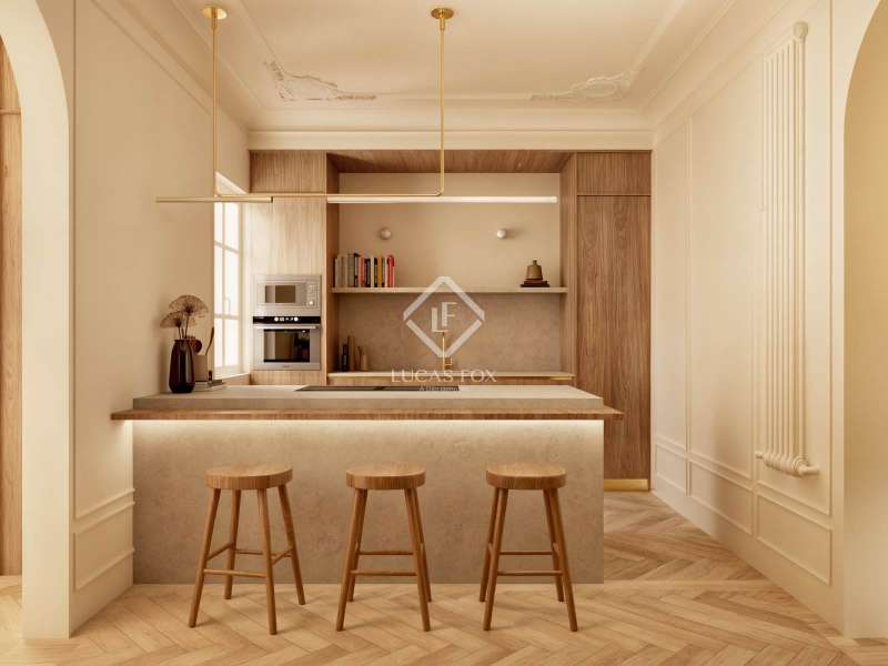 Discover an unparalleled living experience with this exceptional property set in the heart of Barcelona’s coveted Eixample district. Just a short stroll from Passeig de Gràcia and Rambla Catalunya, this elegant home is currently undergoing a meticulous renovation to the highest standards. Here, timeless modernist craftsmanship is reimagined through a contemporary lens to deliver the perfect blend of historical charm and modern-day luxury. Boasting 179.49 m² of refined interior space, this residence offers a harmonious balance of architectural heritage and sophisticated design, all within one of the most sought-after neighbourhoods in the city. The journey begins at the welcoming entrance, where a restored modernist window sets the tone, framed by custom oak cabinetry and warm wooden panelling. A striking mix of original modular ceilings, natural oak parquet flooring with brass detailing, and ambient Artemide Dioscuri wall lights evokes an immediate sense of elegance. The living room is a tranquil, light-filled space where original mouldings and rosettes seamlessly meet contemporary finishes. Custom oak furnishings in soothing neutral tones complement the rich textures of the natural wood flooring, creating an inviting setting ideal for both relaxing and entertaining. In the dining area, elegance continues with an organic travertine stone table, surrounded by handcrafted wooden chairs and illuminated by the sculptural DOT lamp by Norman Foster. Thoughtful oak detailing enhances the refined ambiance throughout. The kitchen is a true centrepiece of the home, sleek, functional, and crafted to the highest specifications. Designed with natural elegance in mind, it features travertine stone surfaces across the island, countertops, and backsplash, perfectly complementing the warm natural oak parquet flooring in herringbone pattern. Fully equipped with premium appliances by Miele, this kitchen includes a panel-ready refrigerator (KDN 7724 E Active), panel-ready dishwasher (G 5350 SCVI Active Plus), a built-in oven (H2861-1 B 125) and microwave (M 7240 TC) in CleanSteel finish, and a vinoteca (KWT 7112 IG) for optimal wine storage. At the heart of the island lies the Miele KMDA 7473 FL-U Silence induction cooktop with integrated extractor, ensuring both high performance and visual harmony. A Franke Mythos Masterpiece pull-out spray faucet and Mythos FRE 210/110-50 sink complete the ensemble with both elegance and durability. Atmosphere and functionality are further enhanced by designer lighting, including a Marset Ambrosia pendant lamp and Dioscuri wall fixtures by Artemide, creating a warm and sophisticated culinary environment. The bedroom offers a serene retreat, where natural textures and soft lighting craft a cosy, restful environment. Integrated desks, bespoke oak wardrobes, and IRSAP radiators pair beautifully with travertine night stands and Artemide lighting, combining comfort and style with effortless ease. The main suite is a sanctuary of balance and calm, featuring symmetrical mouldings, generous light, and refined detailing throughout. Indirect lighting from Davide Groppi’s MISS pendants and Marset Ambrosia wall sconces add atmospheric warmth. An adjoining dressing room continues this theme of understated luxury, featuring arched oak-and-glass dividers, soft lighting, and integrated travertine night stands. The custom floor-to-ceiling oak wardrobes are equipped with LED lighting and a dedicated accessories drawer, set against a backdrop of original mouldings and period tile floors, a respectful nod to the building's modernista heritage. The en-suite bathroom offers refined relaxation with a blend of travertine stone, micro cement, and warm wood tones. A double vanity with integrated lighting, a spacious walk-in shower, and an elegant built-in bathtub are complemented by gold-brushed Rovira Link Edition fittings for an indulgent spa-like experience. A second en-suite bathroom mirrors this luxurious design ethos with travertine fixtures, oak flooring, gold-brushed Ado-zo taps, and signature Marset Ambrosia lighting. Facing the tranquil courtyard, the gallery is a bright, flexible space ideal as a home office or reading nook. It features traditional hydraulic tiles, a custom oak desk, a Santa & Cole TMM lamp, and automated linen curtains by Ribes & Casals, providing both warmth and serenity. The residence’s long floor plan reflects the classic elegance of Eixample architecture. It separates the vibrant day areas facing Carrer Rosselló from the restful night areas oriented toward the inner courtyard, connected via a graceful central hallway for a fluid and harmonious flow. Enquire now to secure your place in this extraordinary property before completion.