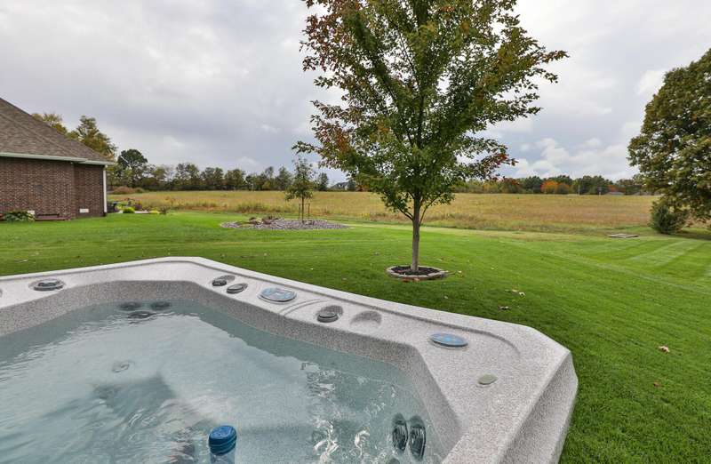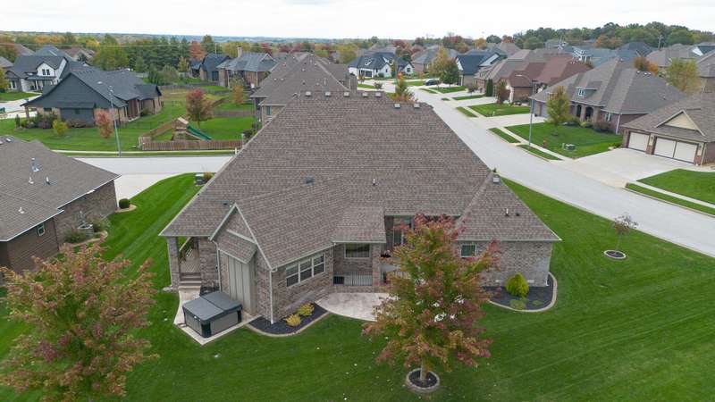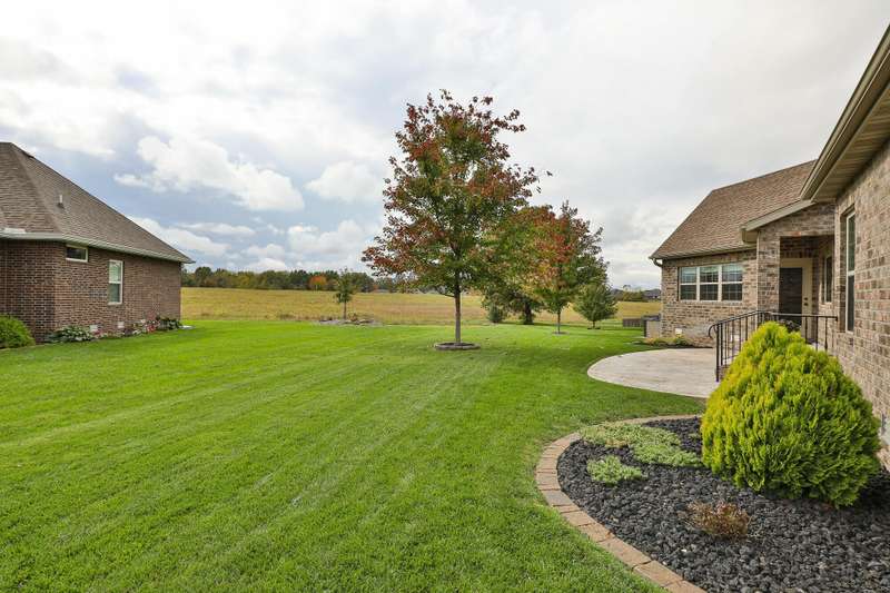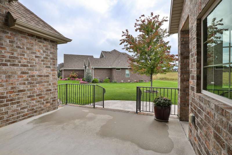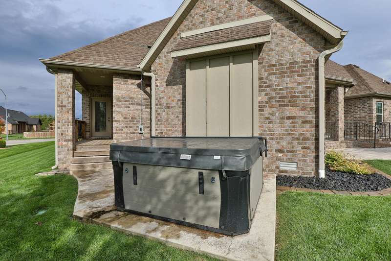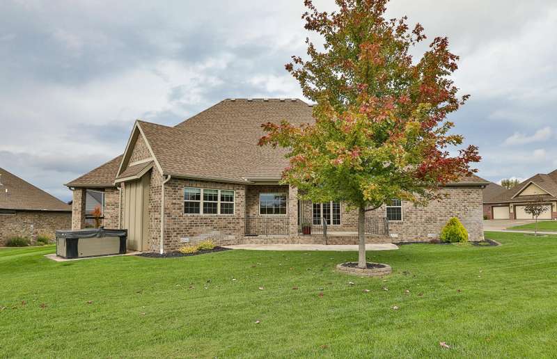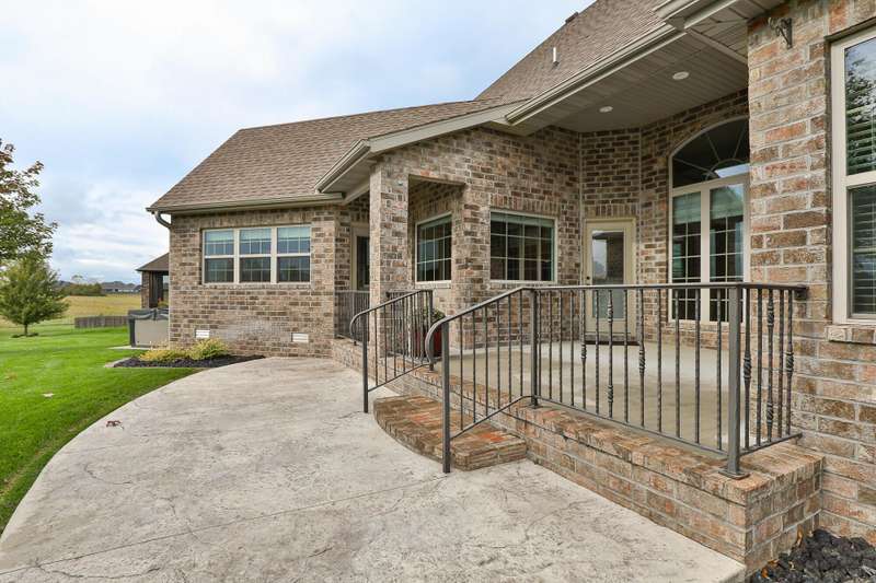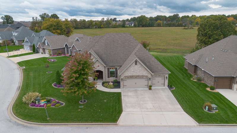 Welcome to 842 E Abbey Court in Nixa! This all brick and stone beauty sits on a large corner lot with impeccable landscaping and offers approximately 2,800 sq ft of living space, all on one level, in the highly sought-after Village of Wicklow at Roundwood community. Timeless curb appeal greets you with an elegant arched brick and stone entry leading to a covered front porch and beautiful double arched solid wood doors. Inside, you'll find two inviting living areas, a formal dining room, and a well-appointed kitchen with breakfast nook. The hearth room features a cozy gas fireplace flanked by custom wood bookcases, while the kitchen shines with striking granite countertops, GE Profile stainless appliances (including the refrigerator), a gas cooktop with pot filler, undercabinet lighting, soft-close drawers, and beautiful white cabinetry.The thoughtfully designed split bedroom layout includes four spacious bedrooms and three and a half baths. The primary suite showcases a trayed ceiling with cove lighting, an expansive walk-in closet, and a gorgeous ensuite bath with dual vanities, a large tiled shower with built-in bench, and a relaxing soaker tub. Just off the primary suite, enjoy an inviting outdoor oasis with a six-person Marquis hot tub featuring MicroSilk hydrotherapy and an automatic FROG chemical system for easy maintenance. Two bedrooms on the opposite side of the home share a roomy Jack and Jill bath with dual sinks, while a fourth bedroom enjoys its own ensuite bath, perfect for guests.The spacious laundry room, located just outside the primary suite and near the garage entry, features a soaking sink, abundant cabinetry, and generous counter space for folding. Outdoor living is a dream on the covered back deck with an extended stamped concrete patio, accessible from both the living room and kitchen--ideal for grilling and entertaining. Additional highlights include tall ceilings with detailed treatments throughout, rich engineered hardwood