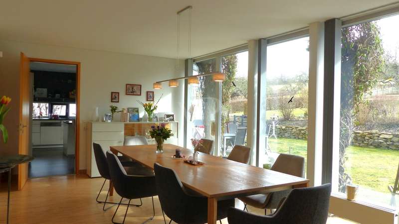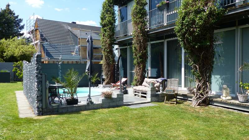 This attractive property is a modern detached house that is characterized by its upscale furnishings and energy-saving construction. The house was built in 1998 and is situated on a spacious plot of approx. 815 m². The living area extends over approx. 255 m² and offers enough space for a large family or couples with a need for space and comfort. The condition of the house is modernized after extensive renovations were completed by 2024. The floor-to-ceiling windows in the living and dining area, as well as in the south/west-facing kitchen, provide wonderful light and pleasant warmth throughout the day. For the winter months, a fireplace in the living room pampers us with its coziness and the visible fire. An installed air conditioning and ventilation system ensures a pleasant living climate even when the outside temperature is warm. Great importance was attached to quality in the interior design: The fitted kitchen presents a high-quality, modern look and is equipped with state-of-the-art appliances that make cooking and preparing meals a pleasure; floor-to-ceiling windows from the kitchen also provide access to the garden and outdoor seating area. Fine wooden parquet flooring is laid throughout the living area, giving the rooms a natural and warm atmosphere. The bathrooms are characterized by their high-quality fittings and offer functionality and comfort at the same time. Every detail has been carefully selected to meet the demands of a sophisticated living style. A particular highlight of this property is the heated pool in the garden, which can be easily accessed via the floor-to-ceiling windows in the living and dining area. This offers the opportunity to relax at any time of year and invites you to spend relaxing hours with family and friends. The garden is attractively laid out and offers plenty of space for outdoor leisure activities. An important feature of the house is its low-energy construction. This not only ensures a pleasant living climate, but also low operating costs in terms of energy consumption. The combination of modern technology and traditional architecture makes this property a contemporary and future-proof place to live. The room layout of the house is well thought-out and functional. Large windows allow plenty of daylight into the rooms, creating bright and inviting spaces. The open-plan living and dining area forms the heart of the house and flows seamlessly into the kitchen, which is particularly suitable for social gatherings. The surrounding area offers a good infrastructure with nearby shopping facilities, schools and public transport connections, ensuring daily needs and convenience. The quiet location in a mature residential area guarantees privacy and relaxation after a hectic day. If you are looking for a modern detached house with upscale furnishings and a focus on sustainability, then this property could be just right for you. This property combines sophisticated living with a cozy atmosphere and is ready to offer you a new home. Arrange a viewing today to see the benefits of this property for yourself.
