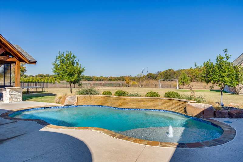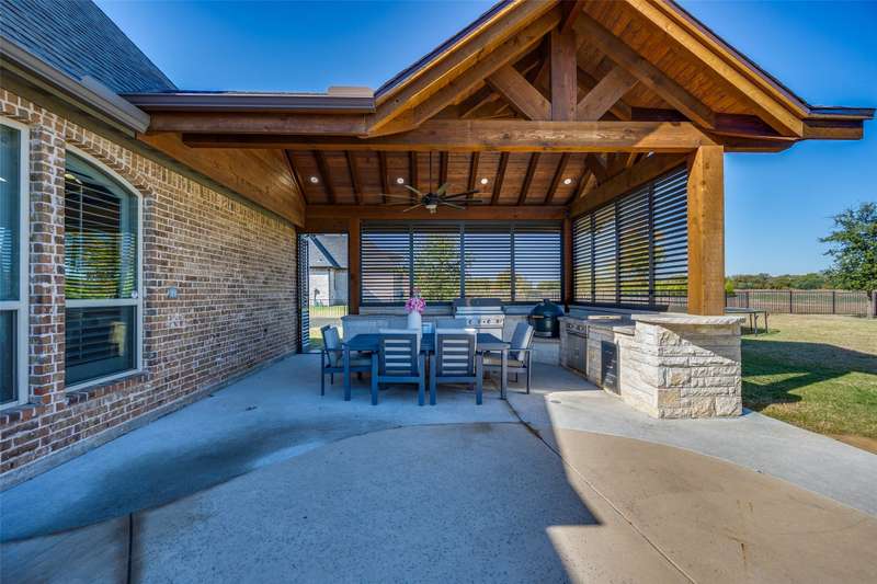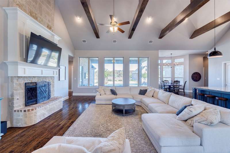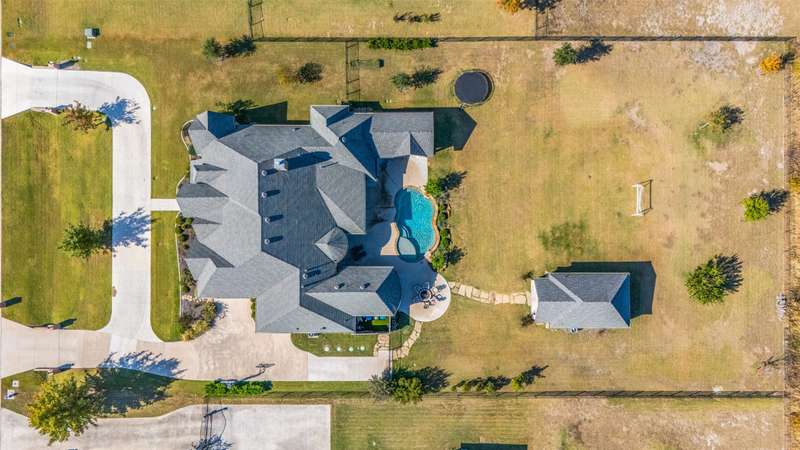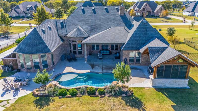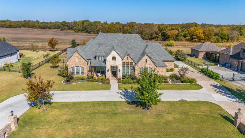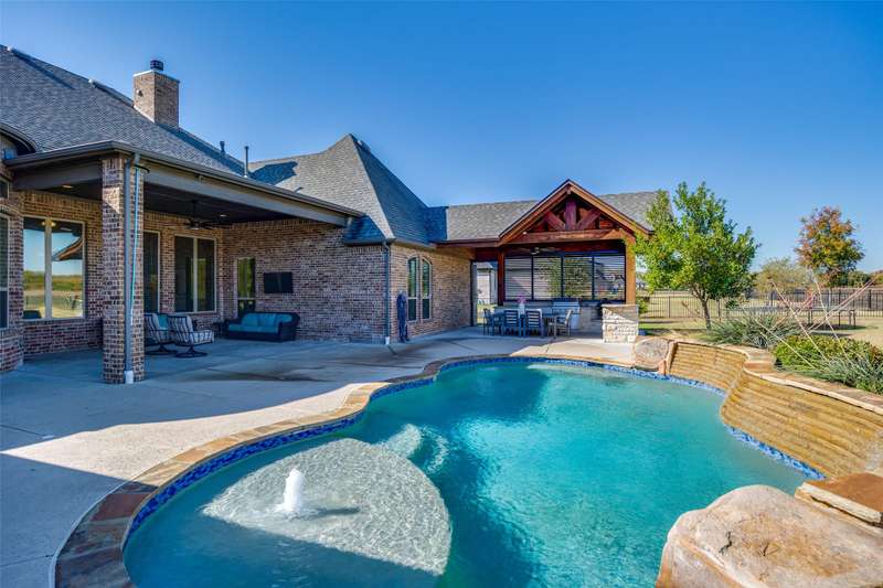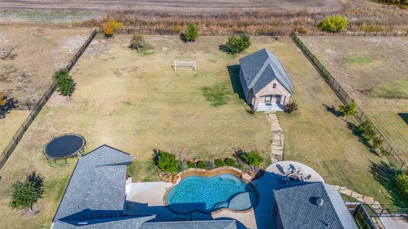 This exceptional one-story home offers 4,253 sq. ft. of elegant living space plus a 600 sq. ft. detached suitebringing the total livable area to 4,853 sq. ft. The private suite includes a full bath and kitchenette, making it ideal for guests, in-laws, or a home office.Inside, rich hand-scraped hardwood floors, exposed ceiling beams, plantation shutters, and a custom wood accent wall add warmth and character throughout. The gourmet kitchen is a true centerpiece, featuring an oversized island, double ovens, abundant cabinetry, and seamless flow into the spacious living and dining areas with large windows overlooking the backyard oasis.A dedicated study, formal dining room, and versatile game or media room provide flexible spaces for work and play. The secluded primary suite offers a relaxing retreat, while secondary bedrooms include a Jack-and-Jill bath and a private ensuite.Step outside to enjoy a backyard designed for Texas livingcomplete with a covered patio, full outdoor kitchen, dining area, resort-style pool with waterfall feature, and cozy fire pit. Additional highlights include a 3-car garage with epoxy floors and an EV charging station.Located in desirable Parker, TX, this home perfectly blends country serenity with convenient access to city amenities.