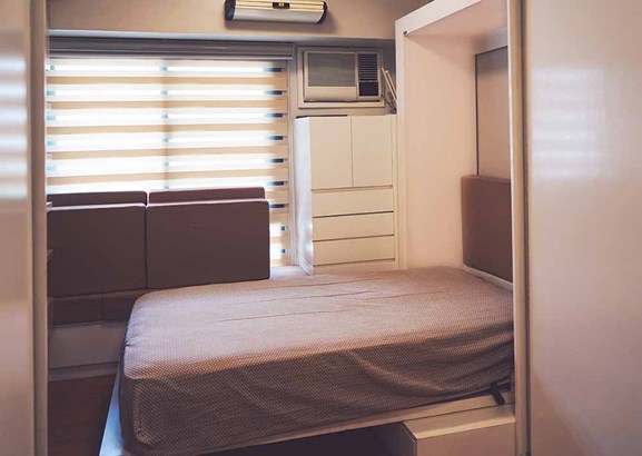 The studio unit for sale is located on the South Building of Flair Towers. This semifurnished studio unit faces the amenities area. Flair Towers is a two-tower condo high-rise project of DMCI Homes. It is located at the corner of Reliance and Pines Streets in Mandaluyong, approximately 50 meters from EDSA. This development is approximately 1 kilometer away from Ortigas Center. Inclusions: Modular cabinets that convert into chairs; Murphy bed (which, when folded, reveals modular chairs); Lots of storage space: with cabinets above the entertainment area, under the bed, under the seats, above the washing machine area, inside the toilet room, and closet for clothes and shoes; Stainless steel organizers (for the kitchen and toilet); 1.5 HP Panasonic ACU with remote; Two-burner Elba stove and Elba range hood; Above-bed retractable clothes line (which looks like a split-type ACU); All installed LED lights (3 circular lights plus LED strip); Door stopper, peephole, additional lock.