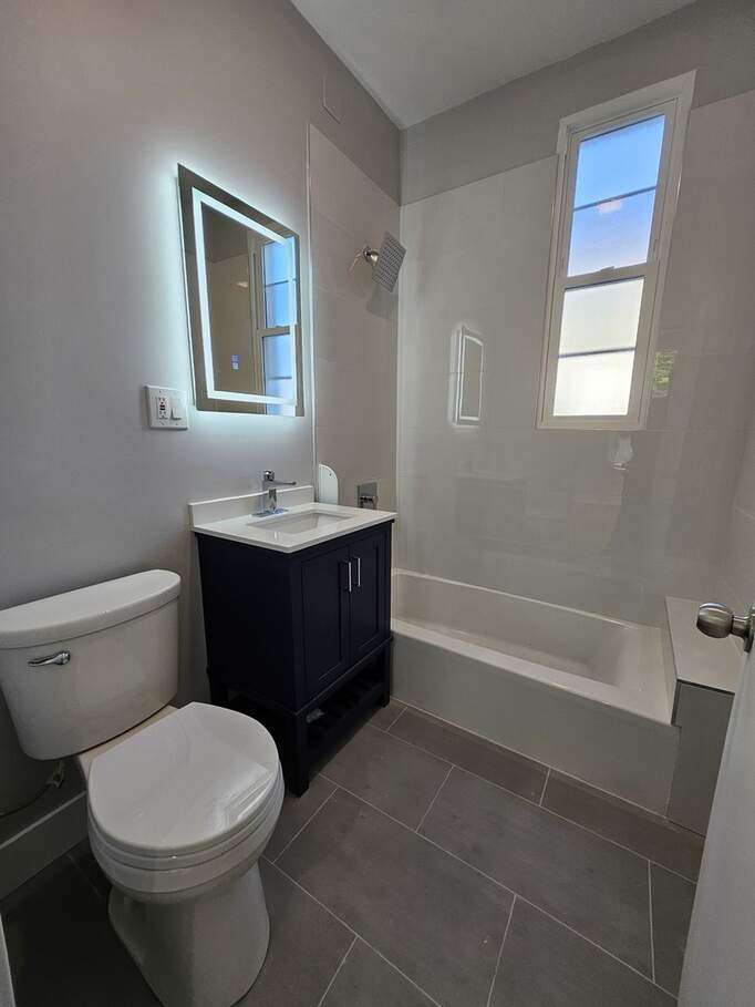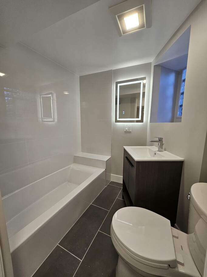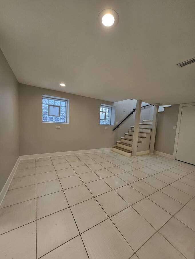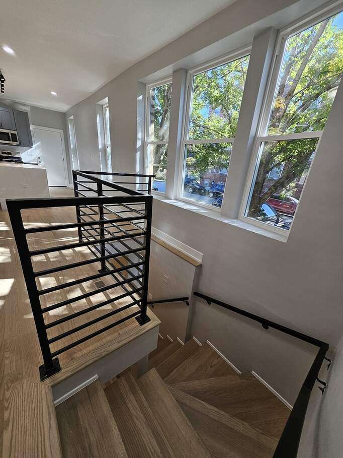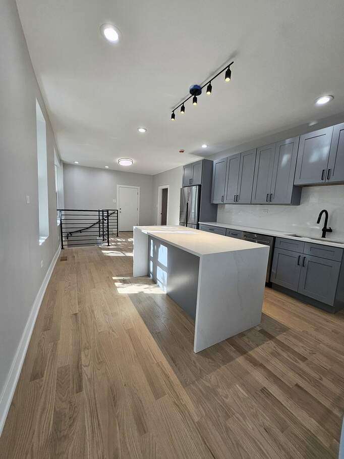 Sun-drenched New Construction 3bed/2bath duplex down. This corner unit was just gut renovated with designer finishes. Main floor features open floor plan w Kitchen opening up to dining. Kitchen features oversized island with waterfall Calcutta quartz counters, gray cabinets with soft close features, tons of storage and pantry area. Full stainless steel appliances including dishwasher. 2 large bedrooms on main floor with ample closet space and sunlight. Main floor has hardwood floors. Lower level features family/living room and large storage closet. Additional 3rd bedroom, full sized bathroom and laundry center with storage also located in lower level. Large fully enclosed metal porch in rear of unit perfect for grilling. Includes Central AC/Heat and in unit side by side Washer/Dryer. 2 parking spots included in rear of building. Available 11.1