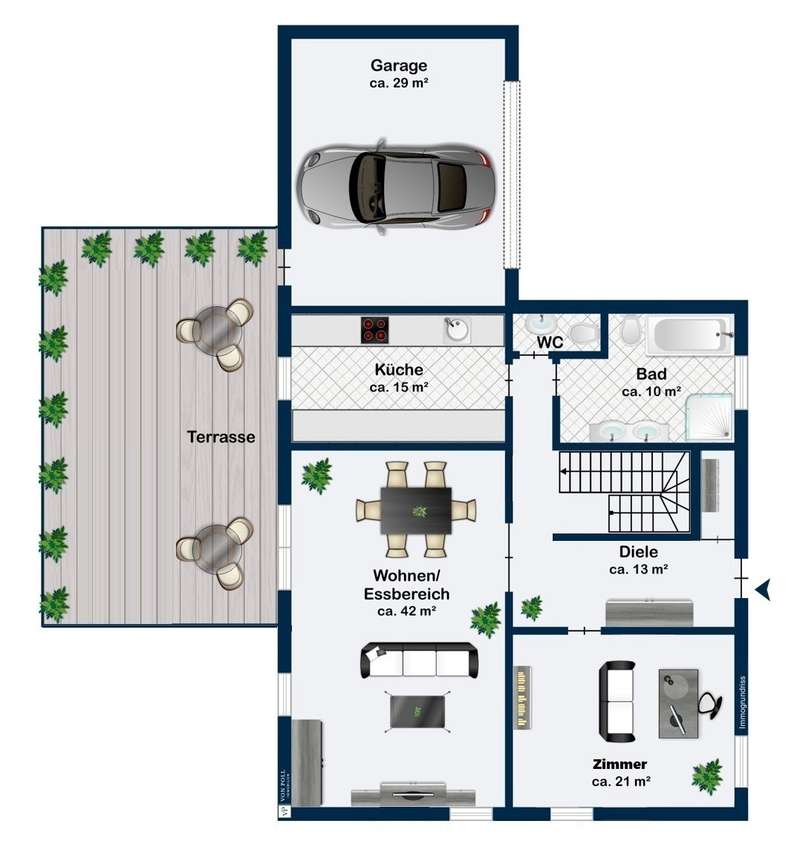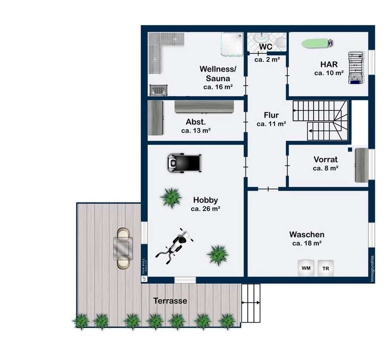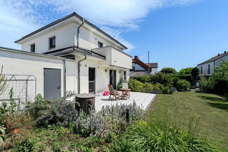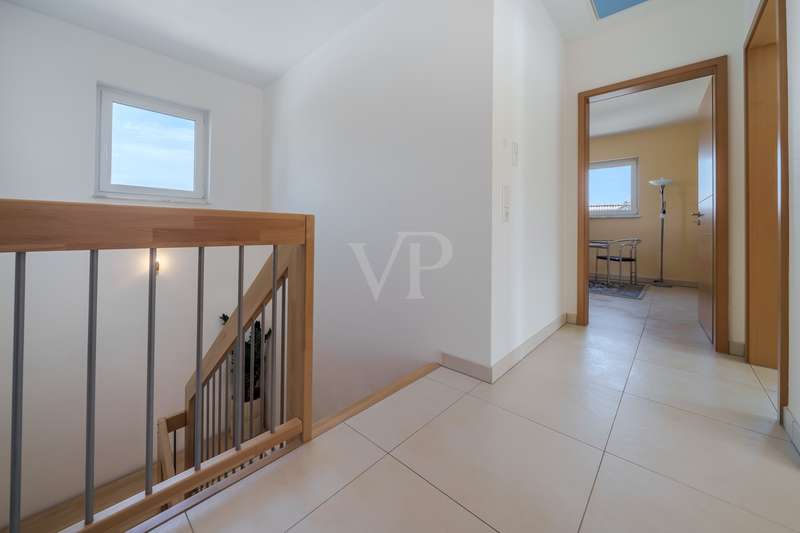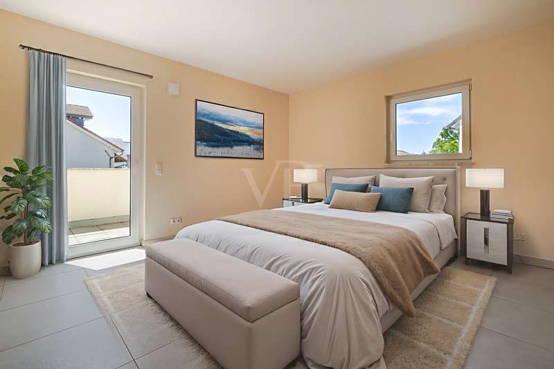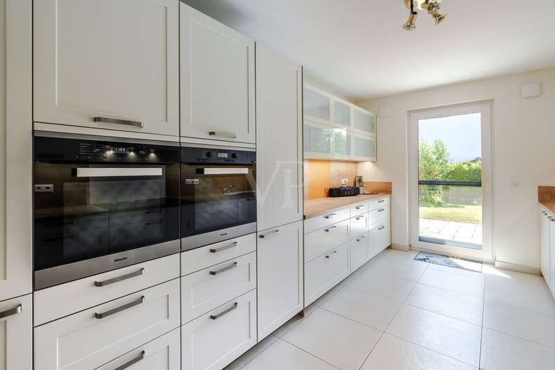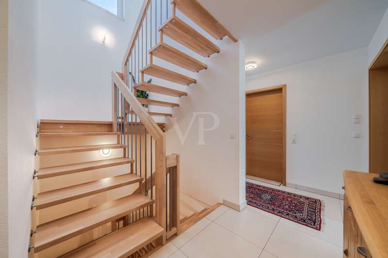 In one of the most sought-after residential areas of Usingen, this as-new detached house presents itself as a harmonious combination of timeless architecture, high-quality fittings and well thought-out functionality. Surrounded by manicured greenery and a quiet neighborhood, this property offers a living environment for people with high standards of comfort, design and sustainability. The generous living space of approx. 217 m² is spread over six light-flooded rooms, offering a stylish home for both discerning couples and families with plenty of space. The specified hobby room in the basement currently counts as usable living space and is included in the specified living space together with the proportionate terraces and the proportionate balcony. The open-plan living/dining area with floor-to-ceiling windows and direct access to the partially covered south-west-facing terrace forms the communicative heart of the house. Generosity, brightness and the flowing transition to the garden create an exclusive living atmosphere with a view of the greenery. The high-quality fitted kitchen with brand-name electrical appliances impresses with its well-kept condition and direct access to the outside - perfect for relaxed moments in convivial company. Designed with senior citizens in mind, the first floor offers a future-oriented living solution with wide door frames, a floor-level shower in the daylight bathroom and a ground-level entrance area. The upper floor accommodates three spacious bedrooms - two of which have access to the sunny balcony - as well as a stylish bathroom with a floor-level shower and a bathtub. A further bathroom on the first floor underlines the exceptional living comfort on both levels. In the basement, you will find a versatile work or hobby room and an exclusive wellness area with integrated sauna and splash shower - a retreat for peace and regeneration within your own four walls. The lovingly landscaped garden impresses with its well thought-out design and technical sophistication: An automatic irrigation system with cistern and an electric awning ensure comfort and ease of maintenance. This property also meets the highest energy standards: equipped with an air-to-water heat pump, controlled living space ventilation with heat recovery, a photovoltaic system and a solar system for hot water support, the house meets the KfW 55 standard and achieves energy efficiency class A+. A wallbox for electric vehicles and a fiber optic connection complete the future-proof features. The property is in an extremely well-kept condition and is ready to move into at short notice by individual arrangement. A large garage and three additional outdoor parking spaces round off this exclusive offer. We would be delighted to invite you to a personal viewing - experience the stylish living ambience and the special quality of this exceptional home on site.