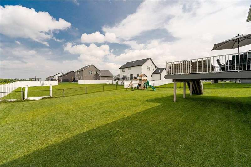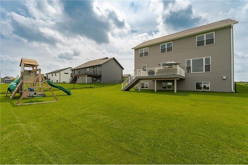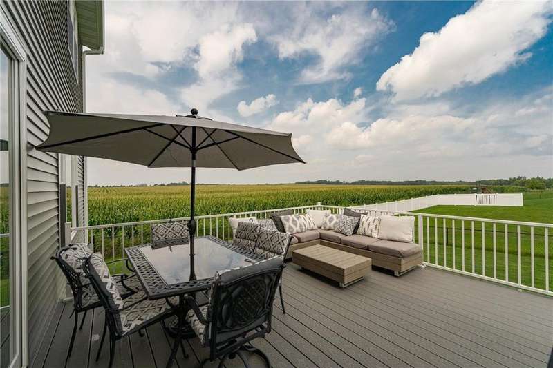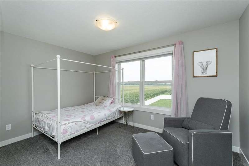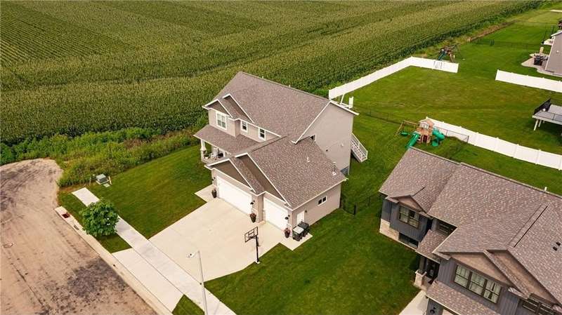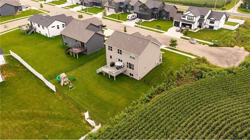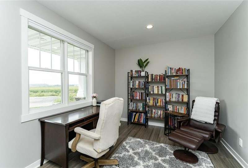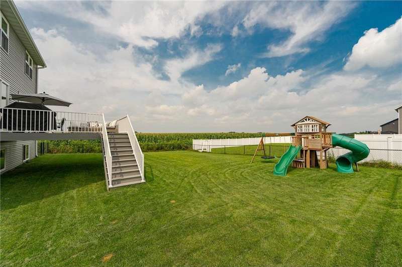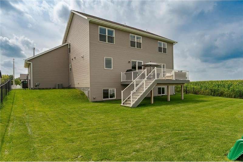 This stunning 5-bedroom, 4-bath home sits at the very end of a quiet road, offering picturesque views of open farmland. Step inside to a spacious, open floor plan featuring a large foyer, dedicated office, and a light-filled living room with expansive windows and a cozy gas fireplace. The dining area opens to a deck that overlooks the fenced backyard and farmland to the west—perfect for enjoying breathtaking sunsets. 4 bedrooms on the upper level, the primary is spacious with it's own private bathroom, walk-in shower and closet this home is designed for both comfort and functionality. The kitchen is bright and offers a large island with seating, generous pantry, and abundant cabinet space. A convenient laundry/mudroom leads to the finished, heated garage. The lower level boasts daylight windows, a second gas fireplace in the expansive family room, a fifth bedroom, a full bath, and ample storage space. Nice flat yard with irrigation system, located near a city park, shopping, restaurants, bus lines, and medical facilities, this home offers the perfect blend of peaceful living and everyday convenience.