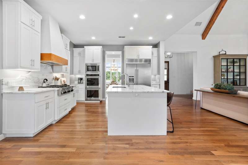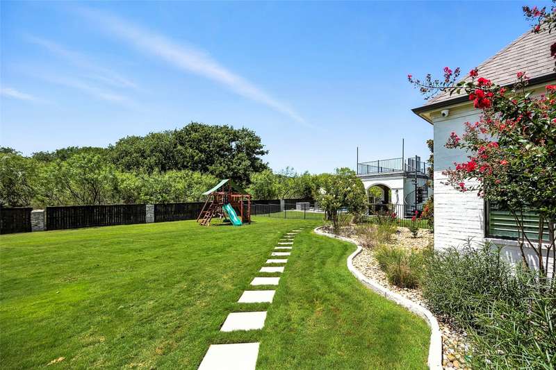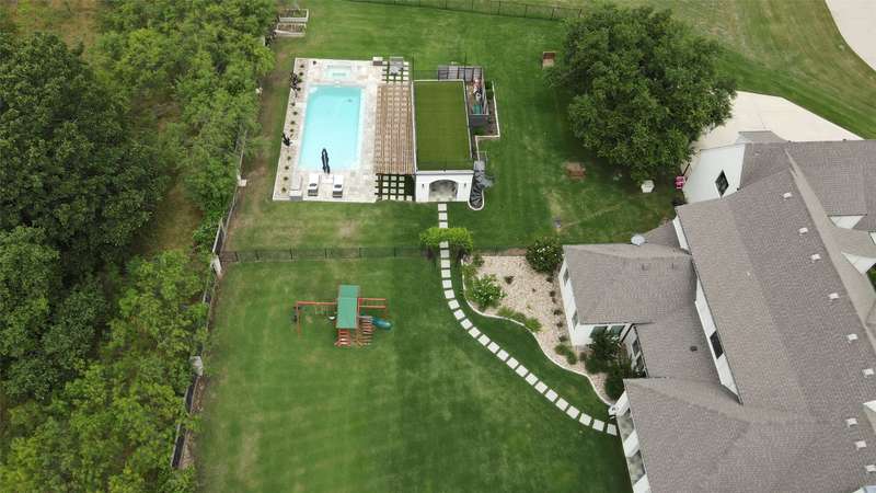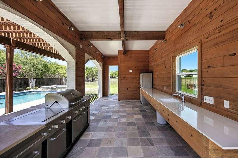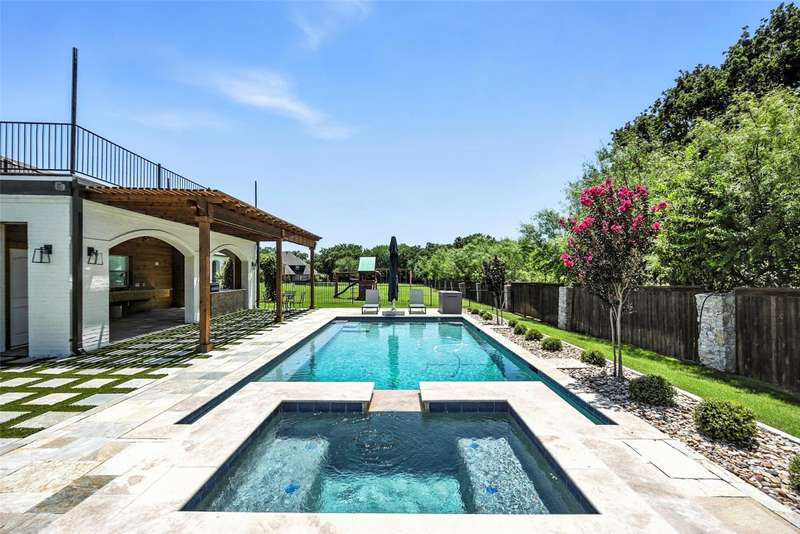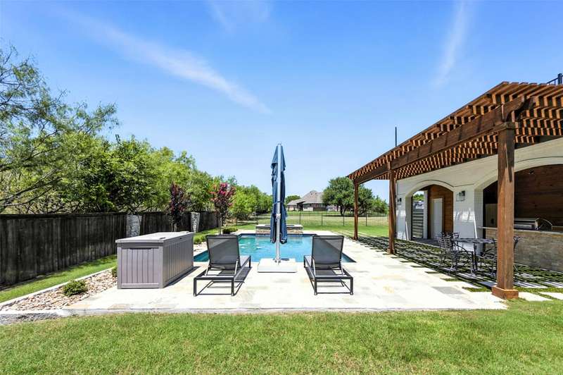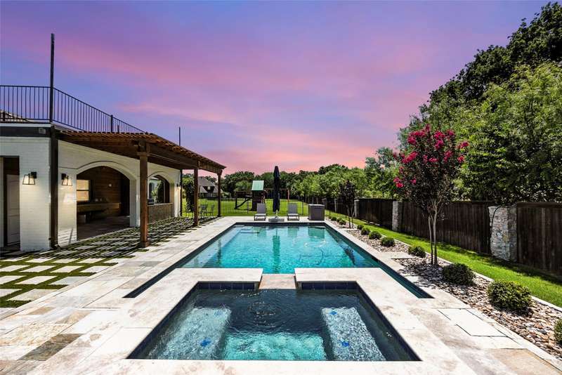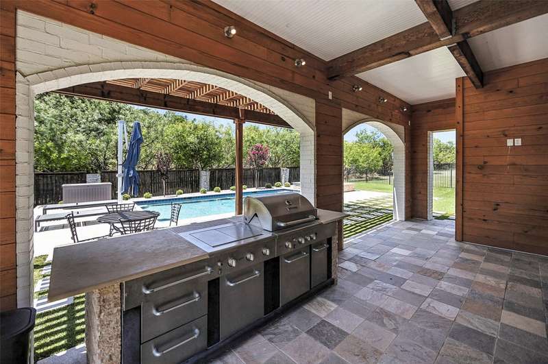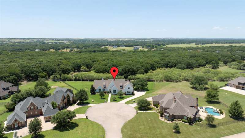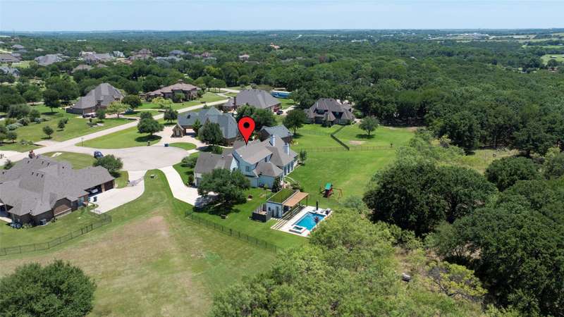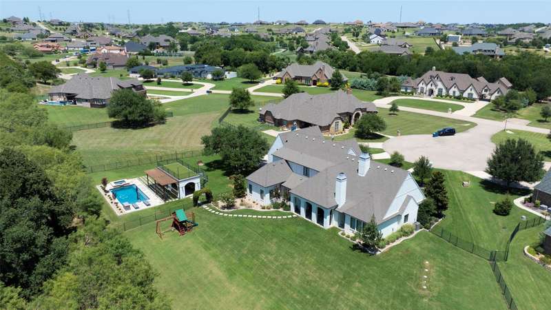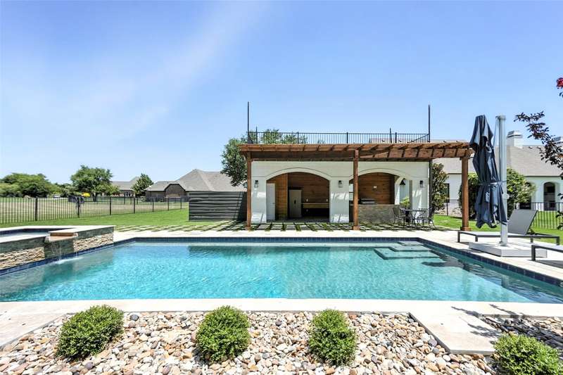 Exquisite 6-bedroom home in the prestigious guarded and gated Bella Flora community, served by the highly acclaimed Aledo ISD. Perfectly positioned in the heart of a cul-de-sac, this residence sits on a huge, privately fenced pie-shaped lot with breathtaking views and a resort-style backyard.The heart of the home is the elevated chefs kitchen, designed for both beauty and function. White marble countertops stretch across a large center island, perfect for gathering and entertaining. A gas stove, double oven, double pantry, and abundant custom cabinetry provide exceptional storage and cooking capability. The open layout flows seamlessly into the expansive living room, where vaulted ceilings, rich wood floors, and a wall of windows create a bright and inviting atmosphere, showcasing backyard and pool views. Plantation shutters throughout add elegance and light control.The first floor also includes a luxurious primary suite with spa-inspired bath, private office, media room, a second ensuite bedroom, and a formal dining room with custom built-ins, making it ideal for entertaining. Upstairs offers a spacious bonus room, two bedrooms sharing a Jack-and-Jill bath, and a third bedroom with a private ensuite. Step outside to your personal paradise, beginning with the expansive private backyard inviting hours of playtime! Step over to the stunning pool and spa with pergola, open-air pool house with outdoor kitchen and half bath, rooftop deck, and multiple areas for lounging or dining. Whether hosting a crowd or enjoying quiet sunsets, this home delivers elegance, comfort, and true indoor-outdoor living. See disclosures for more information. 6th bedroom used as media room.